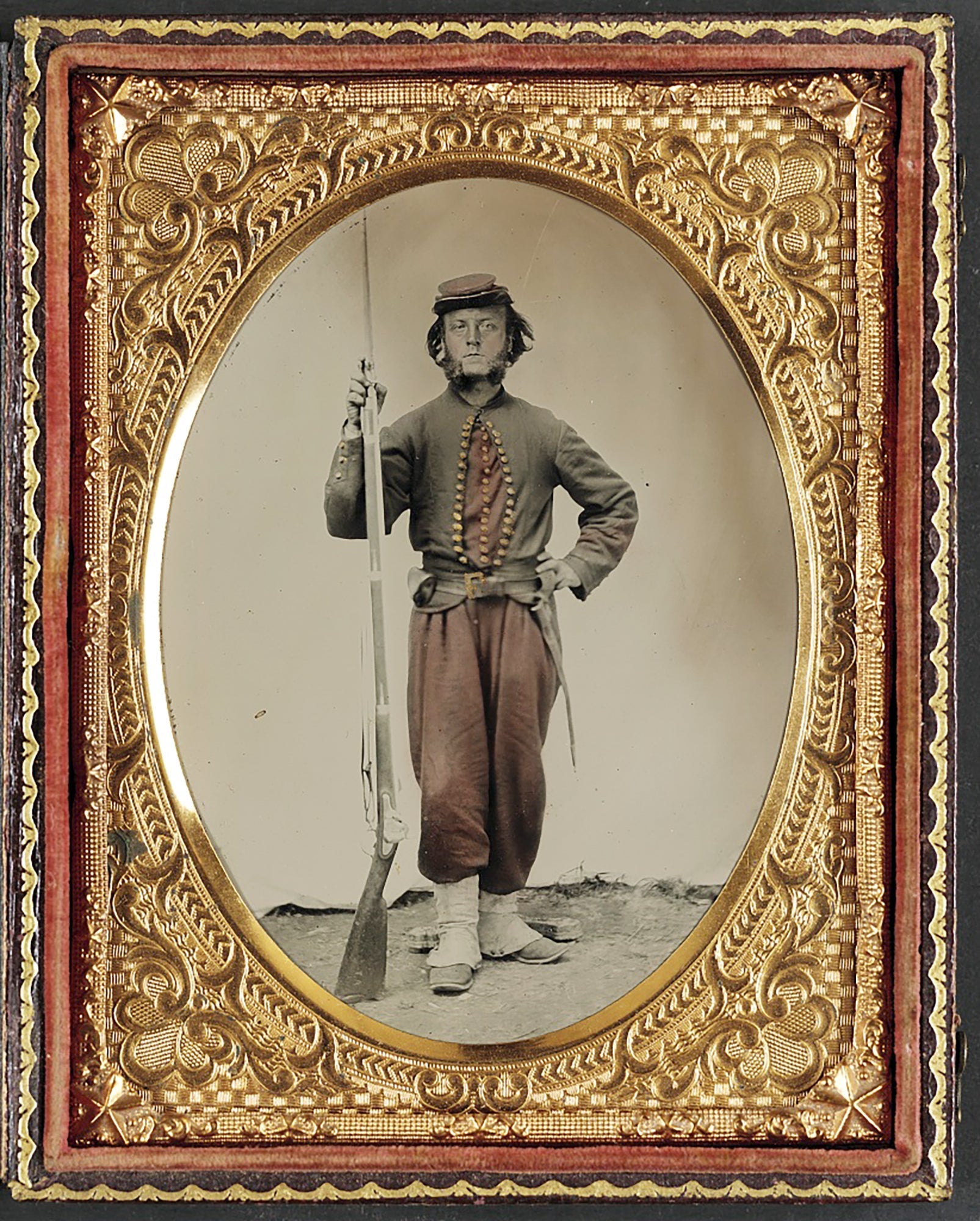 The trousers worn by the 14th were very similar to that of the Zouave pantaloons, the only difference being that they were not as baggy as the Zouave pantaloons. The color was a vibrant red color. At the bottom of the trousers the 14th wore gaiters or leggings with seven gold buttons on each gaiter symbolizing the number 14.