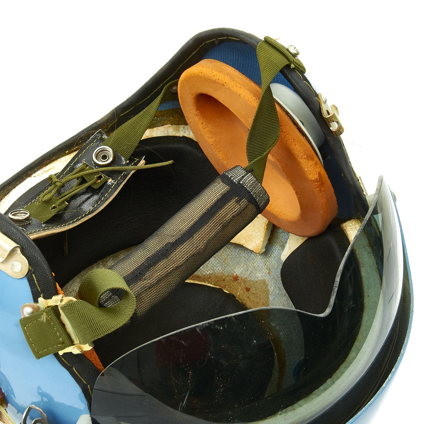 Meanwhile, several events occurred that had an effect on China’s search for appropriate protective headgear for its MiG-17 (Shenyang J-5 two seat version) and MiG-19 (Jianjiji F-6) pilots. In 1963, a Taiwanese Nationalist pilot flying the NAA F-86F Sabre defected to China. His American issued P-4A flight helmet was soon passed along to Chinese flight test personnel for detailed evaluation and analysis. The results of this close scrutiny of American hard protective helmet technology played a significant part in Chinese plans to develop their own protective hard helmet.