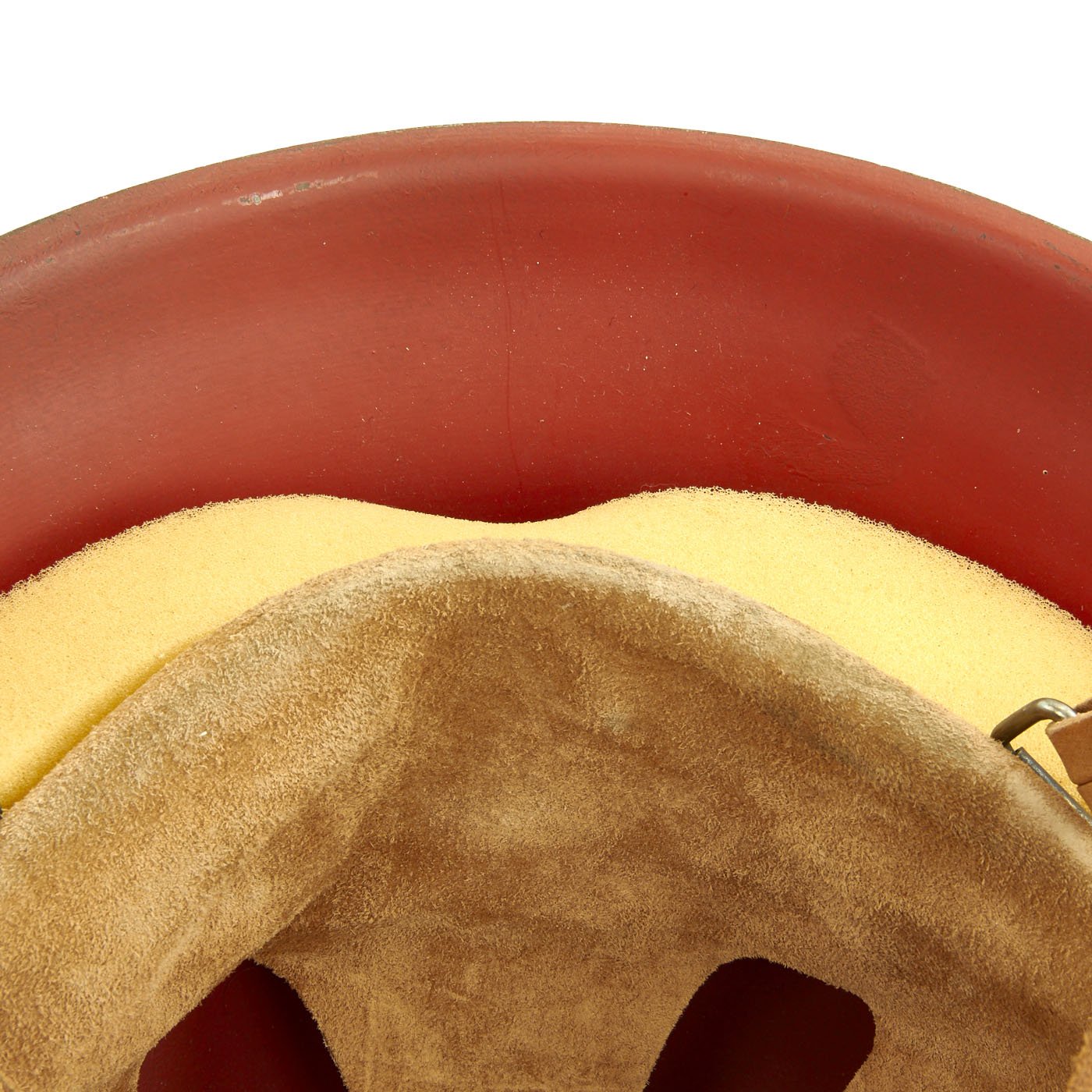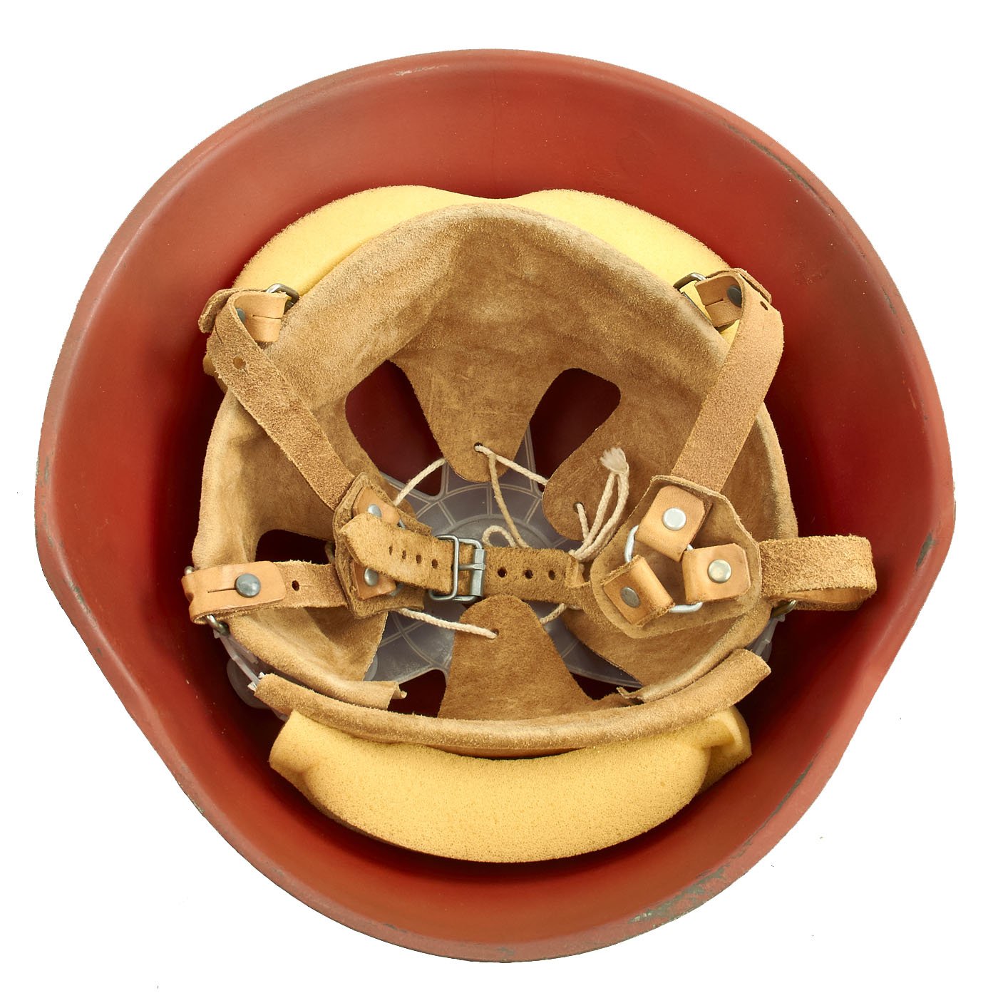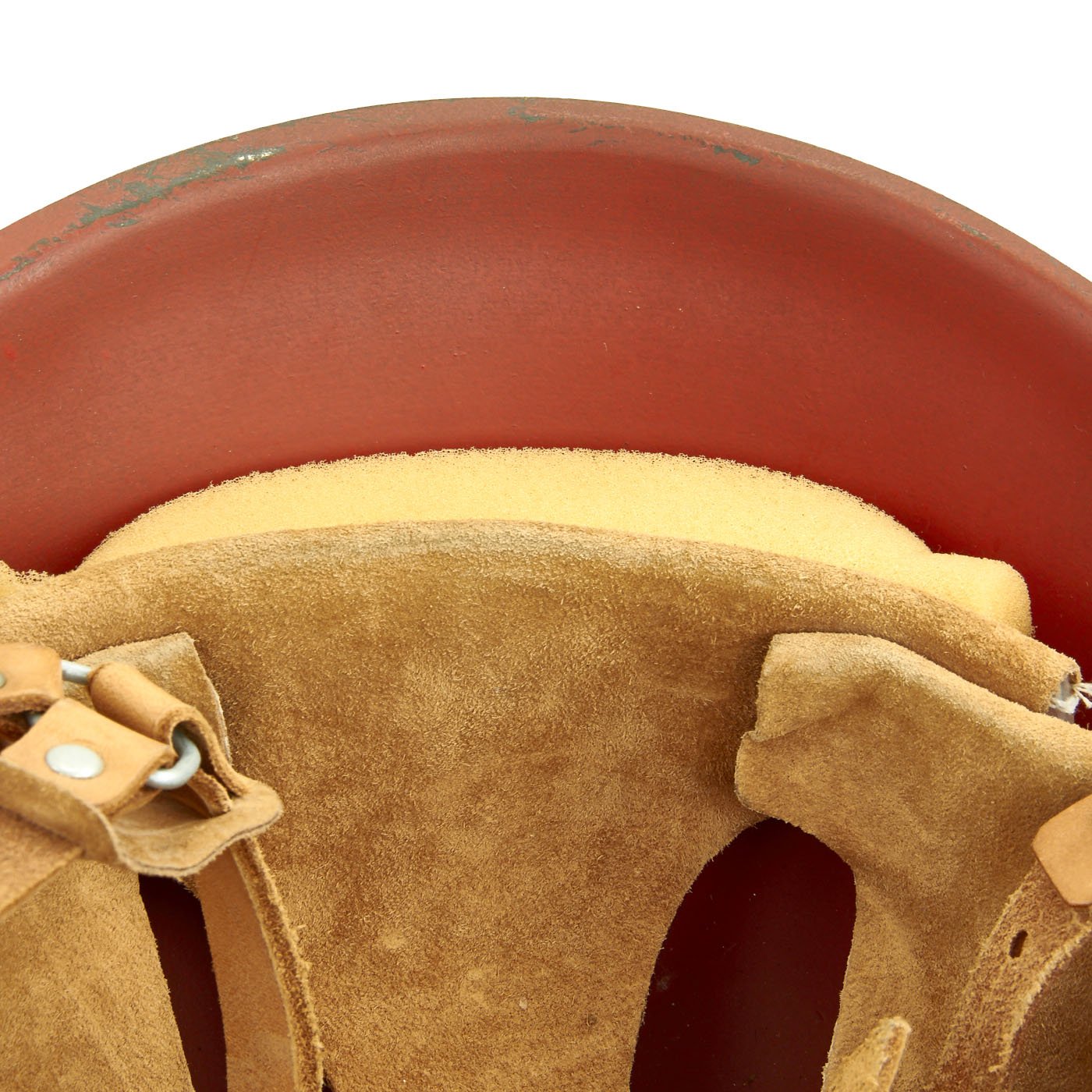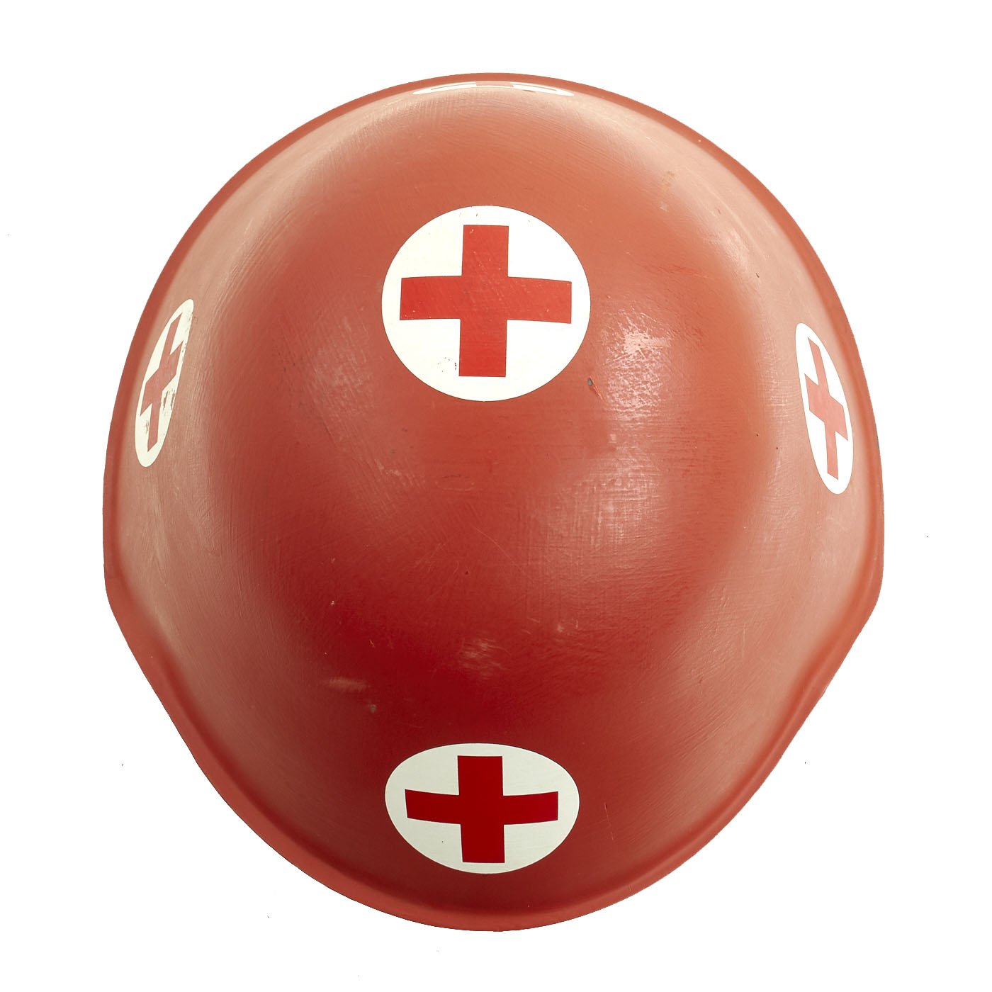 This is a very nice example, which has been painted red, with added Medic "Red Cross" symbols on all 5 sides of the shell. It looks to be faintly marked U / 8 / 87 over the left ear inside the shell, which means it was most likely produced in 1987, as these were in production up until the re-unification of Germany. The helmet is in the correct 3rd model configuration, introduced in 1976, which features a simplified liner with a plastic support frame and foam rubber padding.