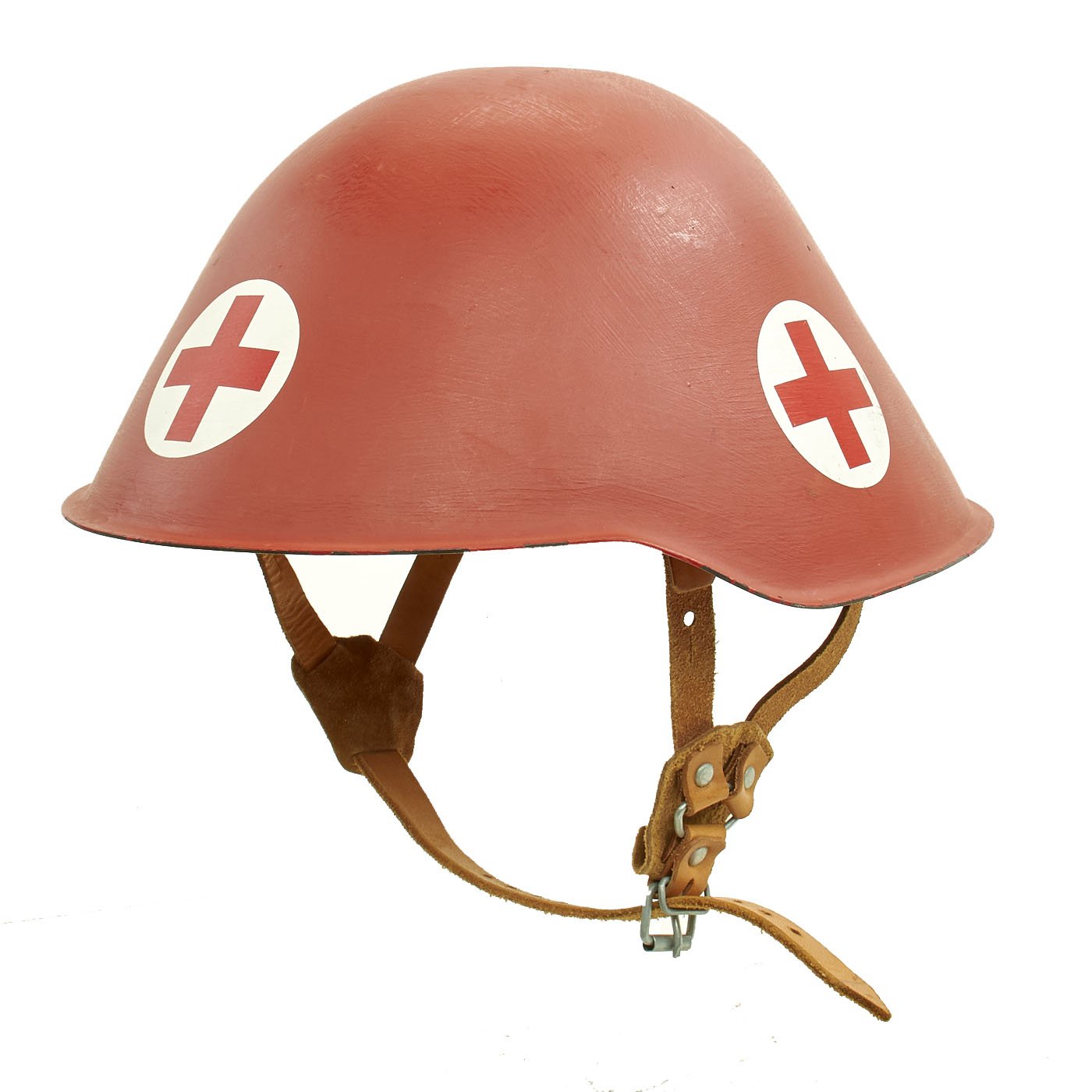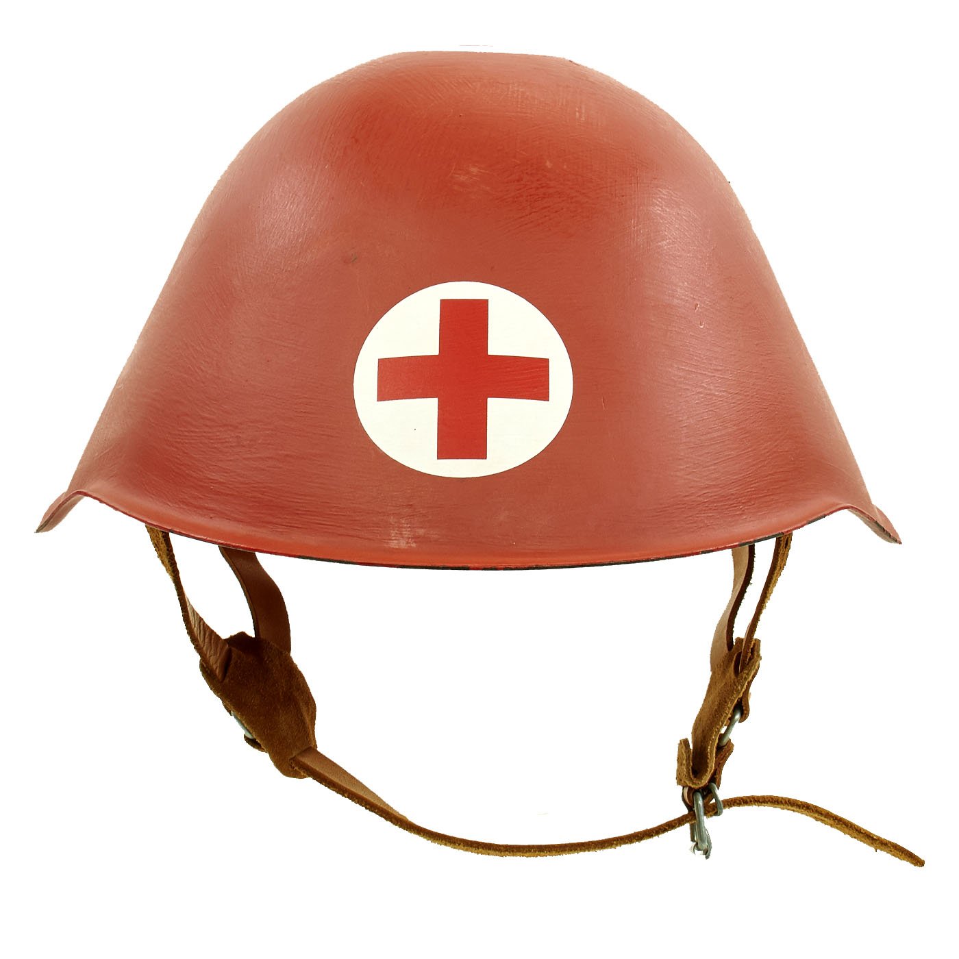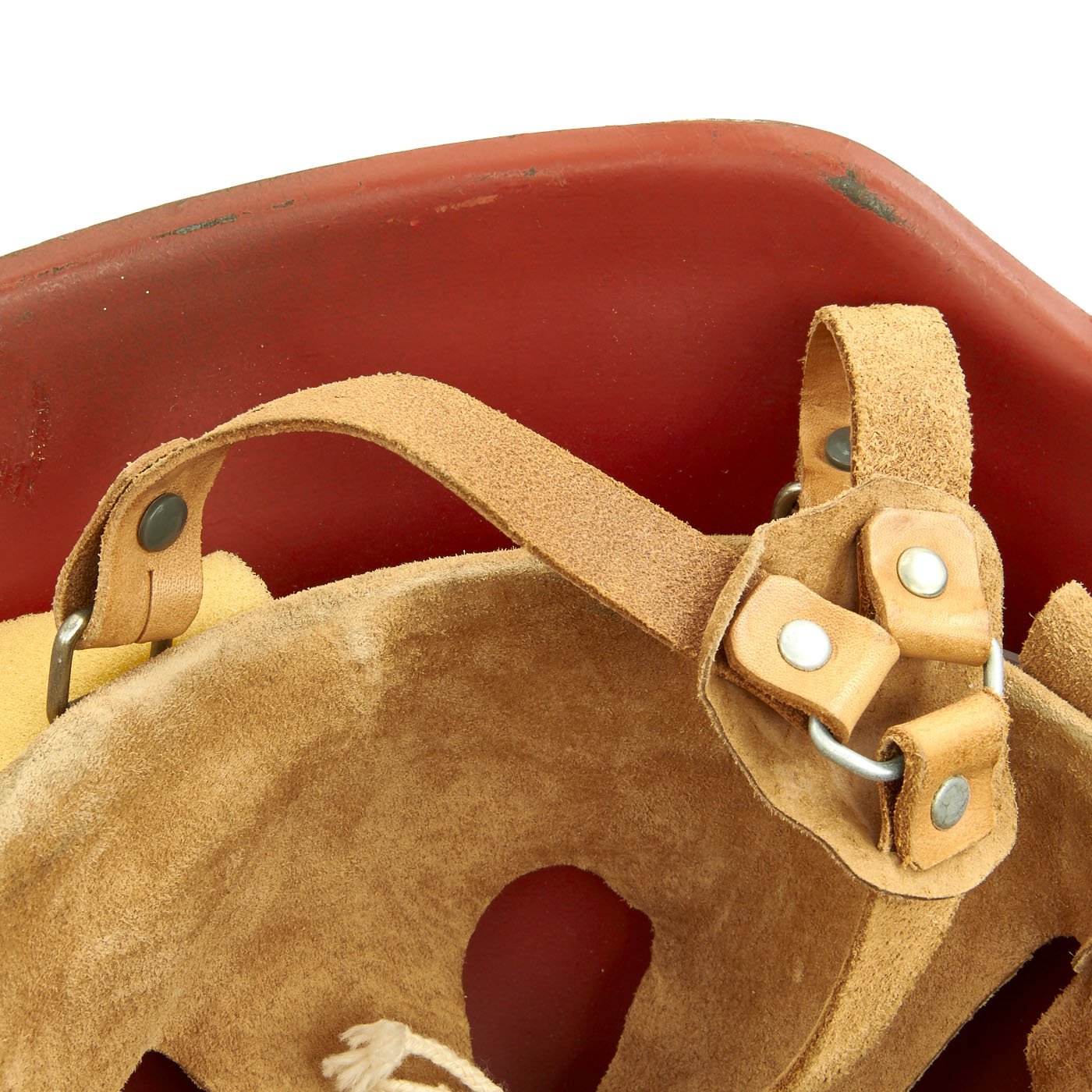 This is a very nice example, which has been painted red, with added Medic "Red Cross" symbols on all 5 sides of the shell. It looks to be faintly marked U / 8 / 87 over the left ear inside the shell, which means it was most likely produced in 1987, as these were in production up until the re-unification of Germany. The helmet is in the correct 3rd model configuration, introduced in 1976, which features a simplified liner with a plastic support frame and foam rubber padding.
