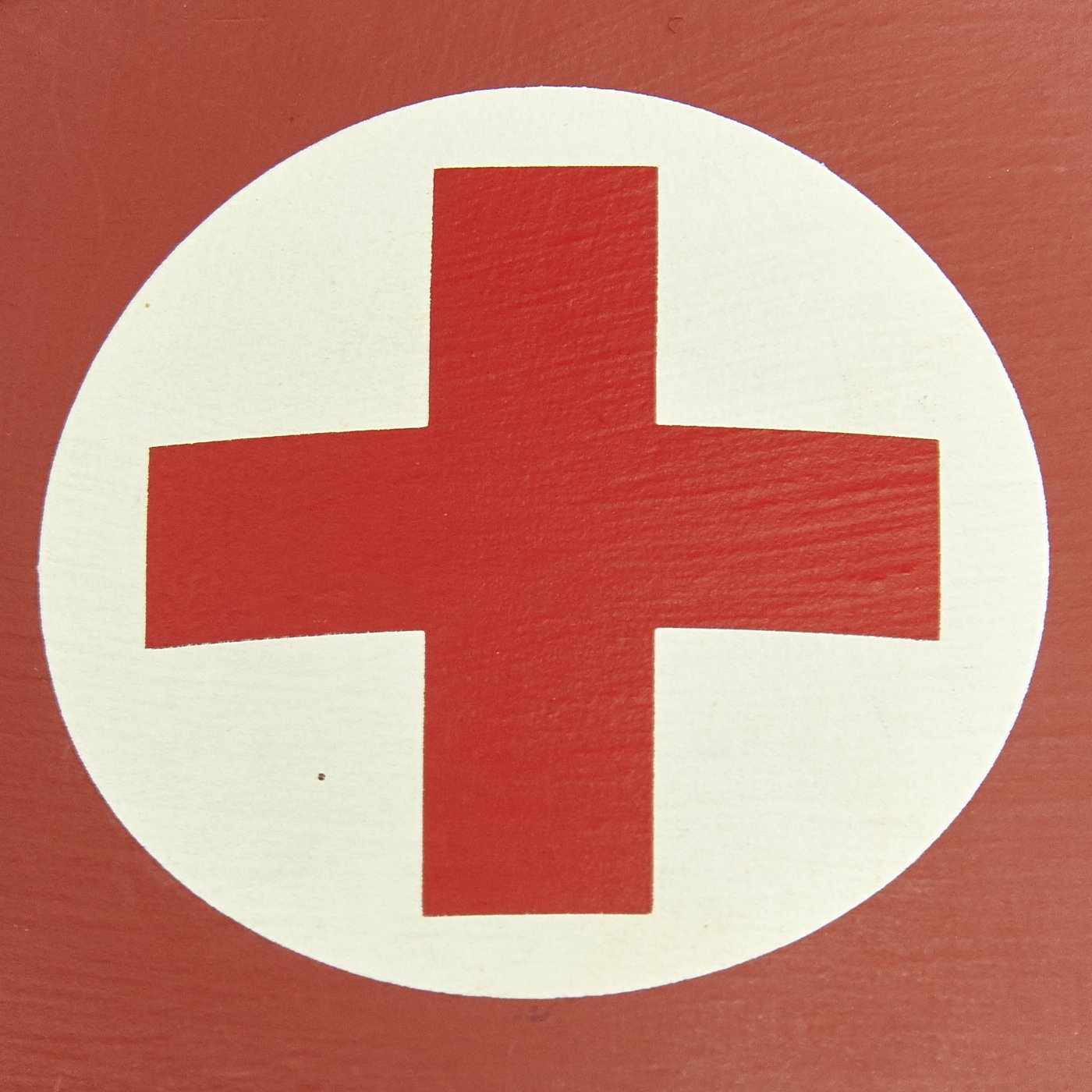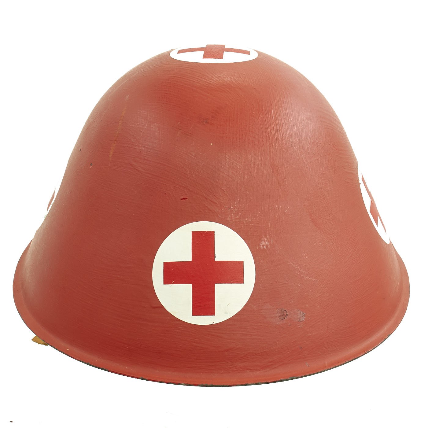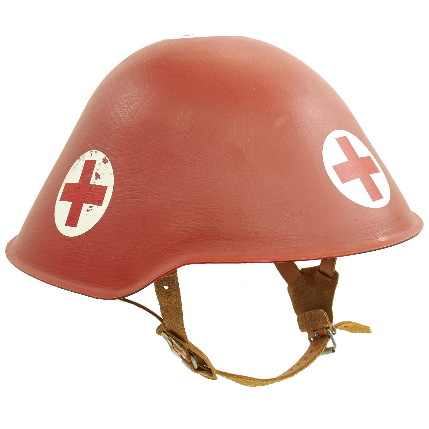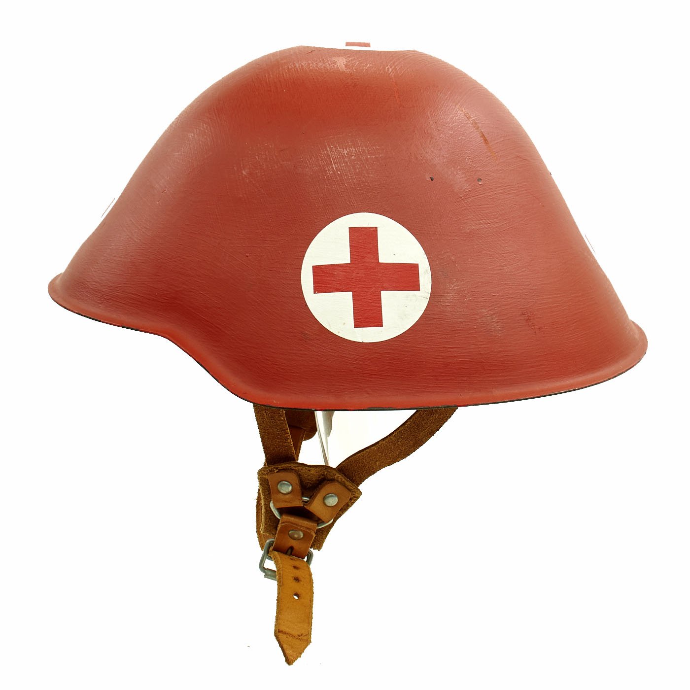 This is a very nice example, which has been painted red, with added Medic "Red Cross" symbols on all 5 sides of the shell. It looks to be faintly marked U / 8 / 87 over the left ear inside the shell, which means it was most likely produced in 1987, as these were in production up until the re-unification of Germany. The helmet is in the correct 3rd model configuration, introduced in 1976, which features a simplified liner with a plastic support frame and foam rubber padding.
