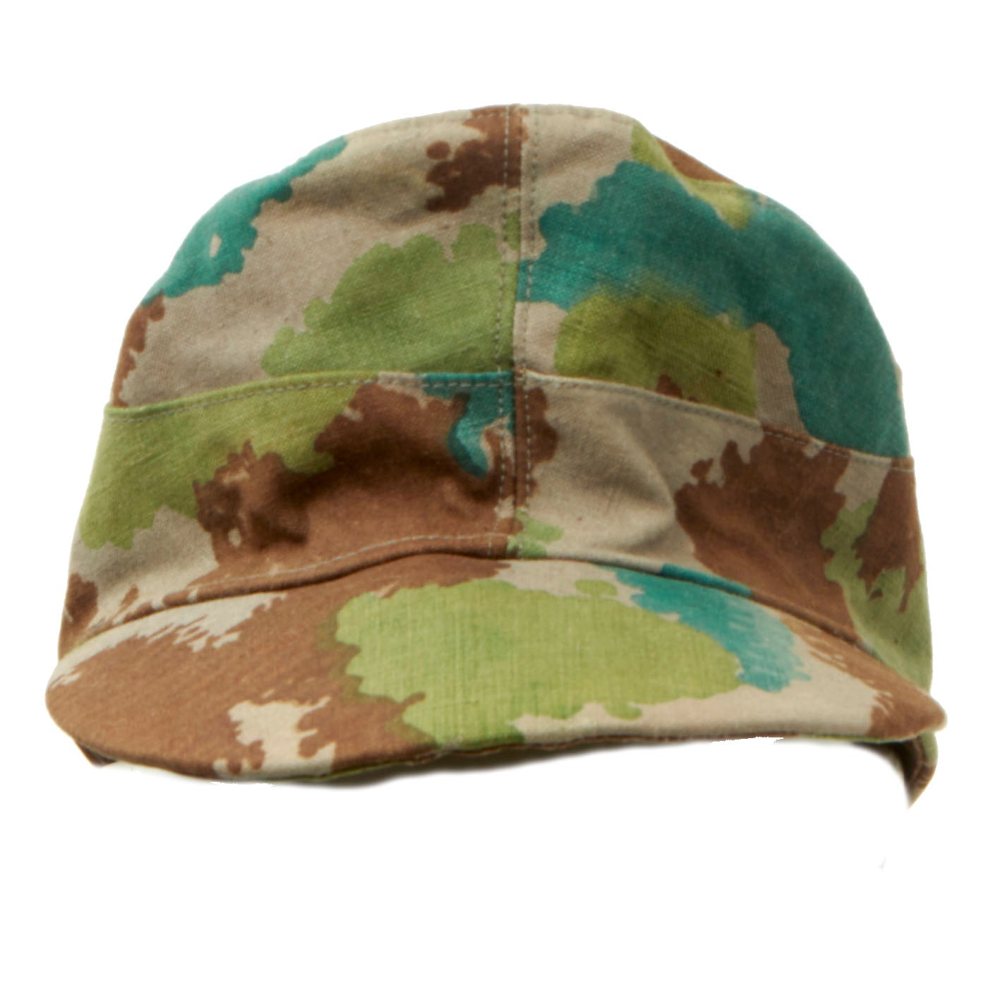 The M58 Flächentarn pattern was issued between 1956 and 1967 to units in the East German Army (NVA) and Ministry of Interior (MDI). Also nicknamed “Kartoffelmuster” (potato camouflage) or “Blumentarn” (flower camouflage), the pattern generally consists of blue-green, olive green & brown ragged blotches on a field grey background. Several mild color variations have been documented, some of which may appear darker due to their having been coated in anti-gas chemicals (which also gave the fabric a waxy texture). Several types of jacket, trousers, field equipment, shelter half and hood/helmet cover were produced in this pattern.