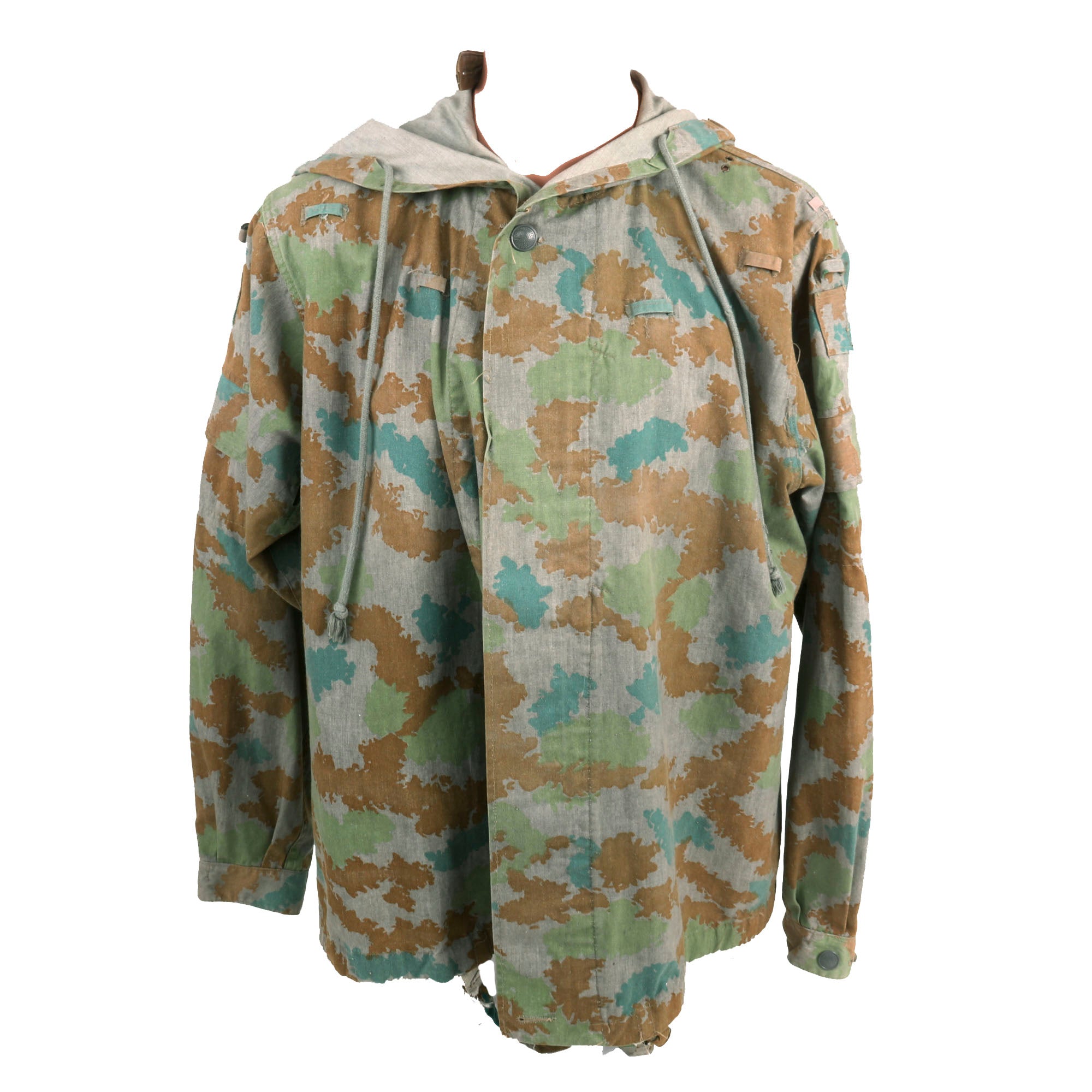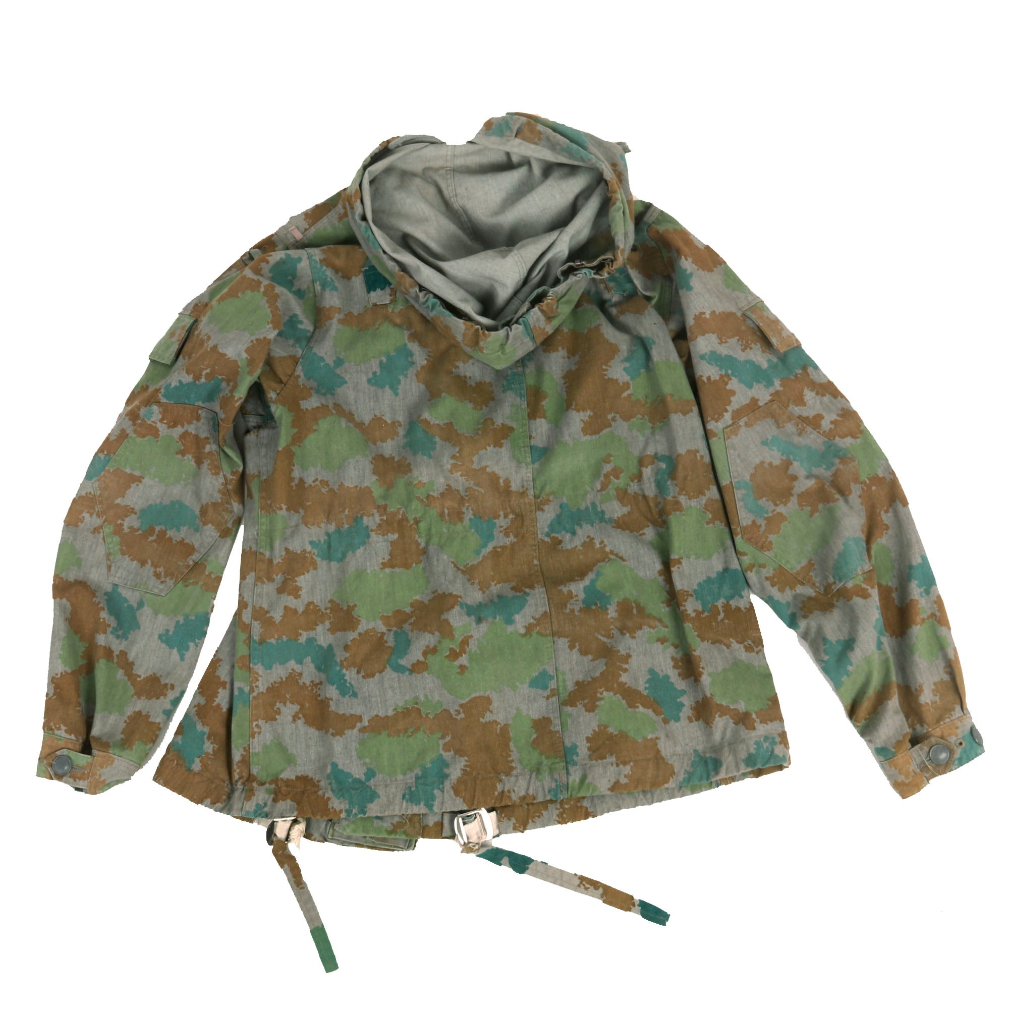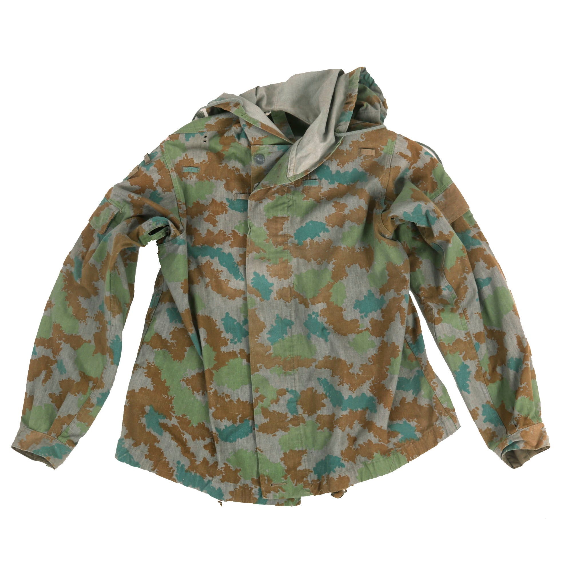 The M58 Flächentarn pattern was issued between 1956 and 1967 to units in the East German Army (NVA) and Ministry of Interior (MDI). Also nicknamed “Kartoffelmuster” (potato camouflage) or “Blumentarn” (flower camouflage), the pattern generally consists of blue-green, olive green & brown ragged blotches on a field grey background. Several mild color variations have been documented, some of which may appear darker due to their having been coated in anti-gas chemicals (which also gave the fabric a waxy texture). Several types of jacket, trousers, field equipment, shelter half and hood/helmet cover were produced in this pattern. These were a specialized item of issue originally. The camouflage combat suit was intended to be worn over the regulation service uniform. This two piece Blumentarn pattern camouflage suit was shown in the 1959-1960 uniform regulations along with the rain cape. This "splotch" or so called "potato" pattern combat suit was worn over the service uniform with a grey web belt and Y straps for the matching Blumentarn camouflage assault pack system. The jacket had a large attached camo pattern hood and various loops in which foliage could be placed.