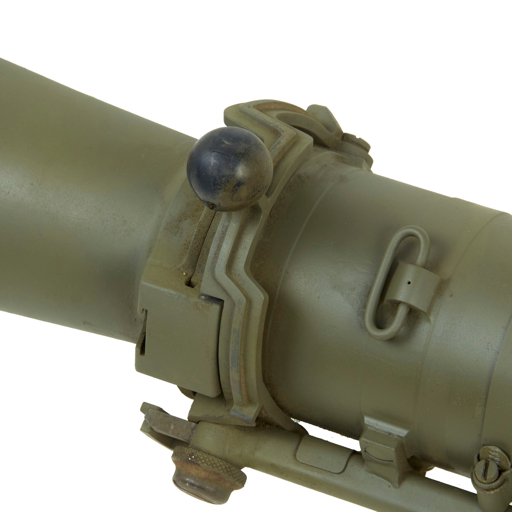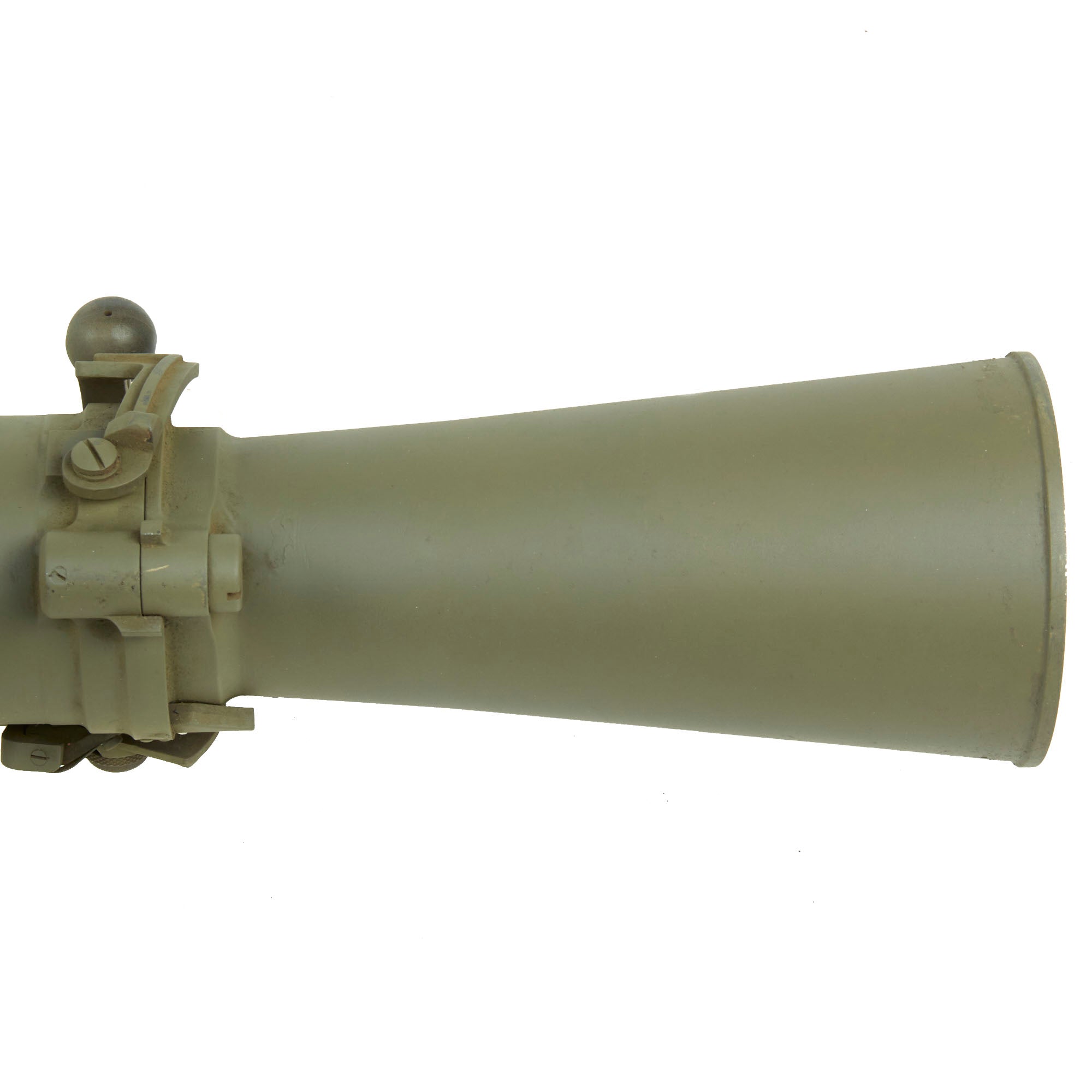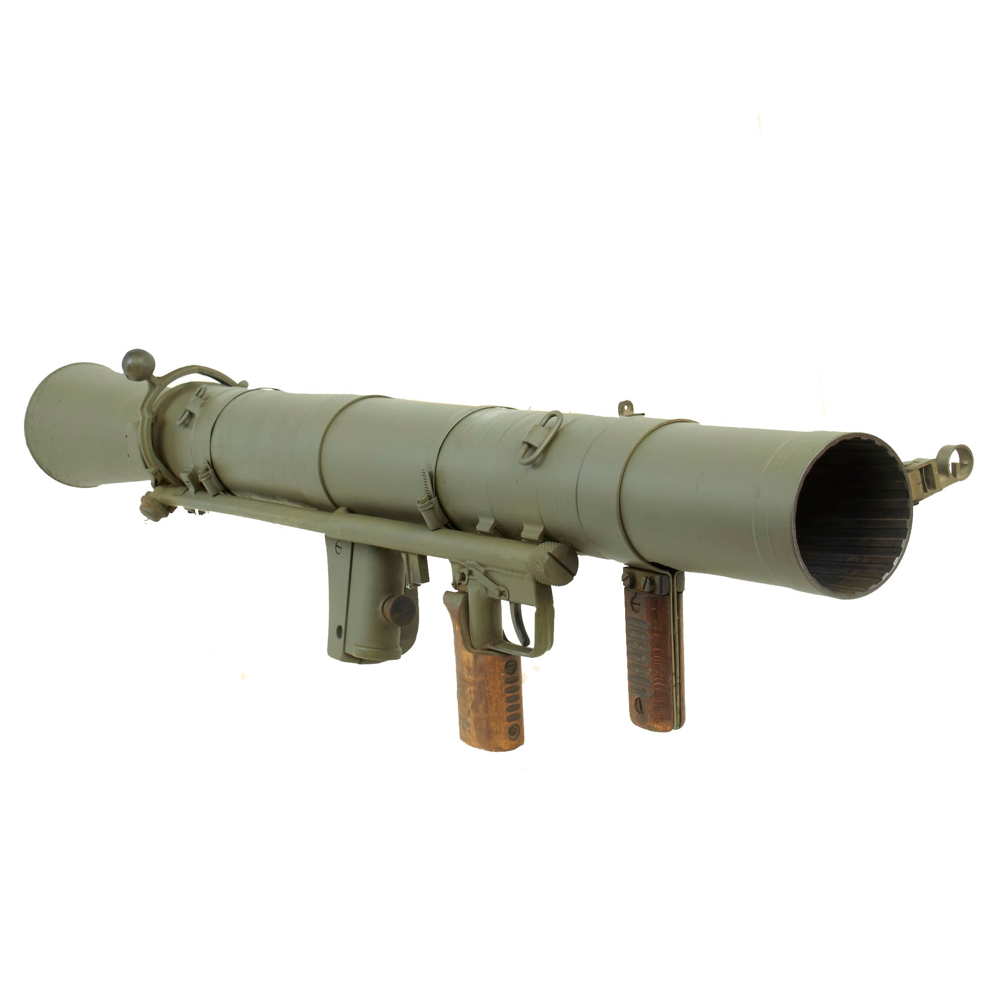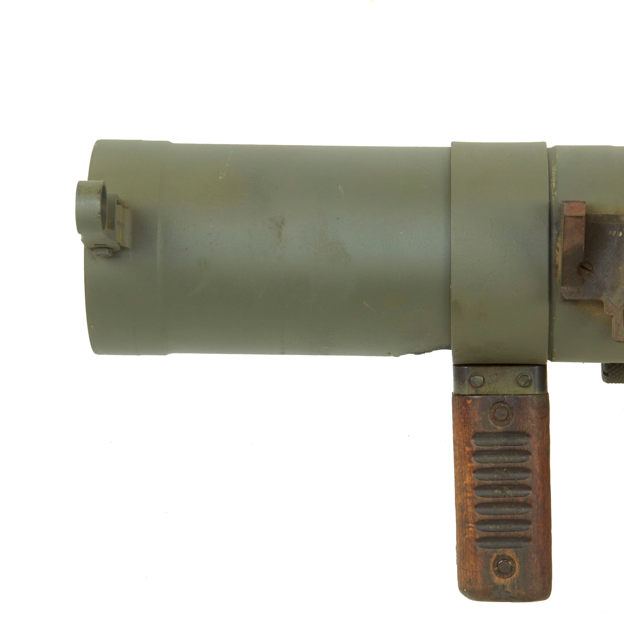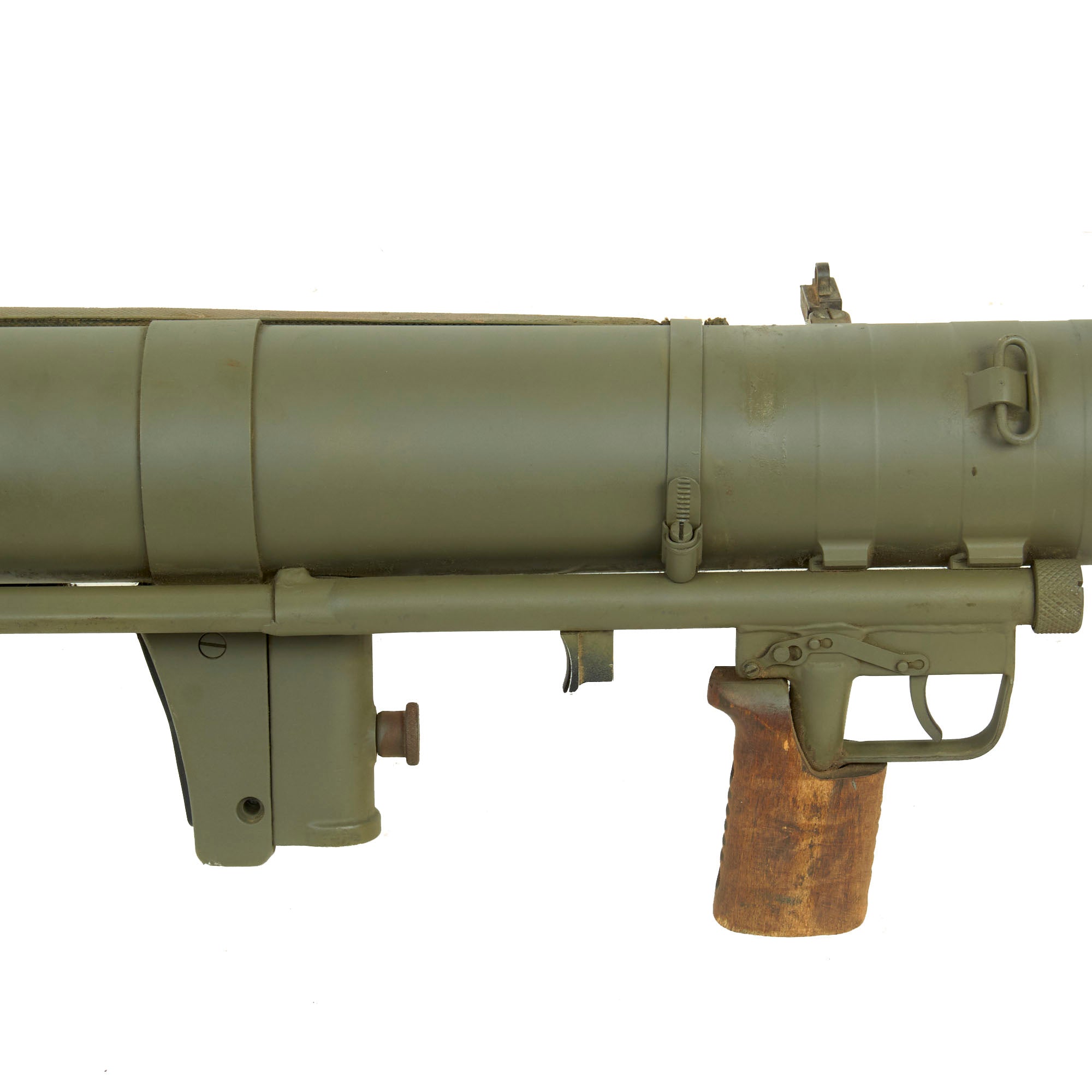 This is the first time that we have had one of these, and it looks to be in great shape, having been repainted following deactivation. The fold out front and rear sights on the left side are still present, as are both hand grips and the shoulder rest. The trigger is present but does not really move, nor does the safety. The rear nozzle can be rotated into the loading position, however the latch definitely takes a rubber mallet to move. These were often issued with a monopod, but this example no longer has it.