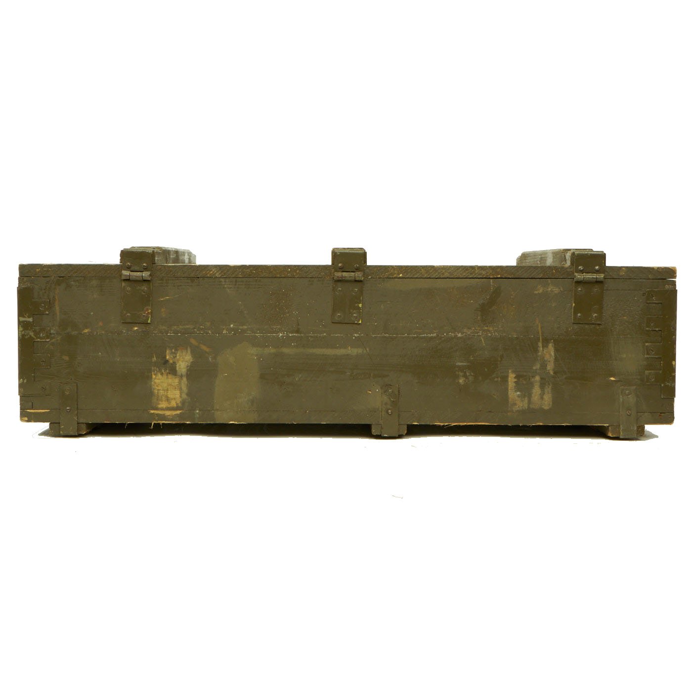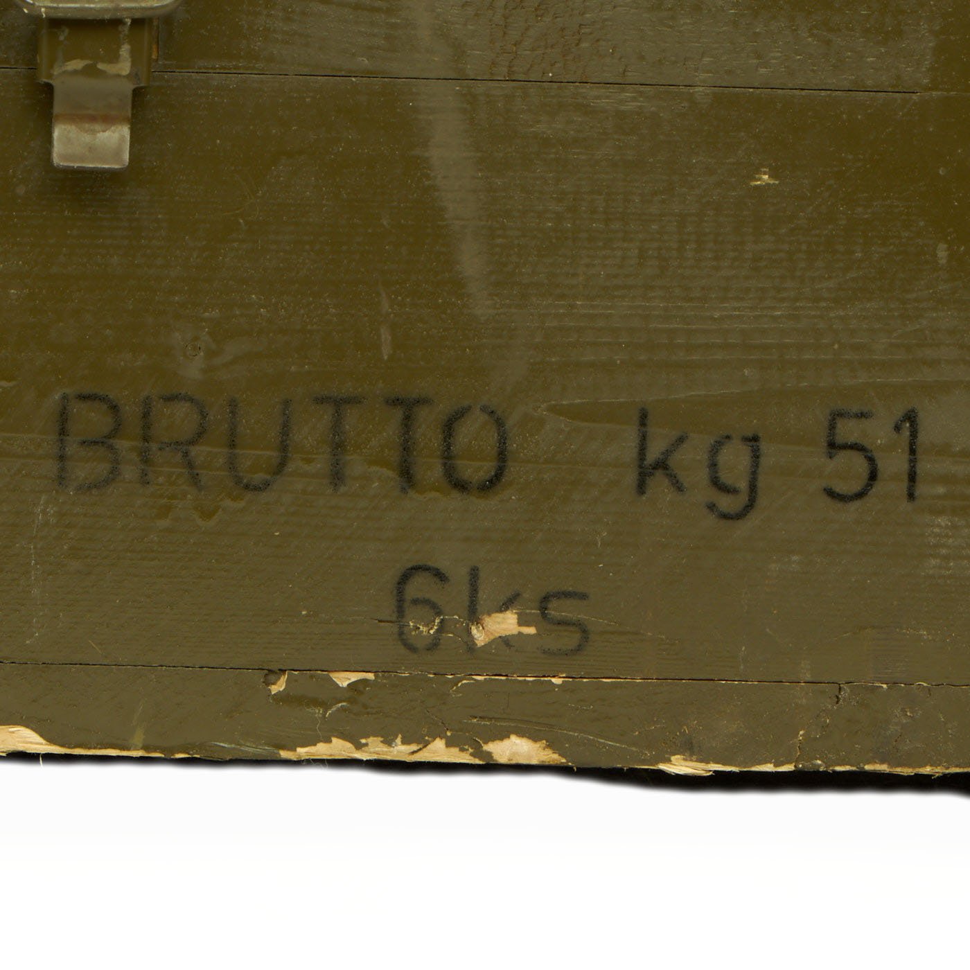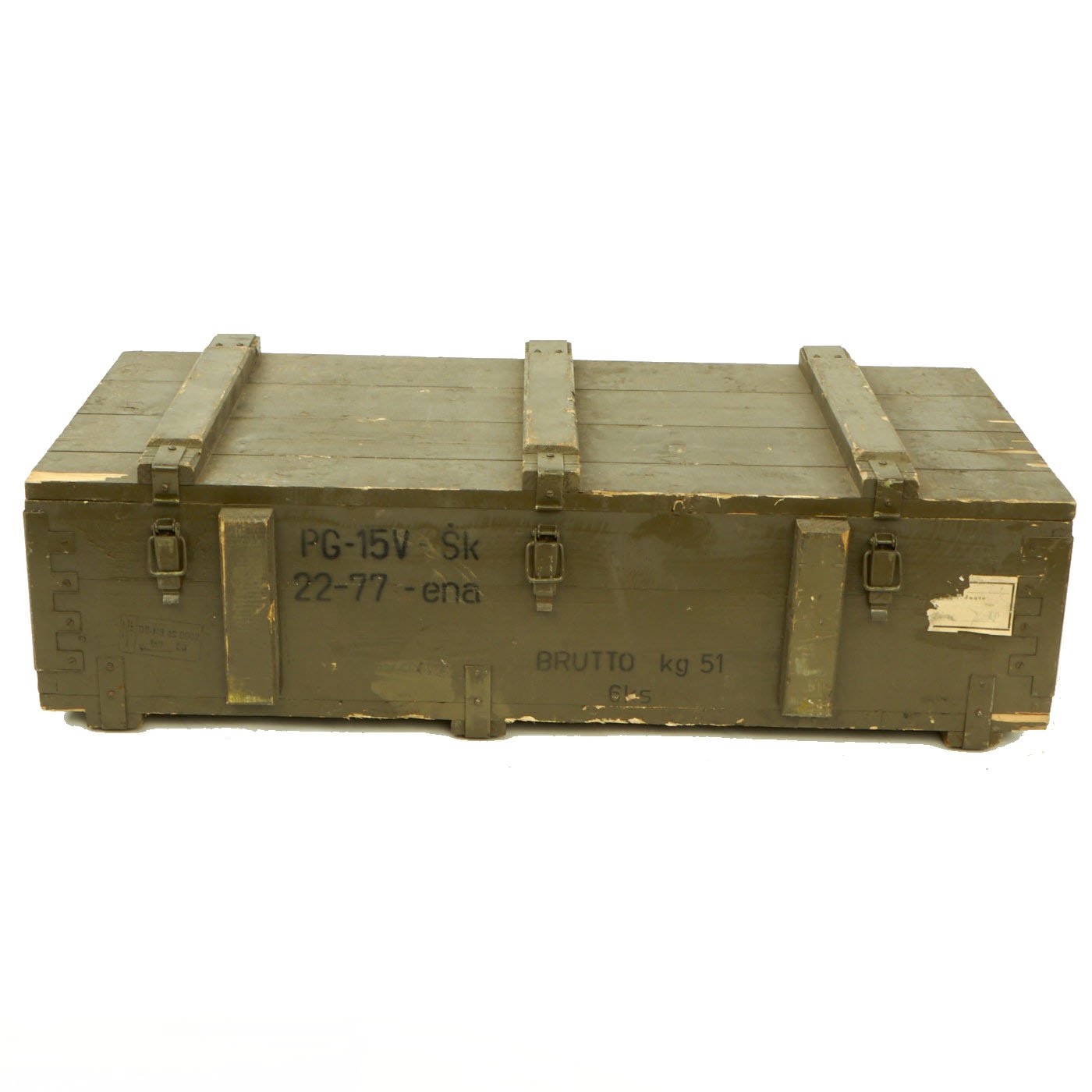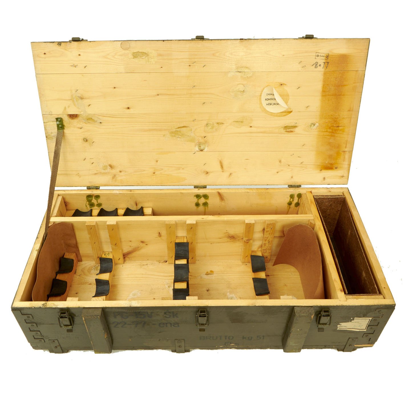 The transit crate itself measures 40"L x 20"W x 11 1/2", and weighs about 90lbs when all three rockets are placed inside. The interior still retains all the correct original Czech paint markings, and there are some labels on the inside as well. The markings on the rockets and chest indicate that the set was made in the late 1970s, towards the end of the cold war.