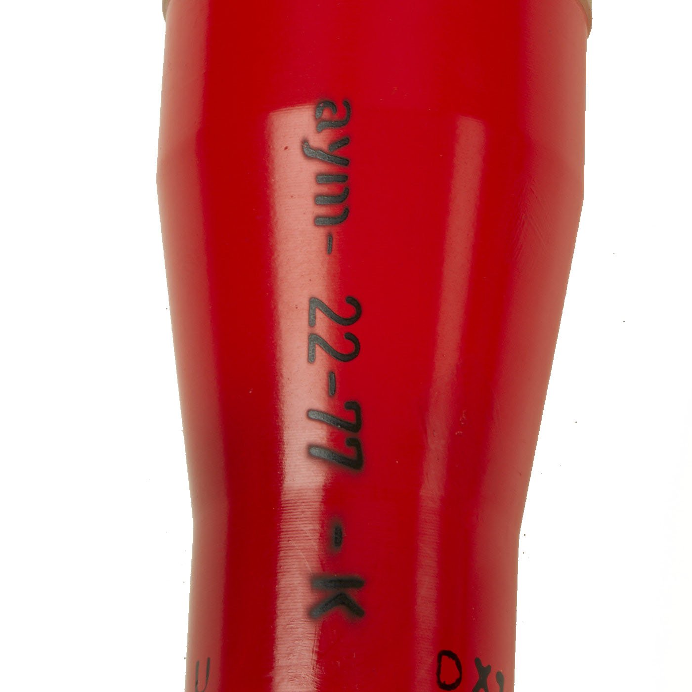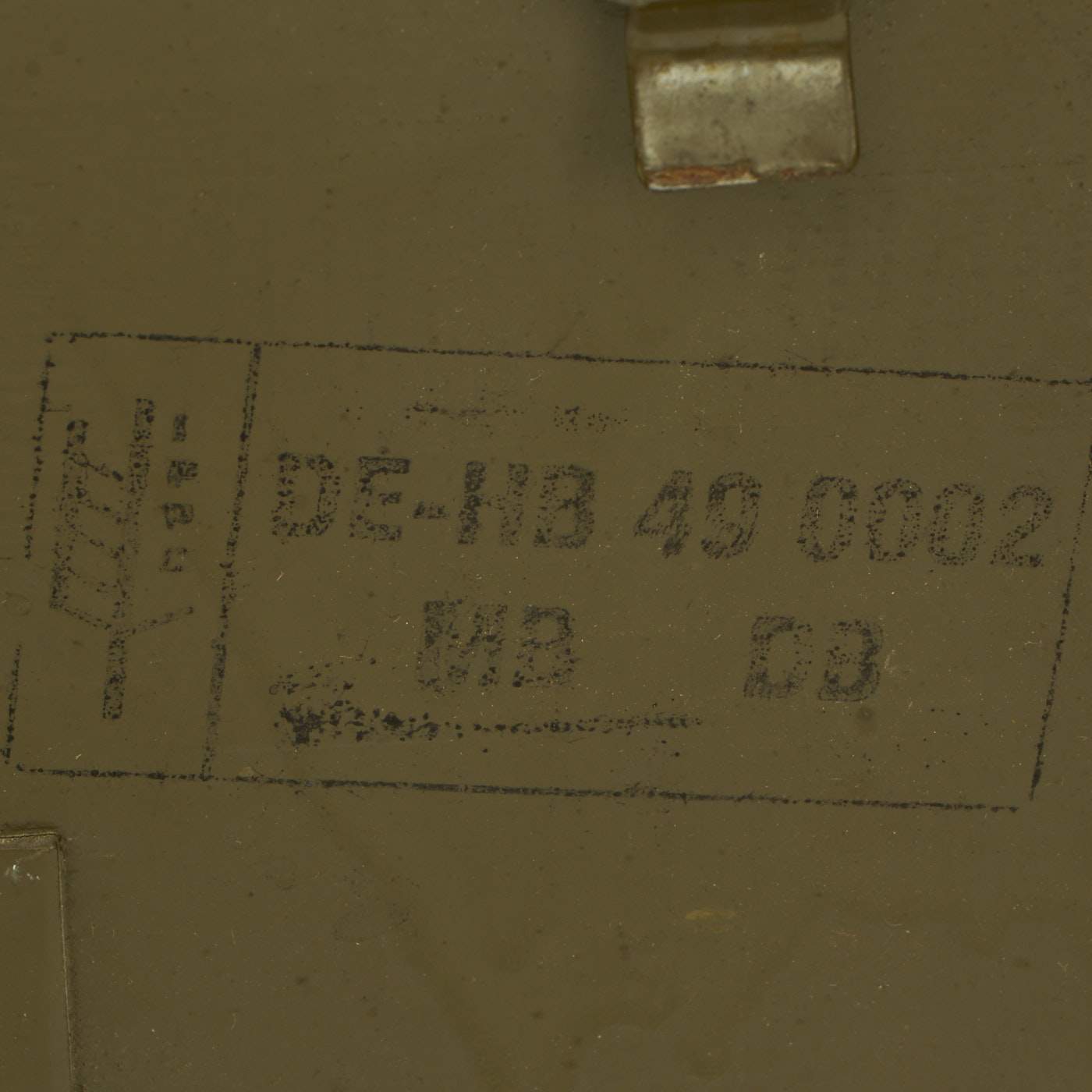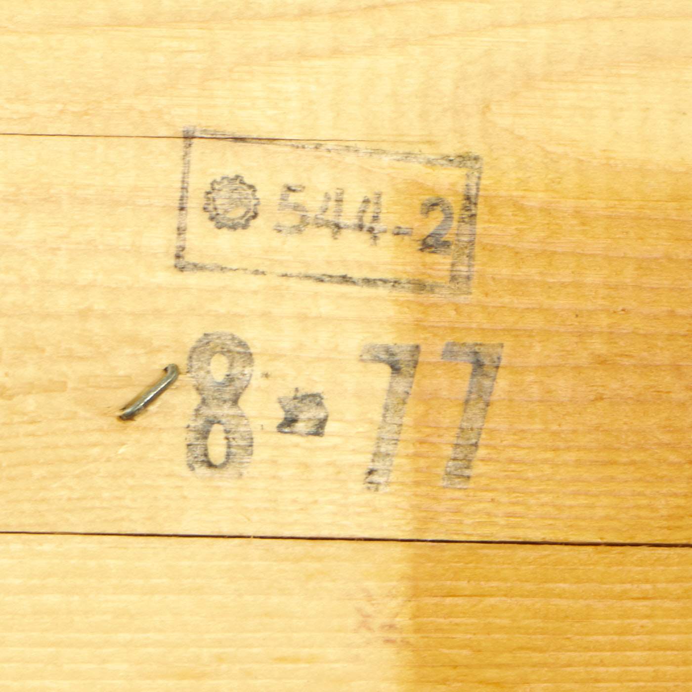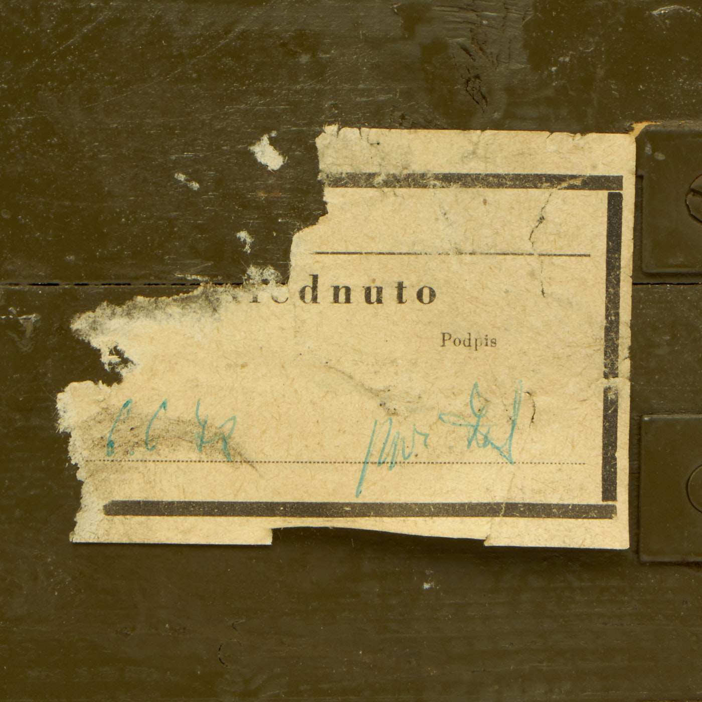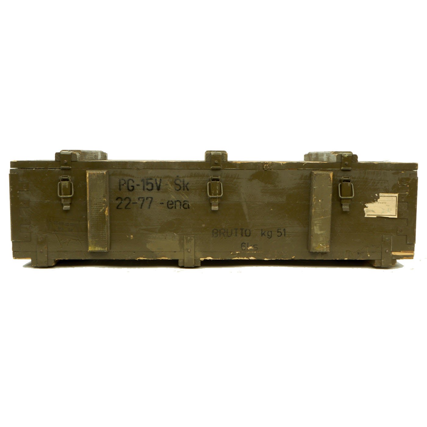 The transit crate itself measures 40"L x 20"W x 11 1/2", and weighs about 90lbs when all three rockets are placed inside. The interior still retains all the correct original Czech paint markings, and there are some labels on the inside as well. The markings on the rockets and chest indicate that the set was made in the late 1970s, towards the end of the cold war.
