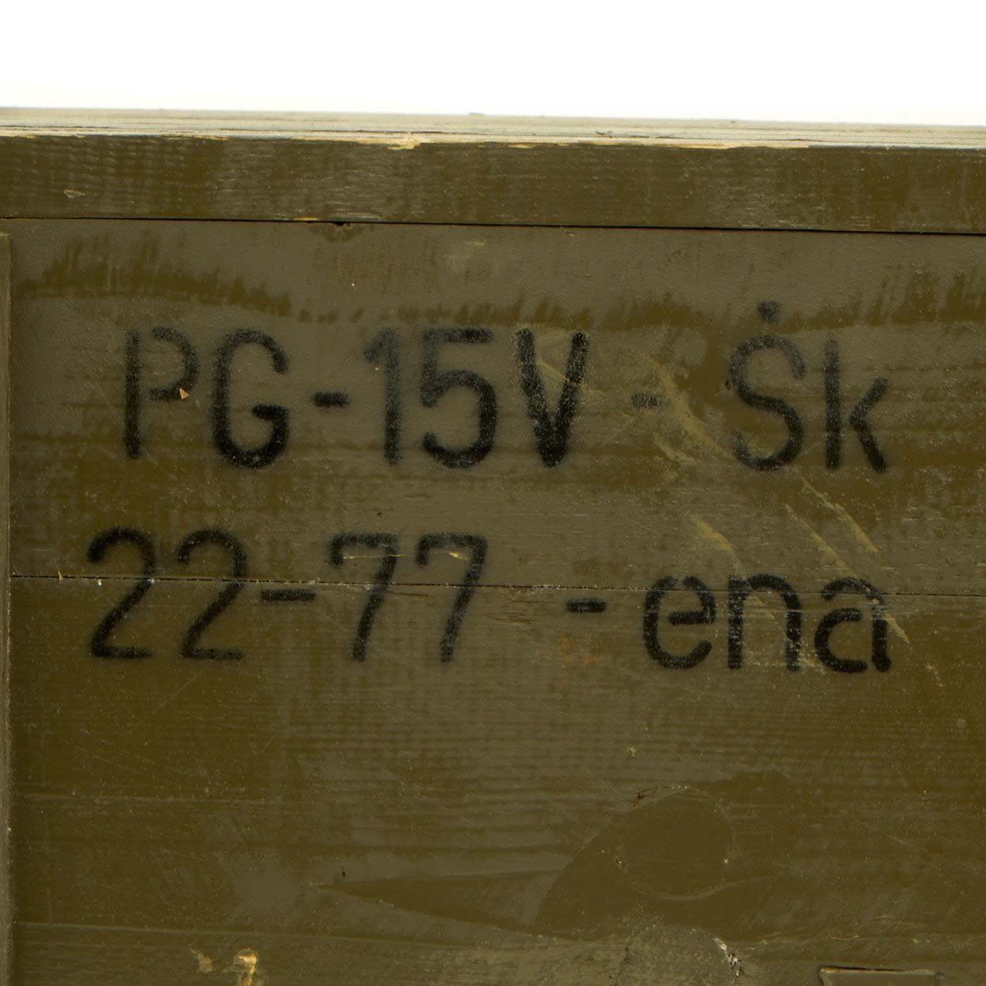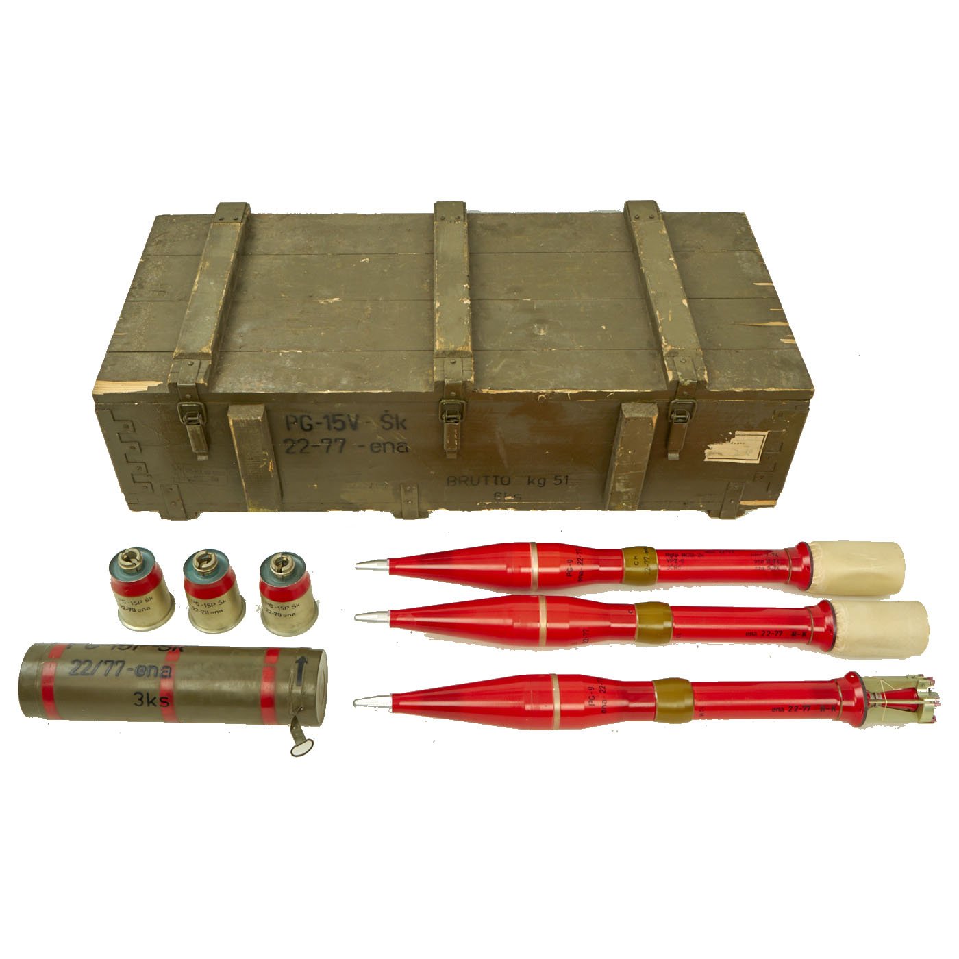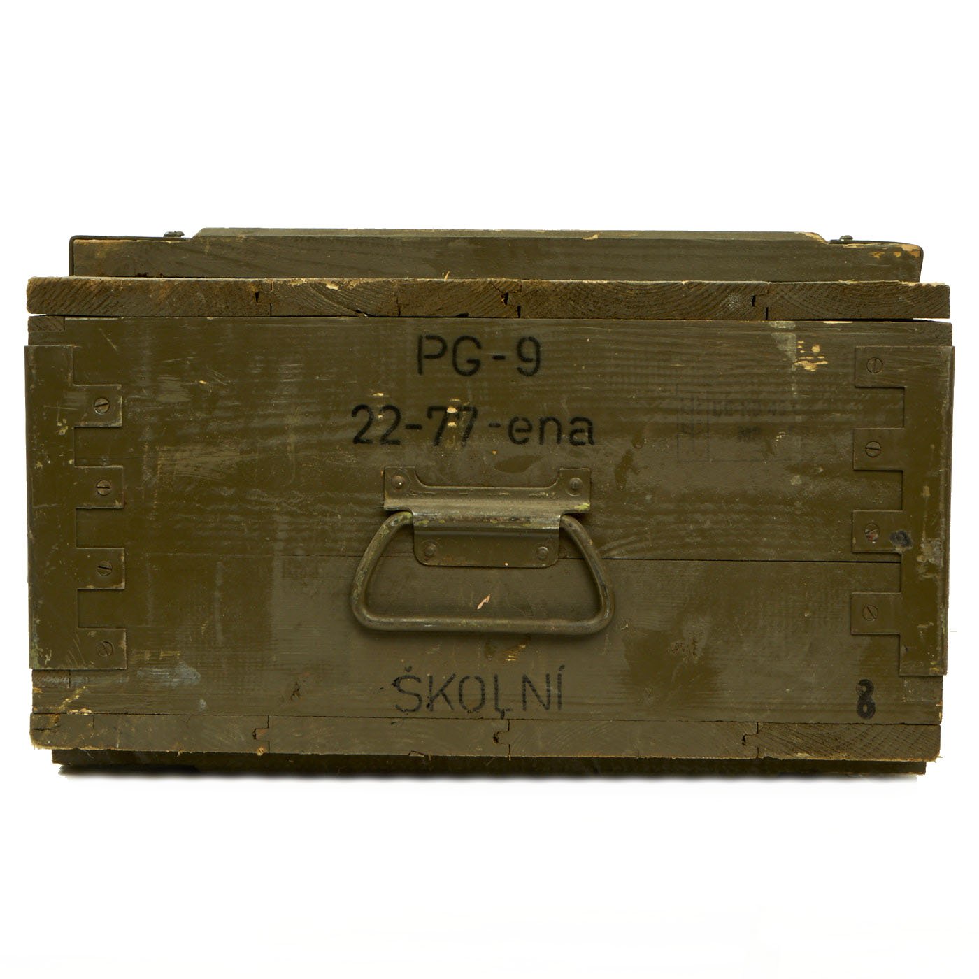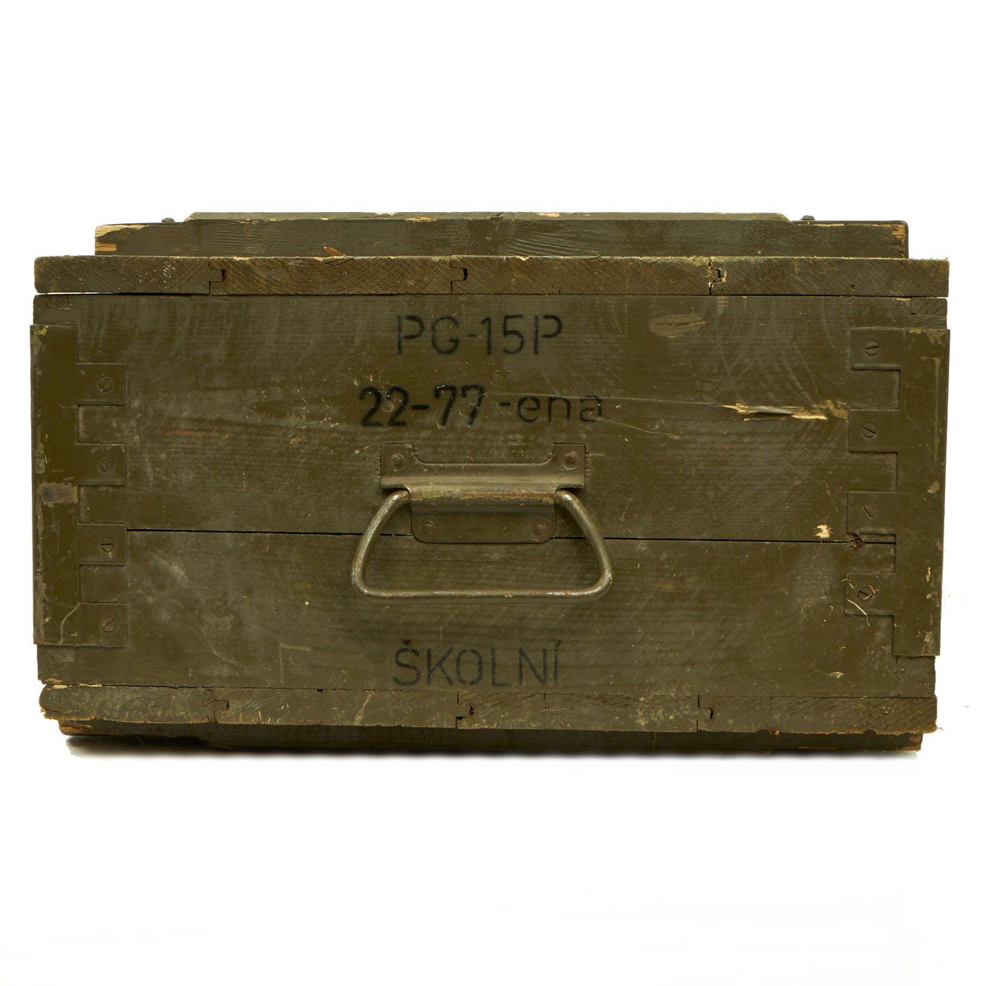This is a very nice Czech Army training set for the SPG-9, available to them through their communist connections during the cold war. Originally this would have had 6 inert training rockets inside, however 3 are missing, as is one of the two canisters that would be on the right side of the case. Each training round is composed of the PG-9 inert rocket and PG-15P Sk propulsion charge.