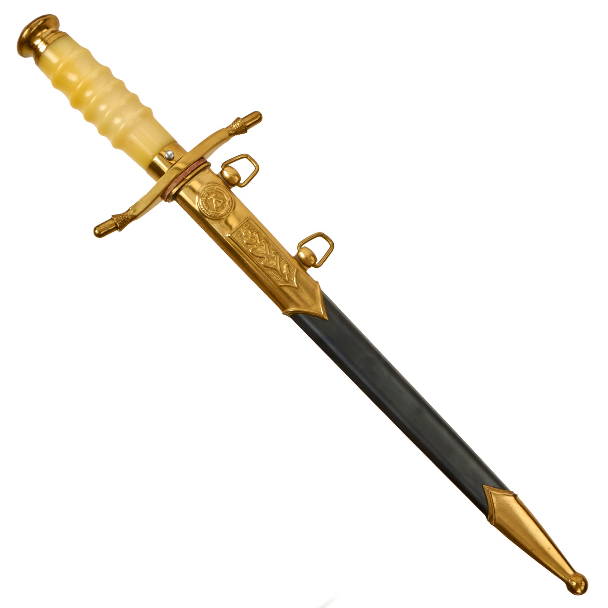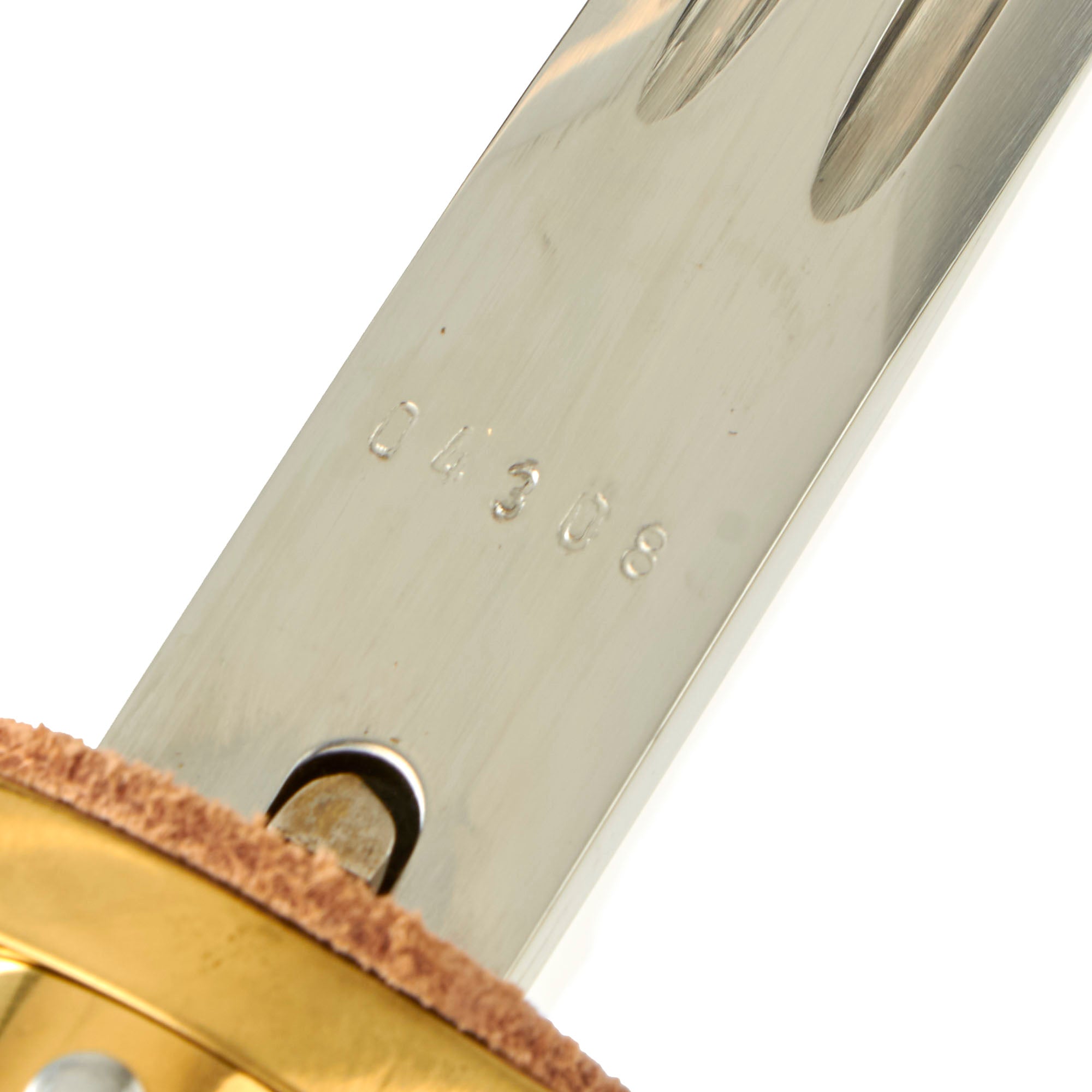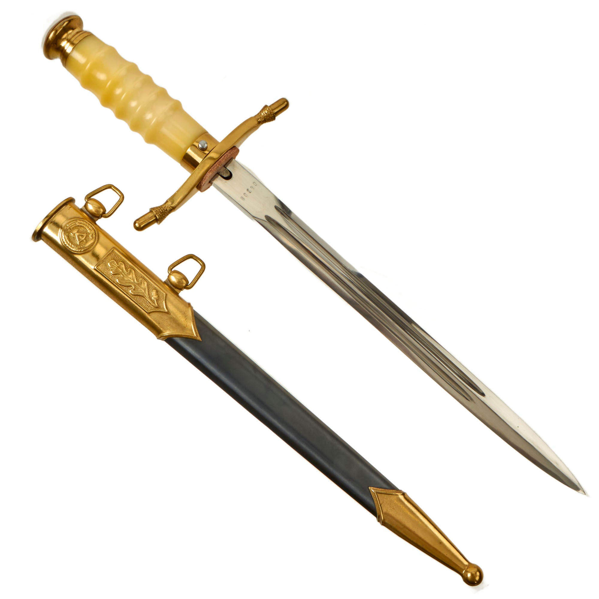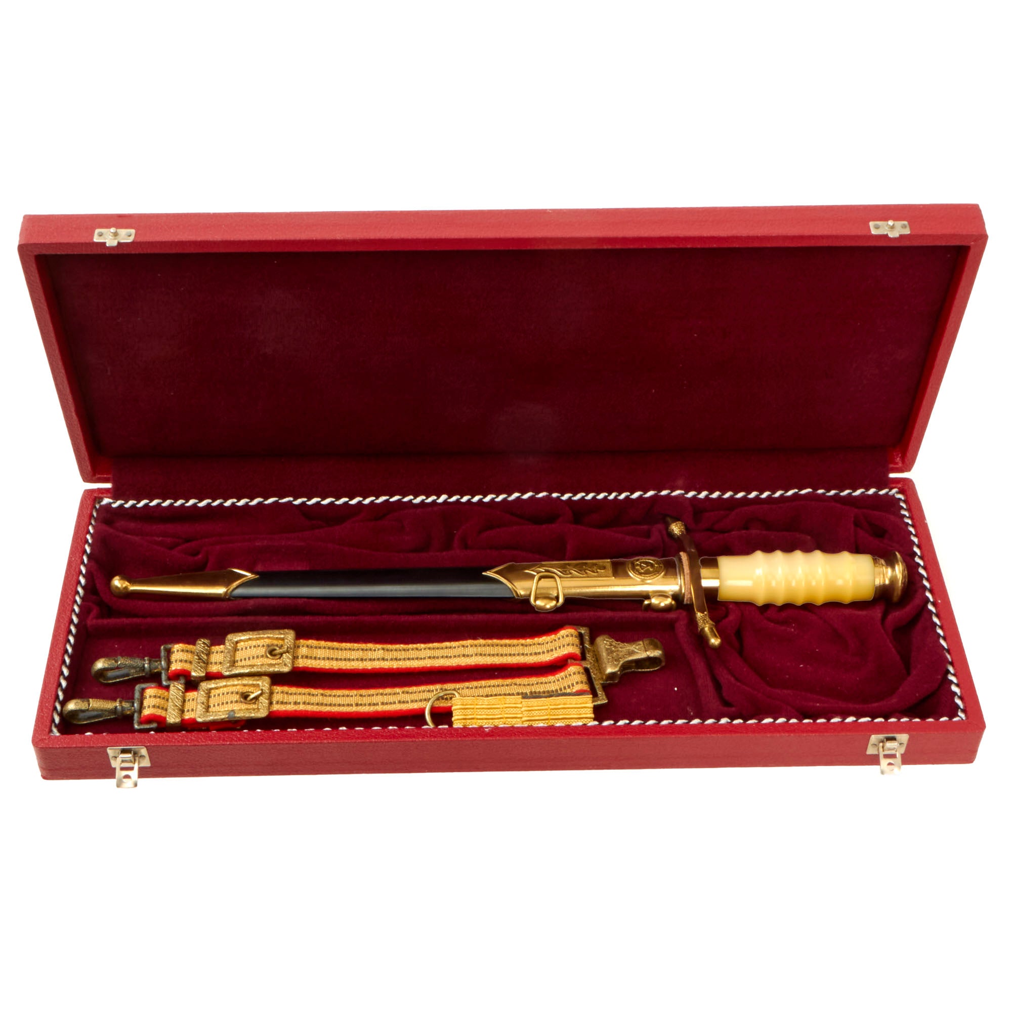 Original Item: Only One Available. This is a nice example of an East German National People's Army (NVA) General’s Dagger with the correct scabbard, hanger, and presentation case. The generals/admiral daggers of the DDR were adopted for wear in 1960. They made their first public appearance during the May Day Parade of 1961. The majority of these daggers are identical in appearance, being of lacquer-coated polished brass. However, some presentation daggers were gold-plated and this one appears to be an example of one. This gold plating was discontinued after 1983.