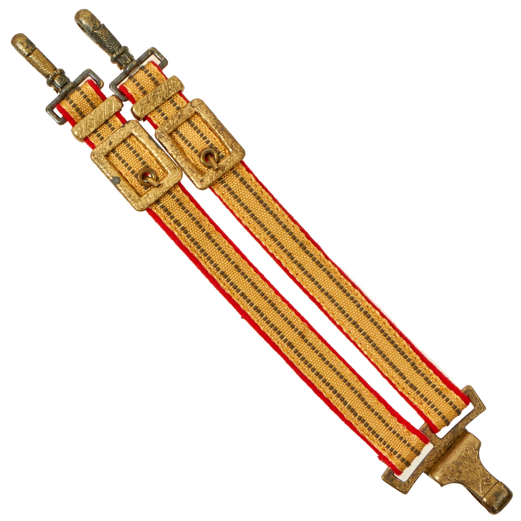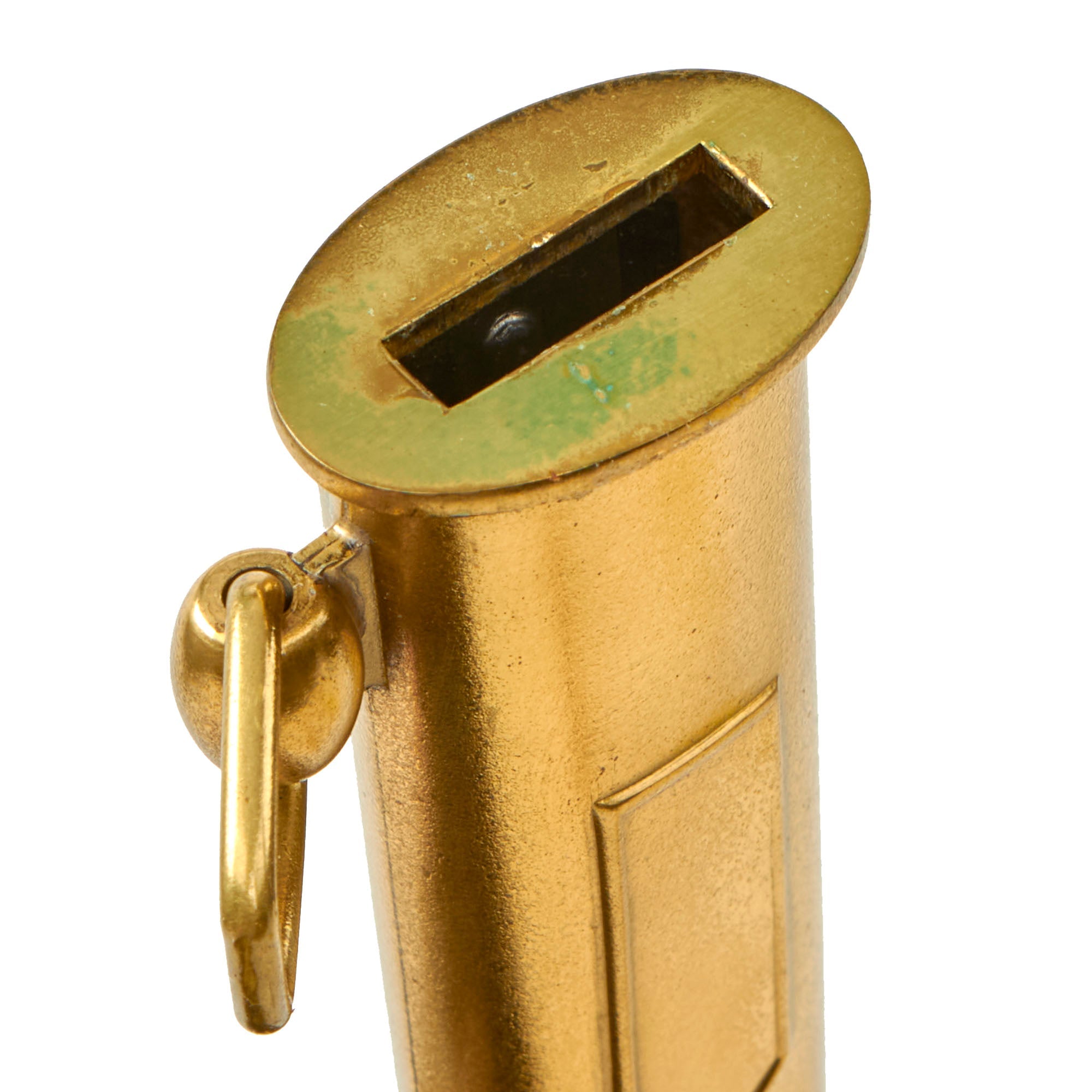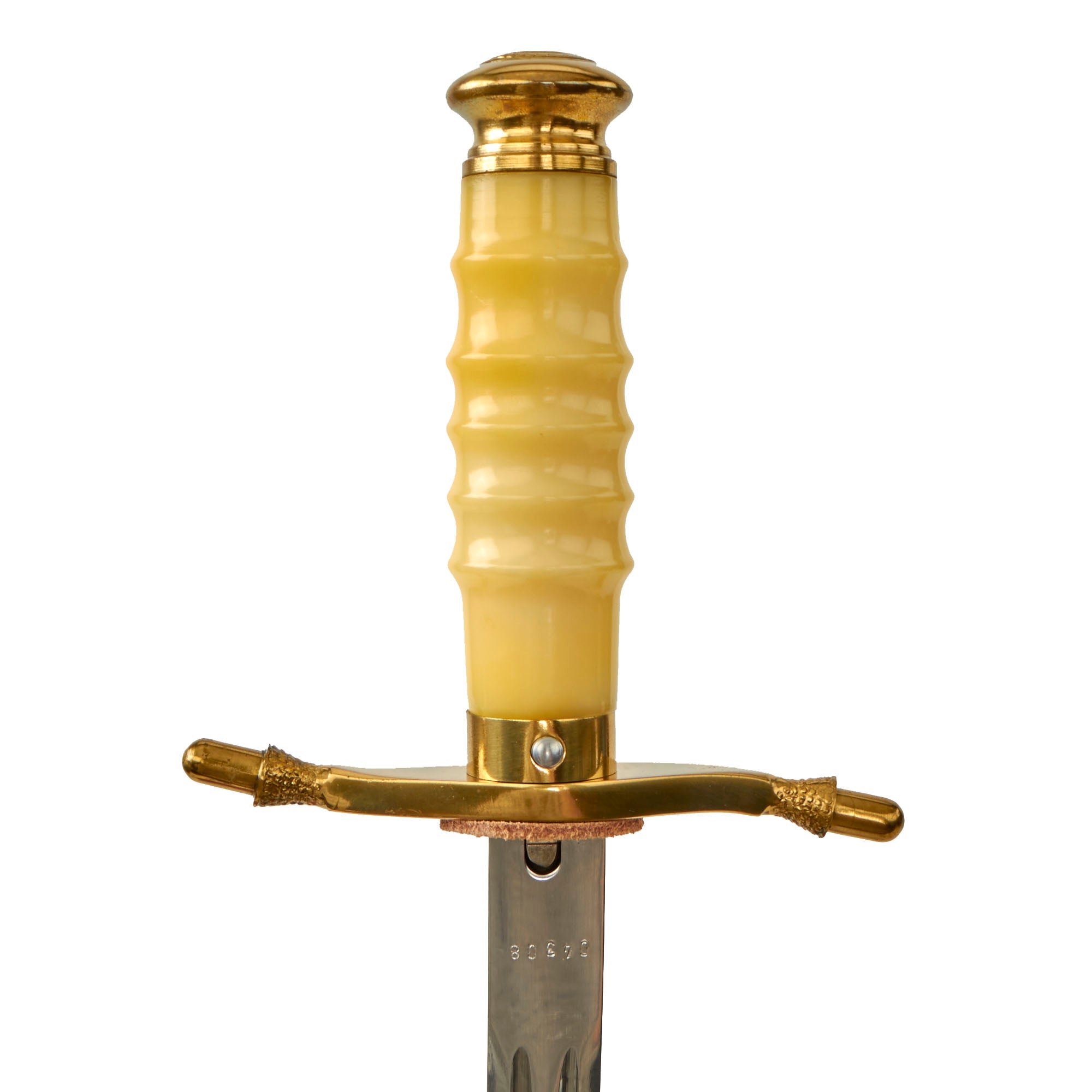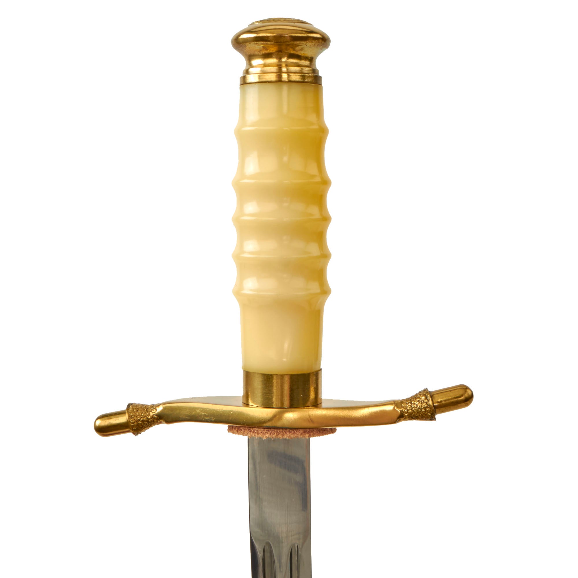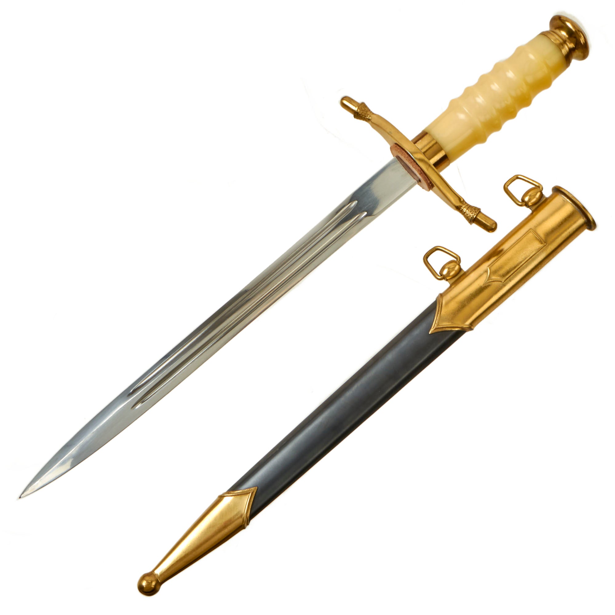 Original Item: Only One Available. This is a nice example of an East German National People's Army (NVA) General’s Dagger with the correct scabbard, hanger, and presentation case. The generals/admiral daggers of the DDR were adopted for wear in 1960. They made their first public appearance during the May Day Parade of 1961. The majority of these daggers are identical in appearance, being of lacquer-coated polished brass. However, some presentation daggers were gold-plated and this one appears to be an example of one. This gold plating was discontinued after 1983.