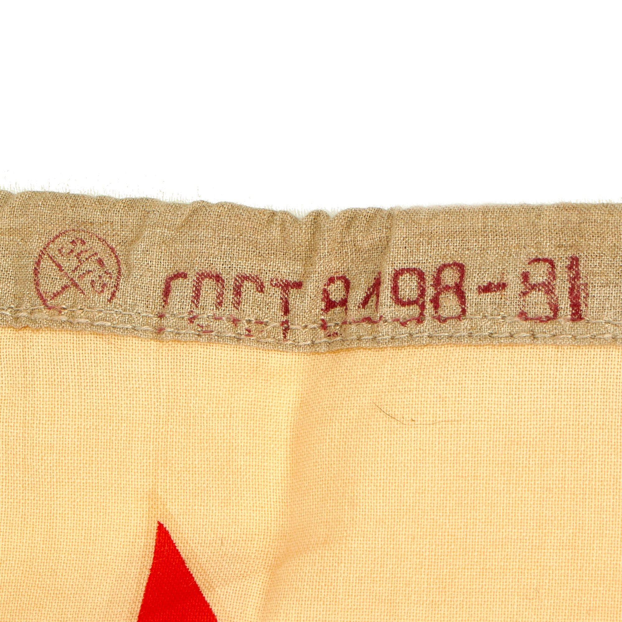 Original Item: Only One Available. This is a relatively rare example of a Soviet Cold War era Naval flag, as flown by the ships and vessels who housed the Flotilla/Squadron commander and is dated 1981. This flag was used from April 21, 1964 to July 21, 1992. The flag measures 39” x 25 ½” and appears to have never been used and is in near mint condition.