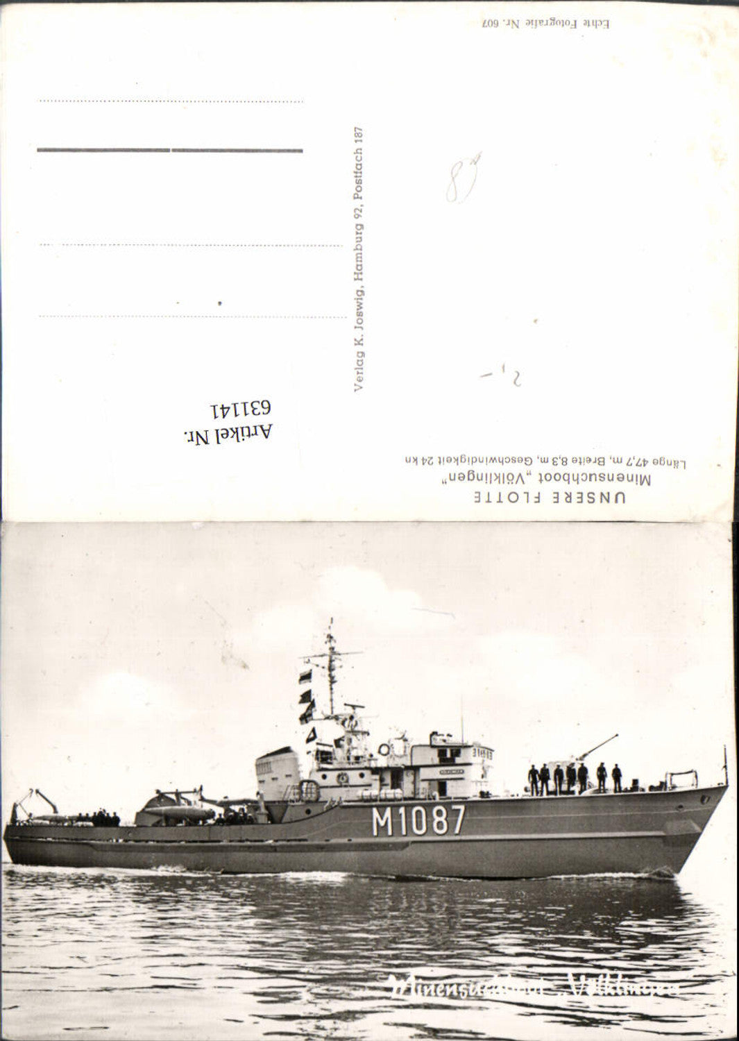 We were not able to find any records of this boat on our searches, however a customer was able to locate a picture of a period postcard of Schiff Marine Minensuchboot Völklingen M1087 (Naval Ship Minesweeper Völklingen M1087), and the silhouette on the plaque is a nearly EXACT MATCH for the design of the ship! They were also able to locate records of the ship indicating it was commissioned in 1960, and decommissioned in 1992: M 1087 Völklingen. It is most likely named after the industrial city of Völklingen on the Saar River near the German French border.