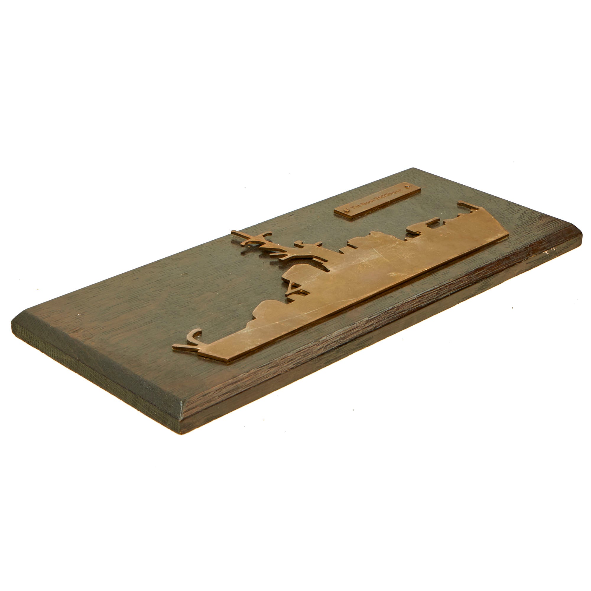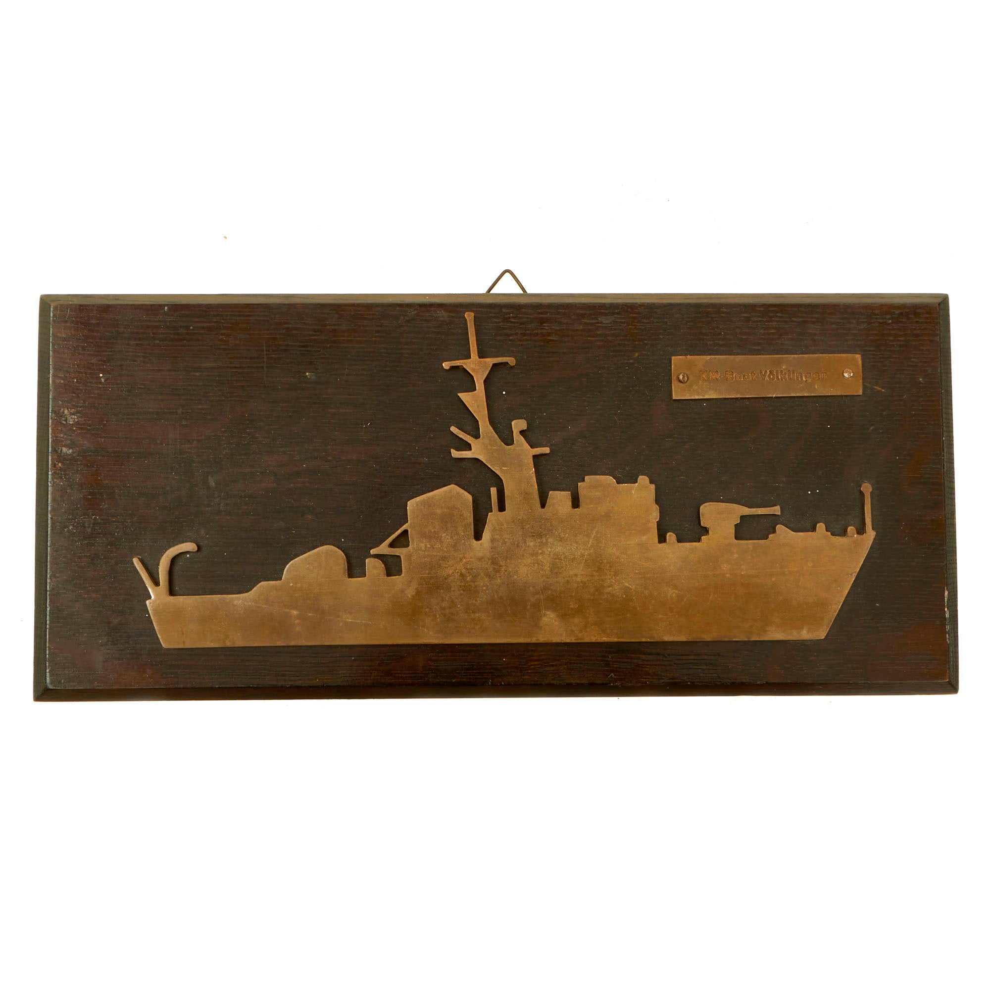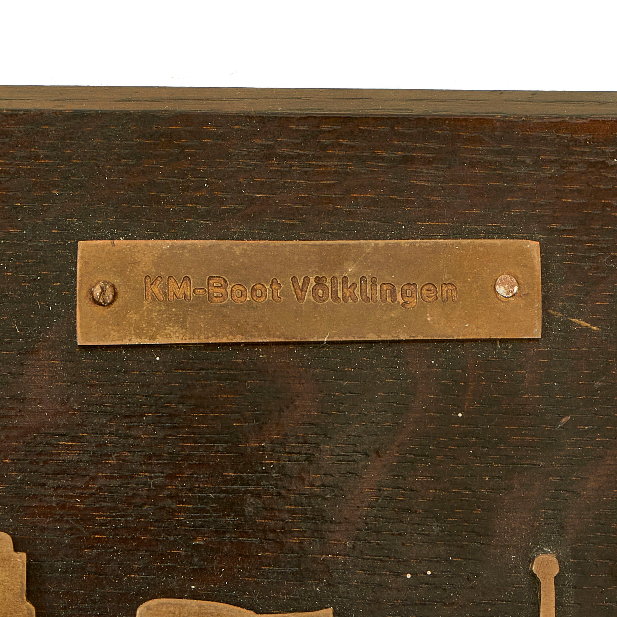 Original Items: One-of-a-Kind. Here we have a very interesting West German Navy Brass & Wood Souvenir plaque, which shows the brass silhouette of a small ship, probably well below destroyer size, with a smaller brass plate marked KM-Boot Völklingen, for Küsten-Minensuchboot (Coastal Minesweeper) Völklingen.