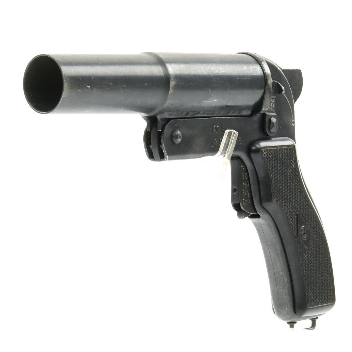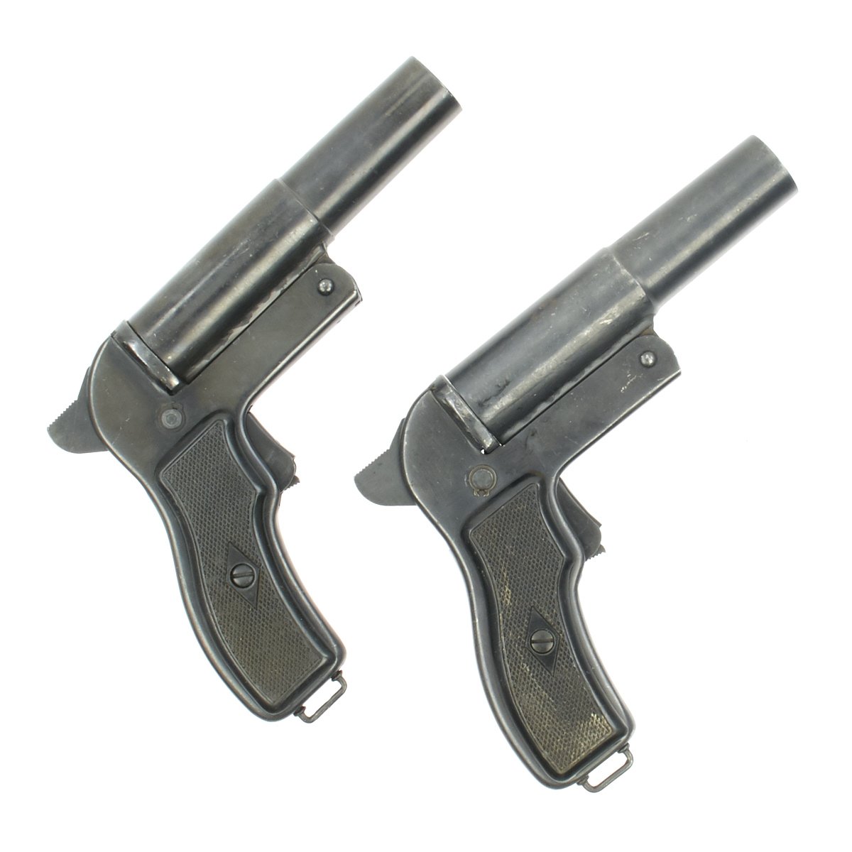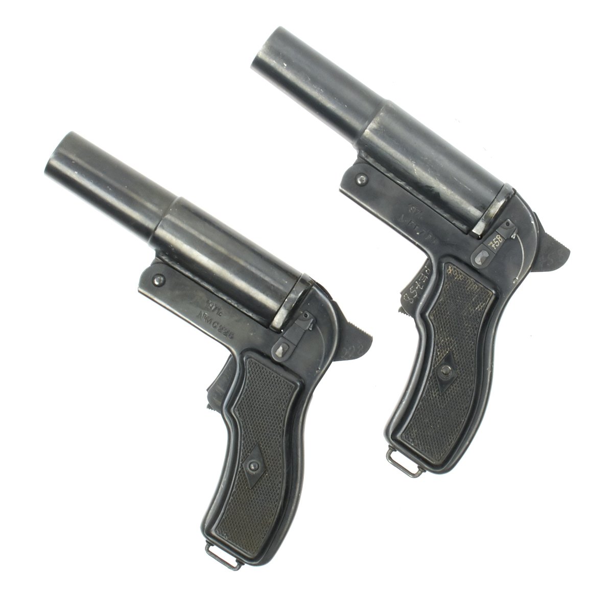 Original Items. Only One Set Available. This is a pair of excellent condition Polish Flare guns manufactured in 1971. Each is marked with a serial number and Polish military factory marking. These flare pistols feature all steel construction with synthetic grips. These are built tough to last thru years of rugged service.
