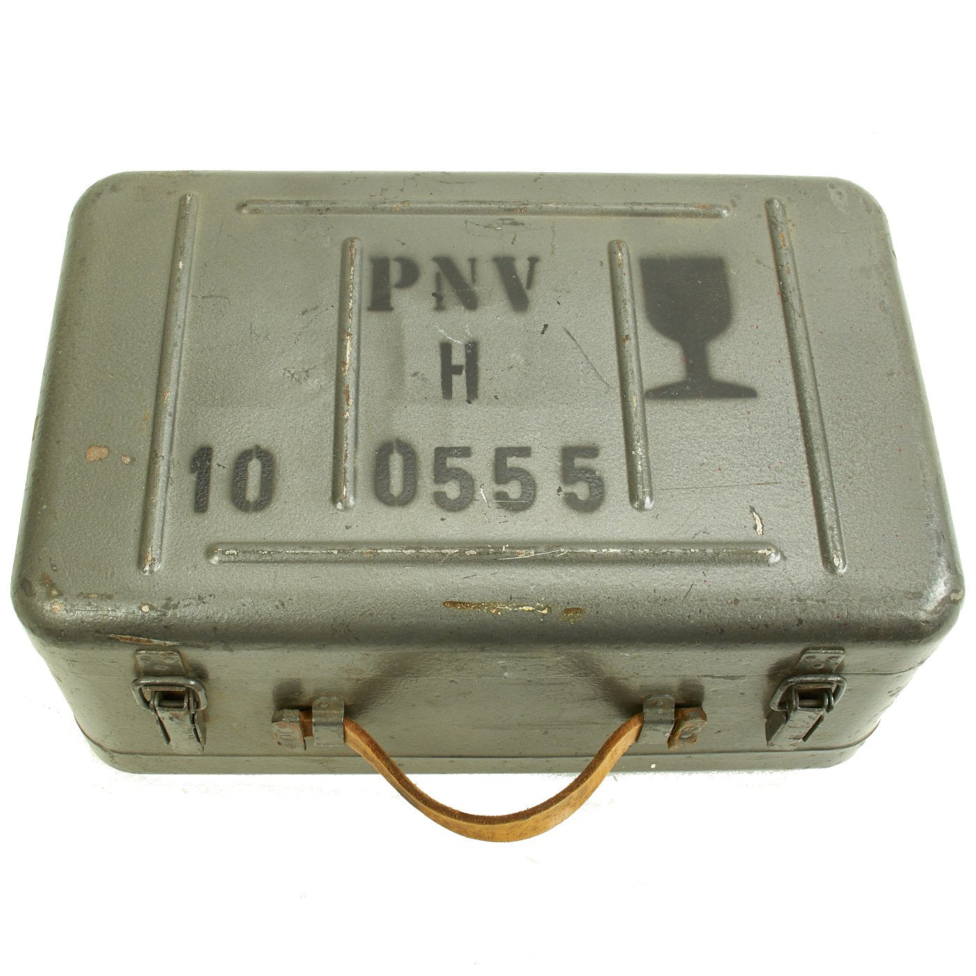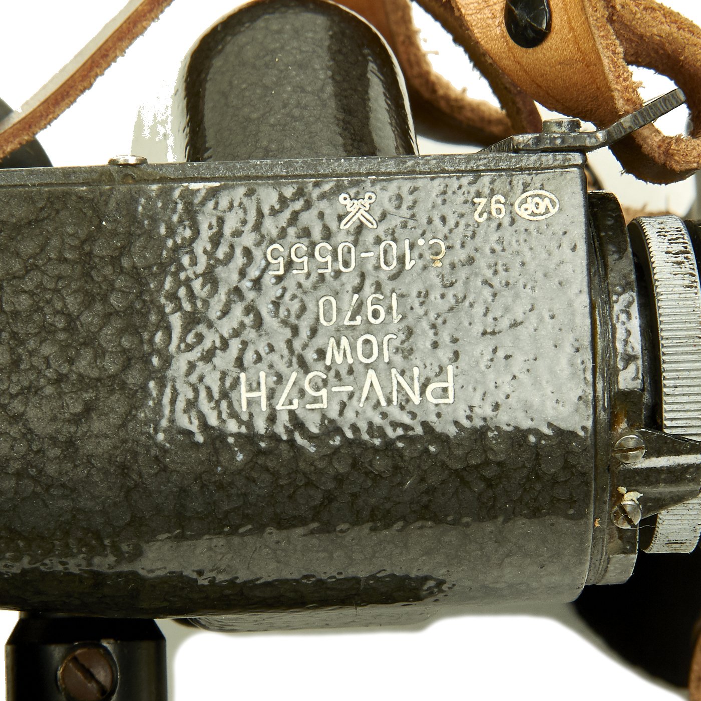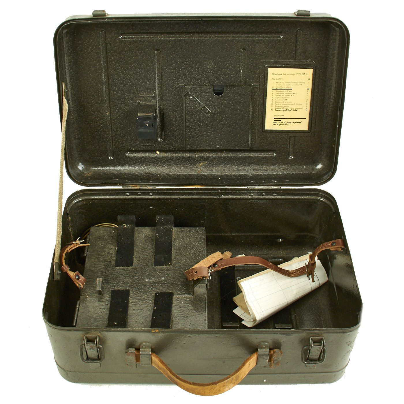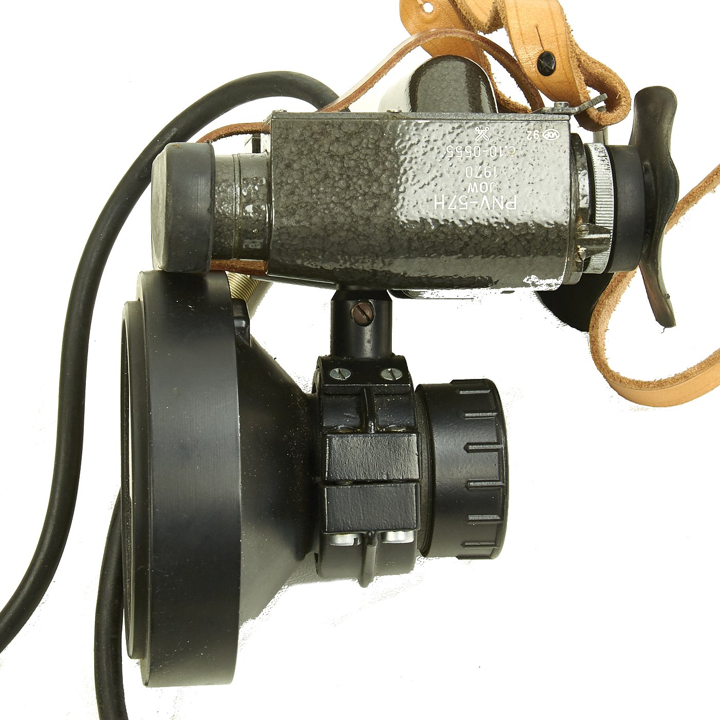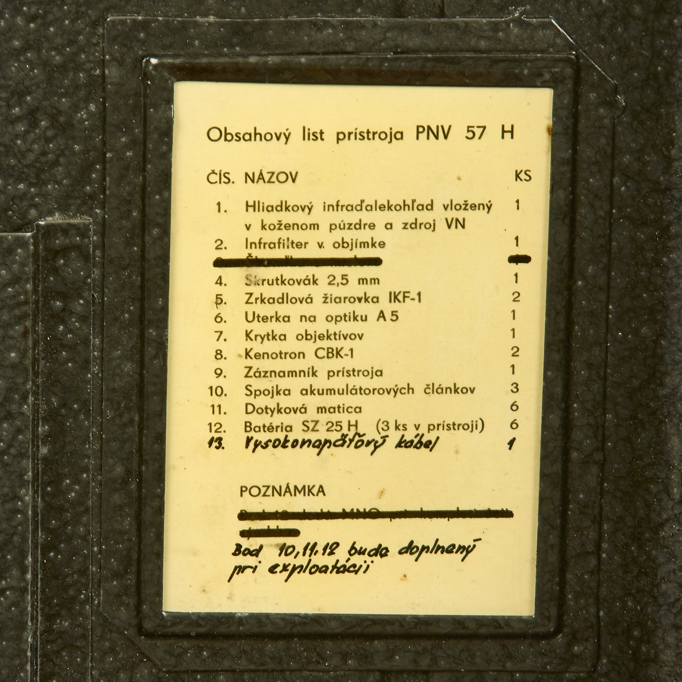Original Item: Only One Available. These are early 1970s Cold War era Czech produced clones of Soviet PNV-57A tanker goggles. They feature a large lamp on top of goggles which is an Infrared (IR) illuminator which helps the goggles see further, especially when there is not much ambient light (cloudy night, no moon, etc.). The googles connect to a belt held battery transformer. This example is offered in near mint condition and is complete, it even has spare bulbs and parts and is all contained in the original steel transit chest. We have not tested it so do not promise it is functional but we can see no reason why it wouldn't function. Also included is Czech Military inspection documents and manual.