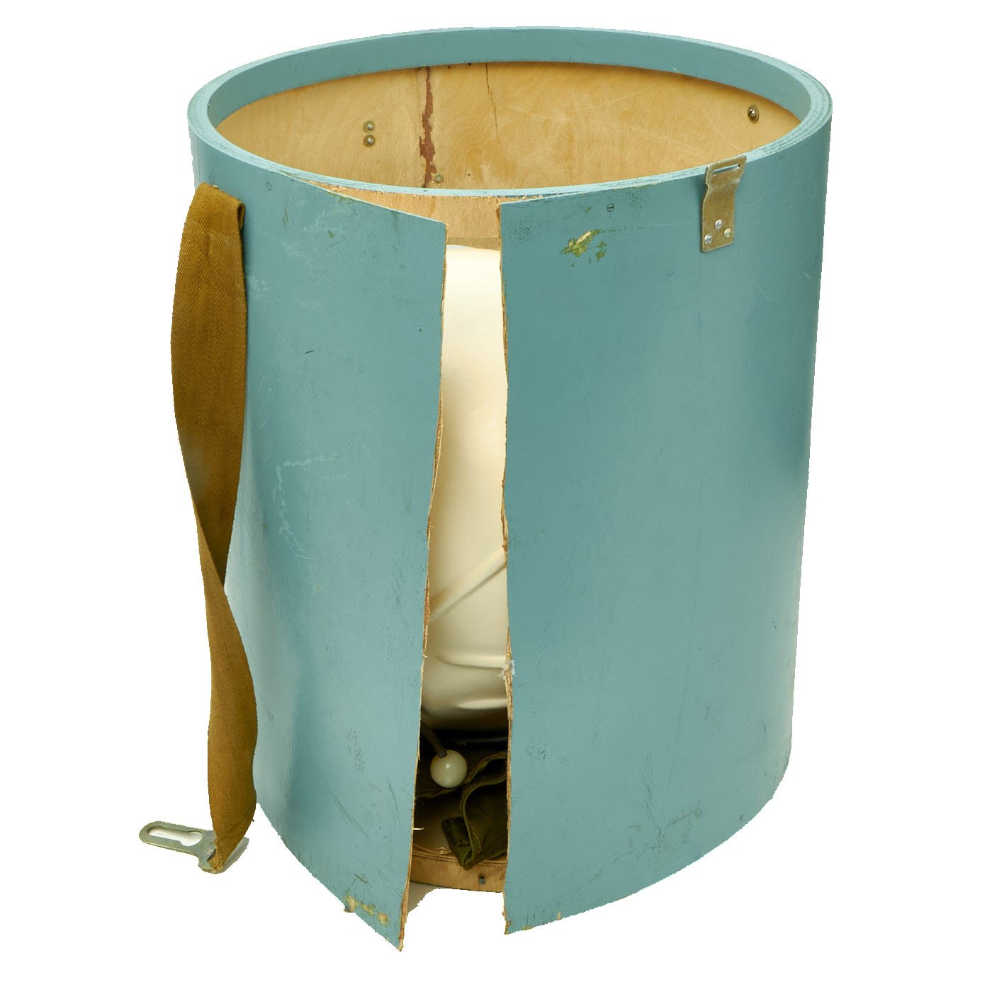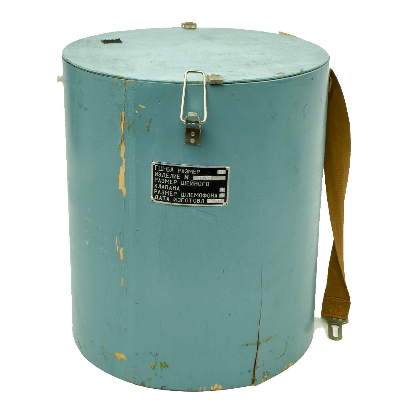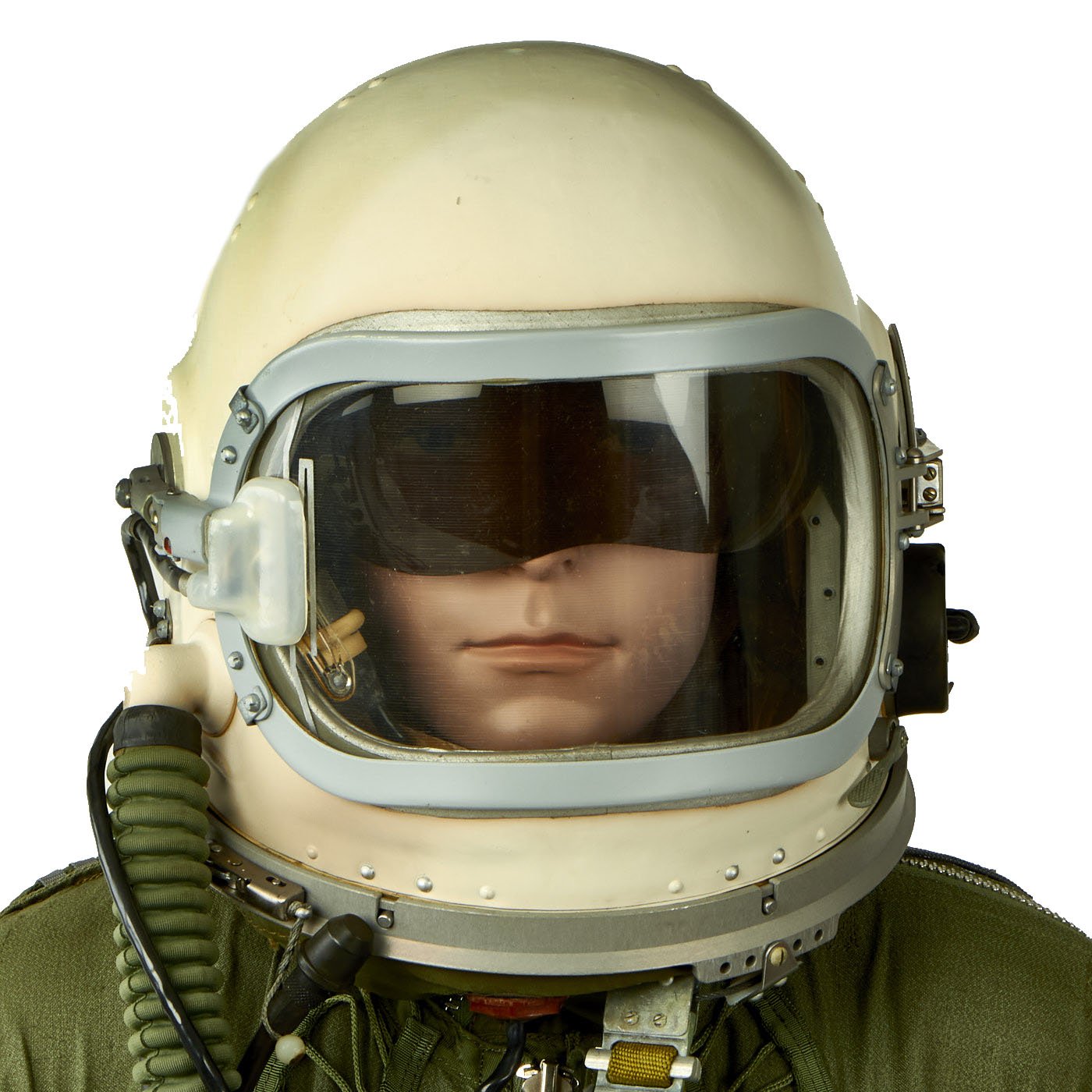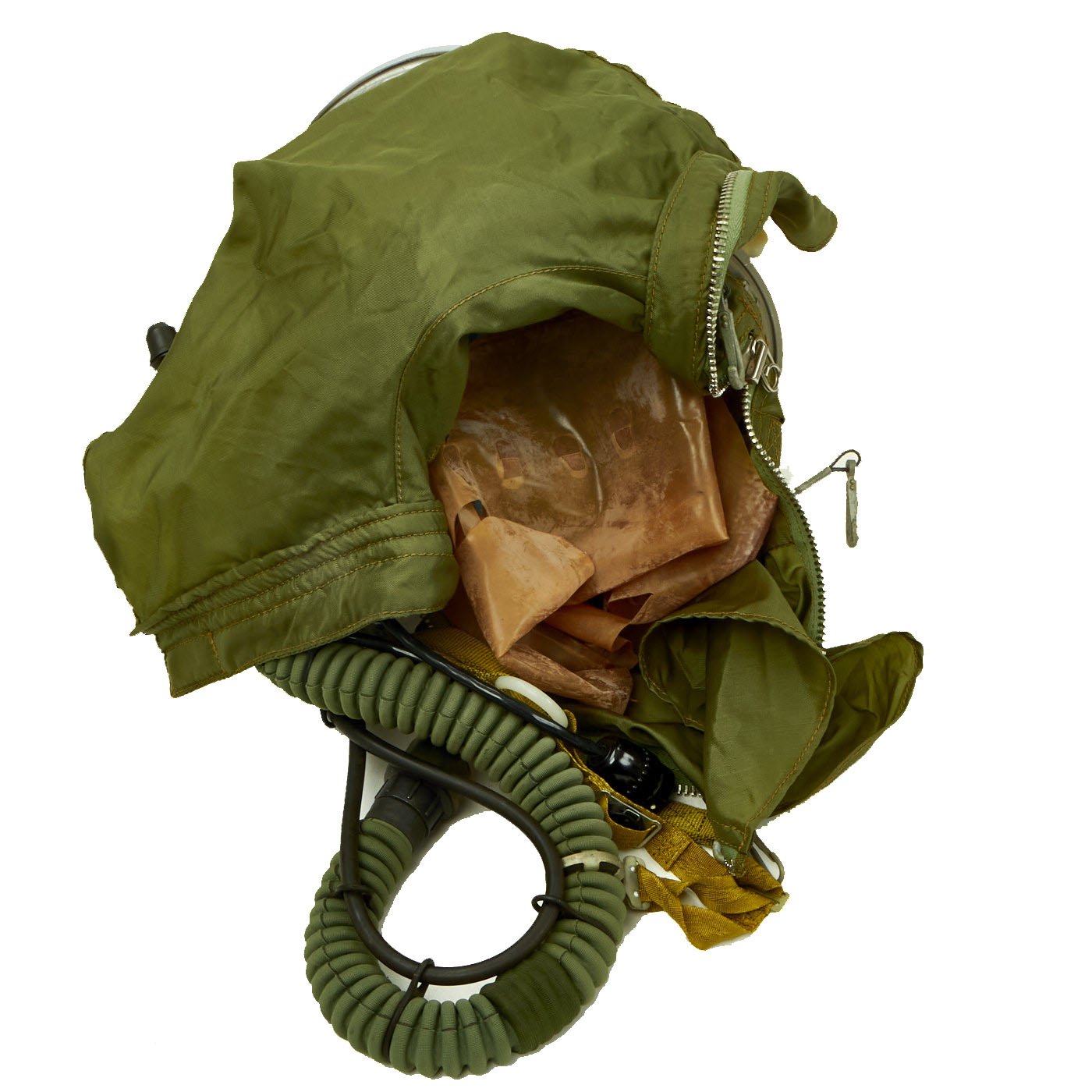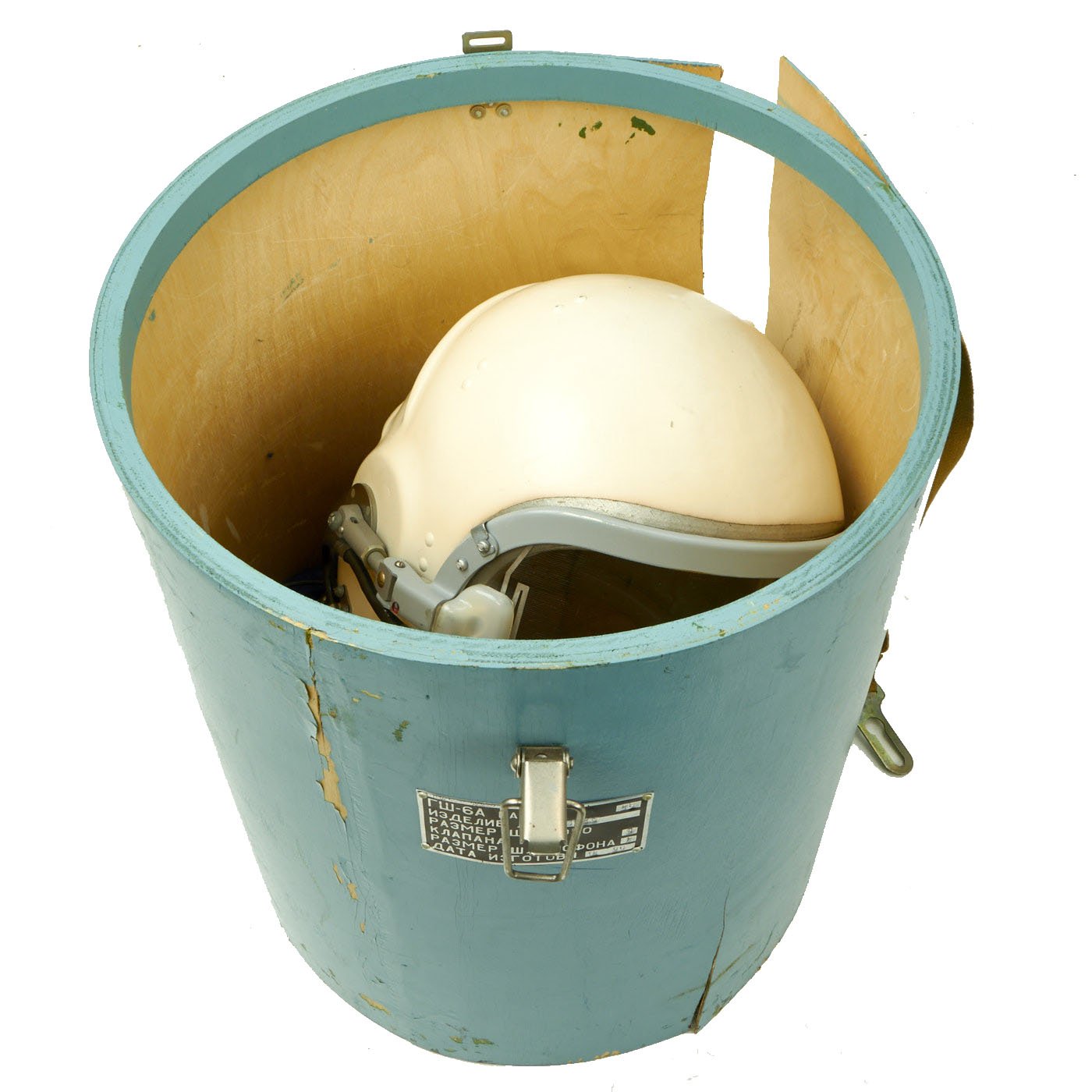 This example is offered in very good condition. Used in the early Russian space program and when flying at extremely high altitudes, this GSh-6A (Germoshelm 6A) high-altitude helmet features a retractable inner sun visor and the locking ring worn at the pilot’s neck with the latex dam that fits snugly onto the pilot’s upper body. Overall a very nice complete and well marked helmet. It has the rubber neck gasket as well, though the rubber has torn and deteriorated somewhat.