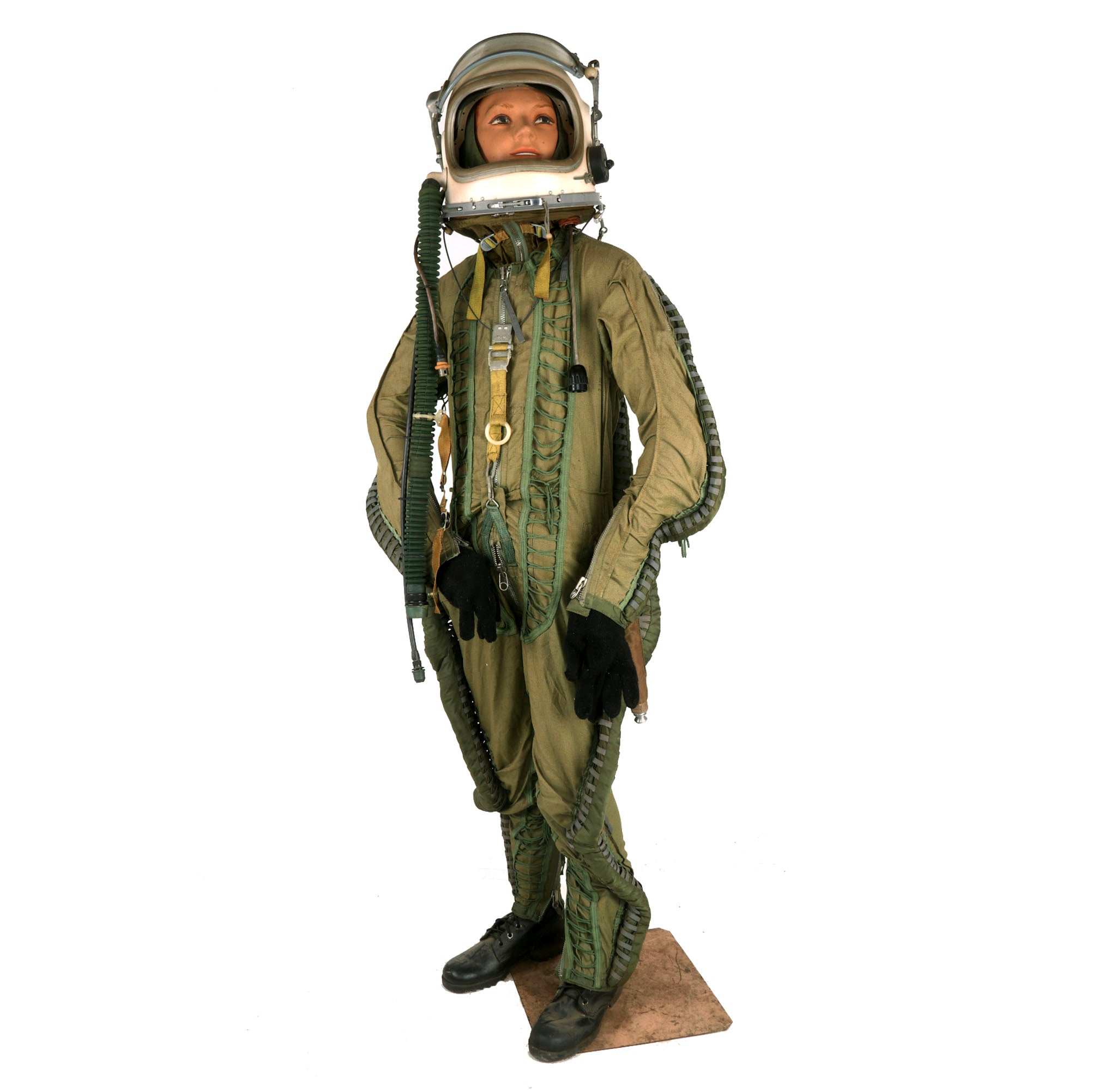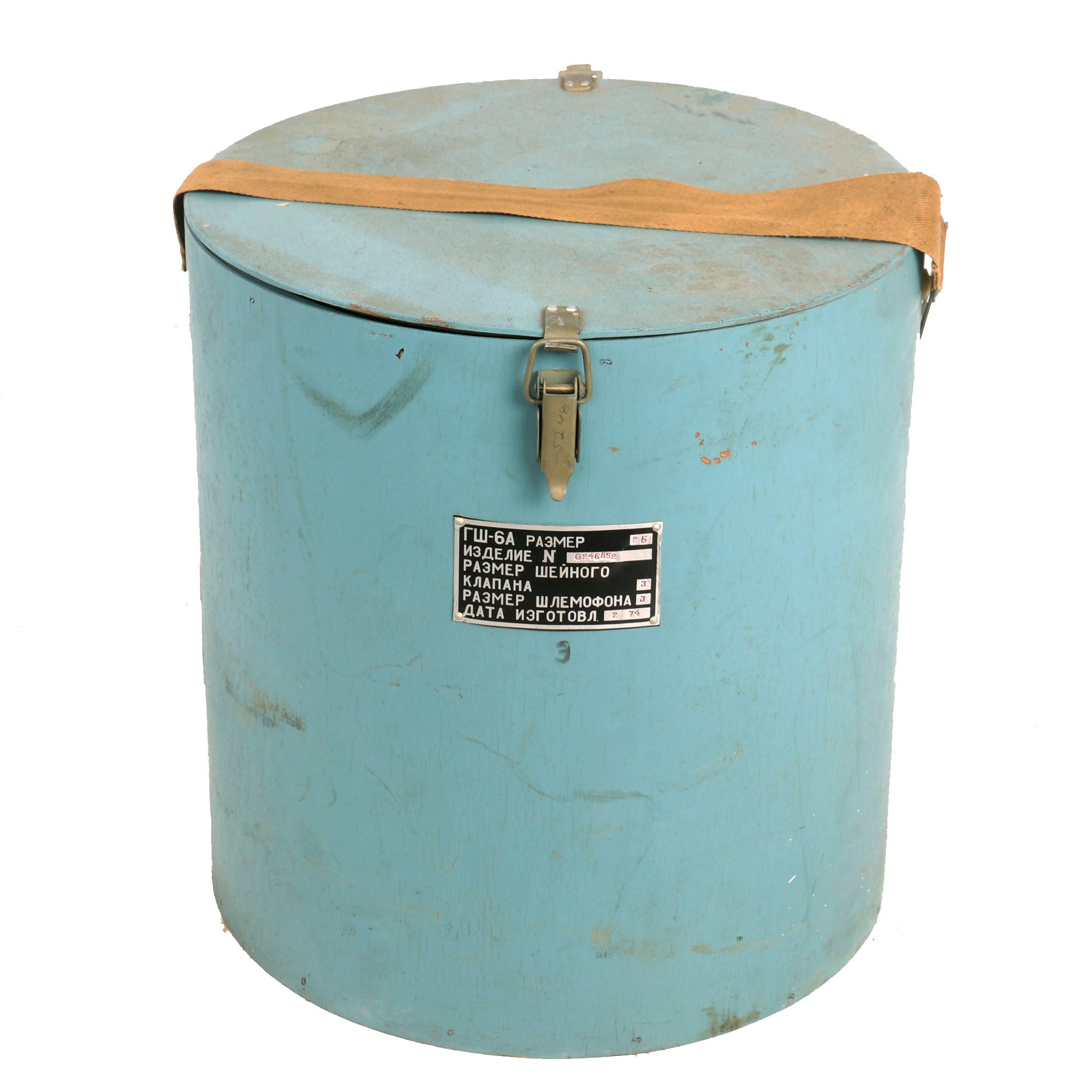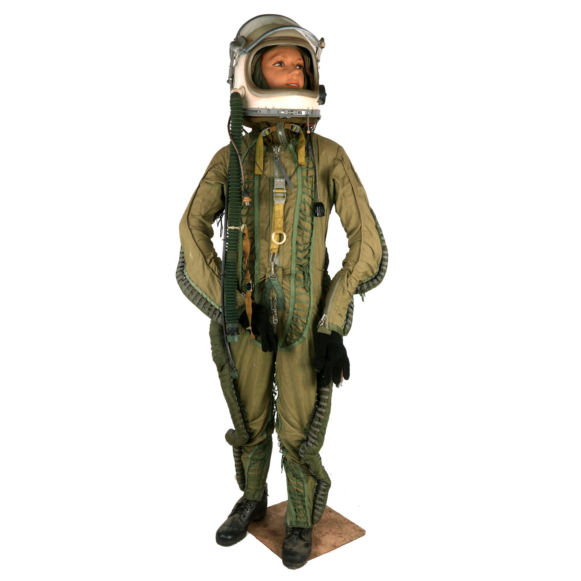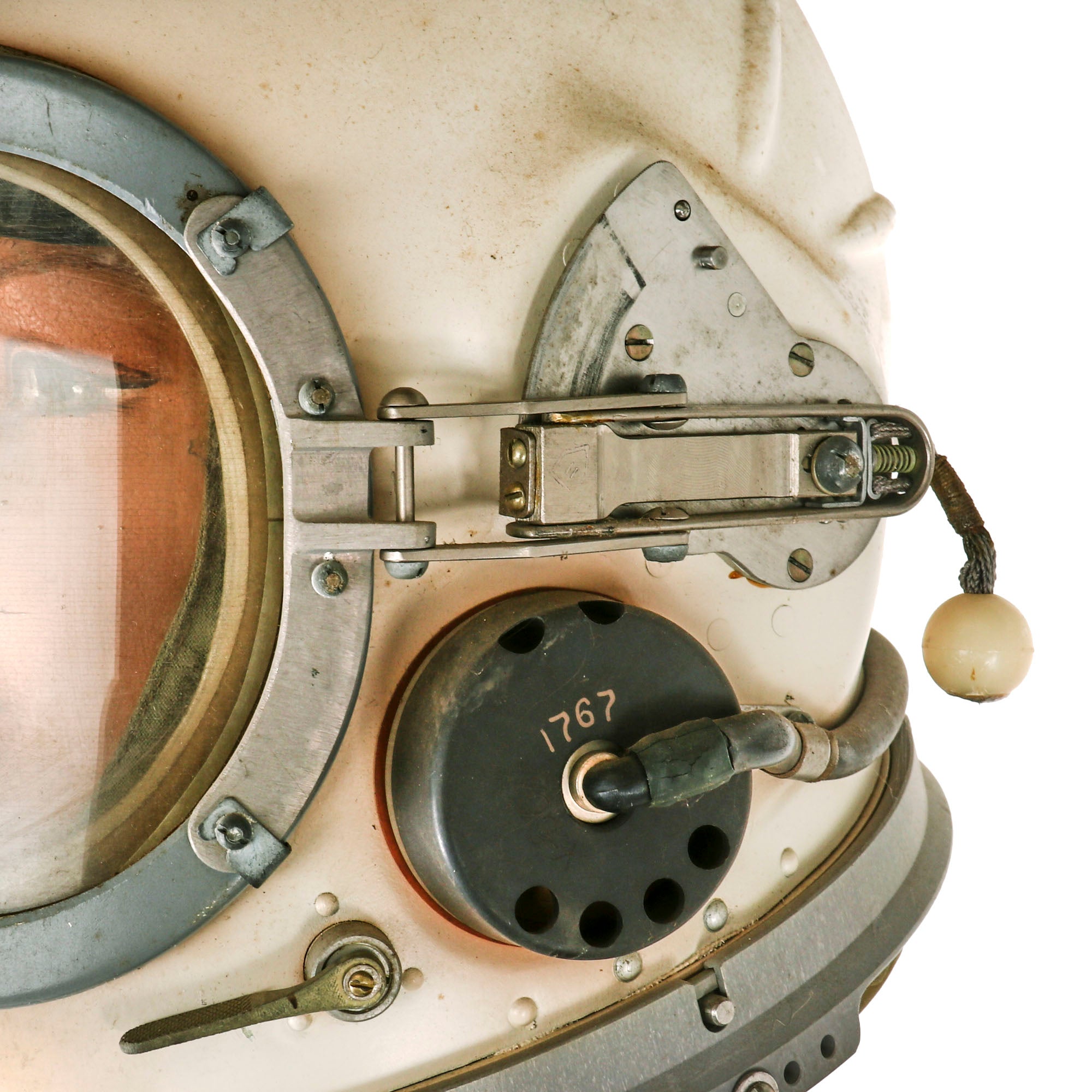 This example is offered in very good condition. Used in the early Russian space program and when flying at extremely high altitudes, this GSh-6A (Germoshelm 6A) high-altitude helmet features a retractable inner sun visor and the locking ring worn at the pilot’s neck with the latex dam that fits snugly onto the pilot’s upper body. Overall a very nice complete and well marked helmet. It has the rubber neck gasket as well, though the rubber has torn and deteriorated somewhat.