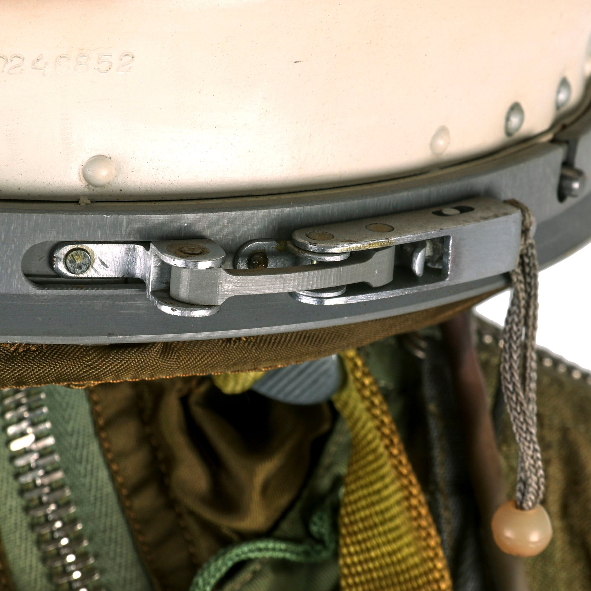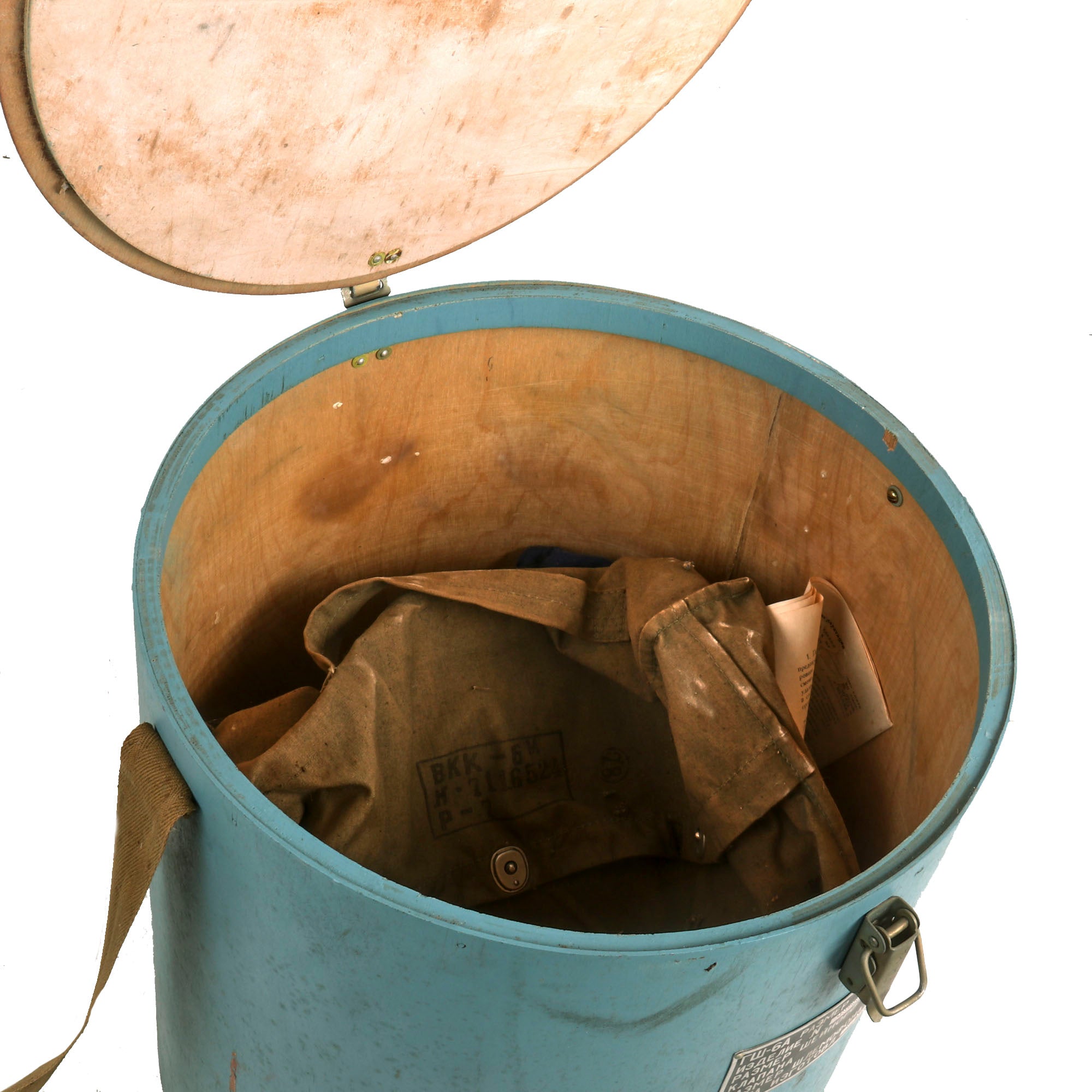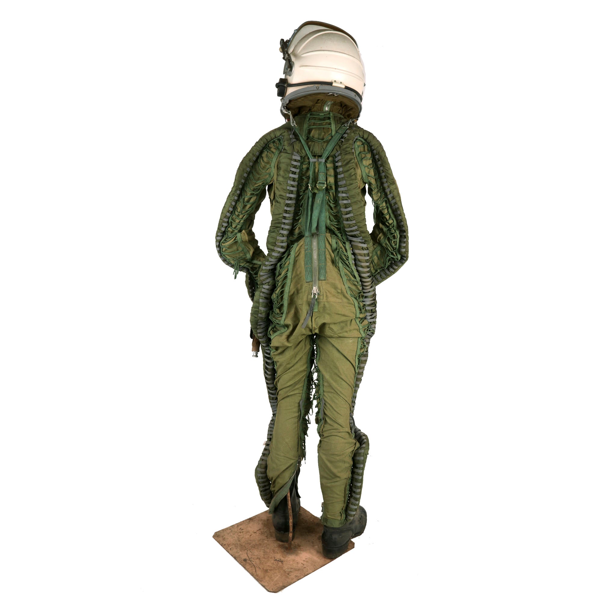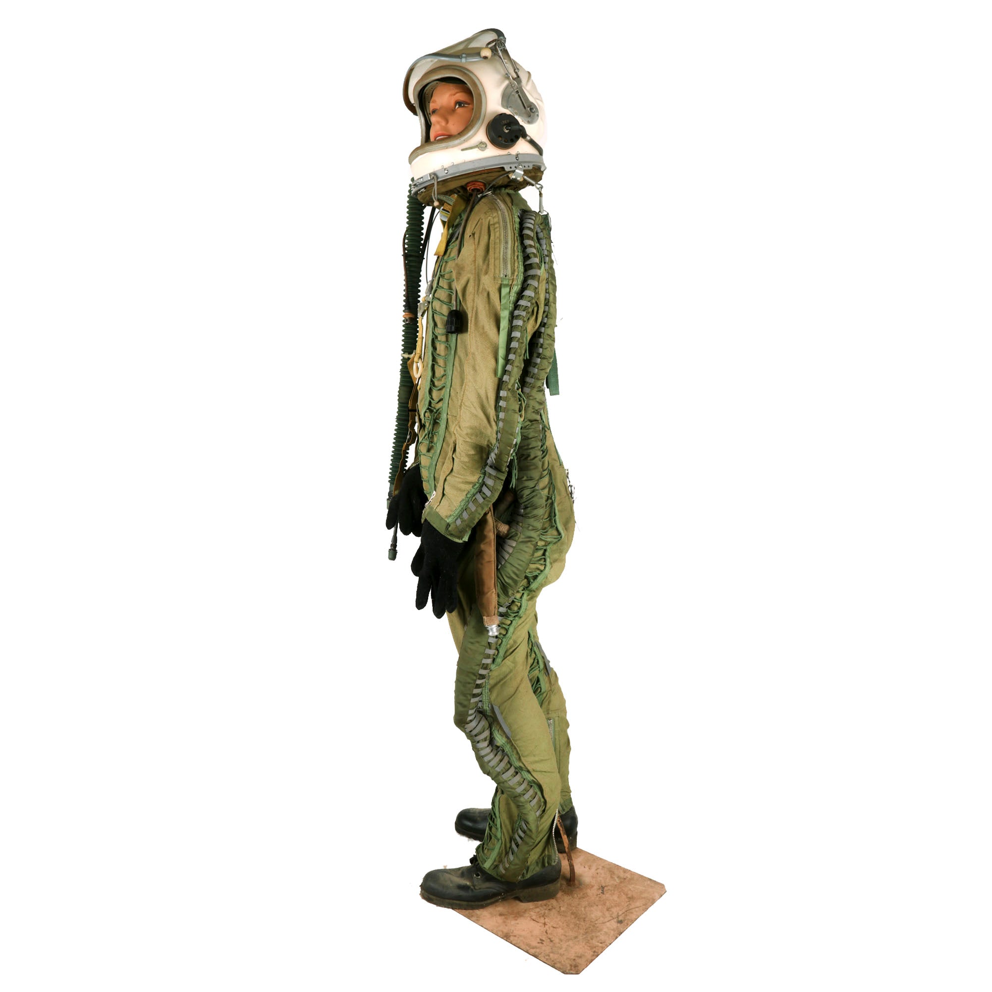 This example is offered in very good condition. Used in the early Russian space program and when flying at extremely high altitudes, this GSh-6A (Germoshelm 6A) high-altitude helmet features a retractable inner sun visor and the locking ring worn at the pilot’s neck with the latex dam that fits snugly onto the pilot’s upper body. Overall a very nice complete and well marked helmet. It has the rubber neck gasket as well, though the rubber has torn and deteriorated somewhat.