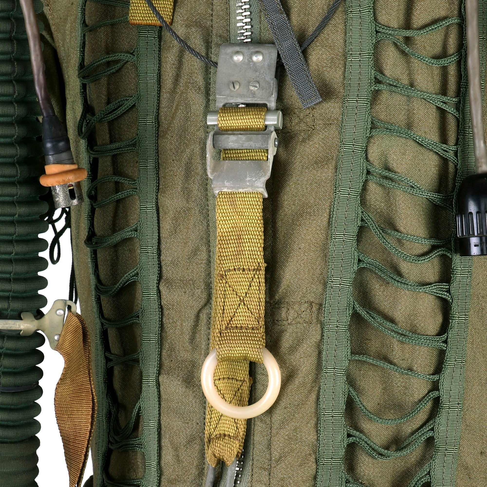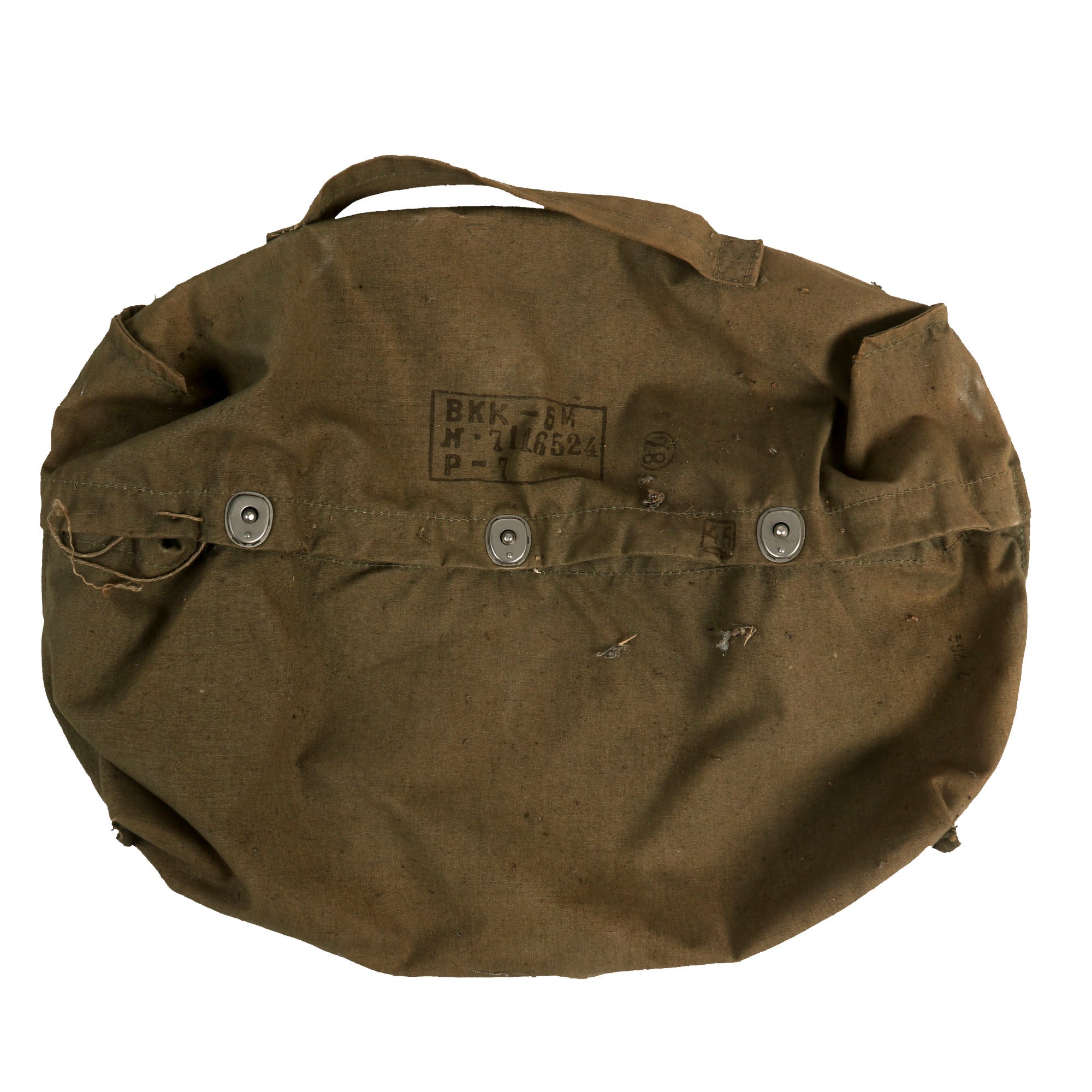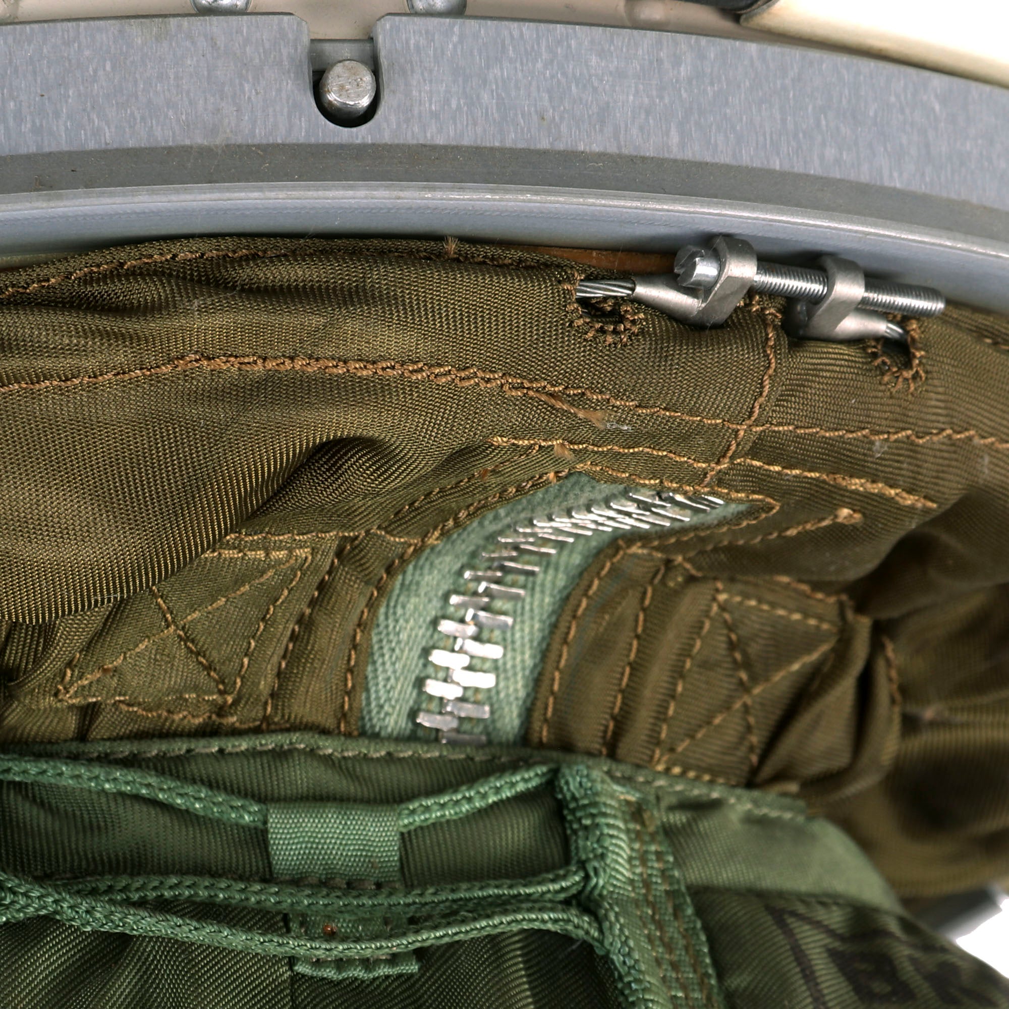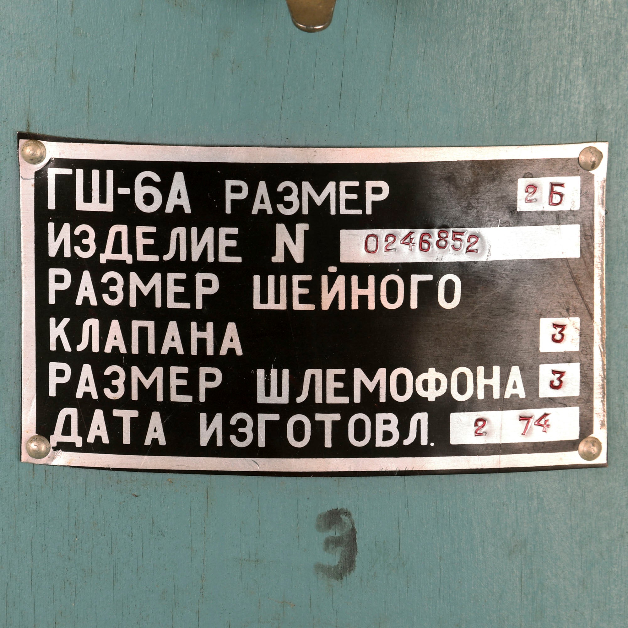 This example is offered in very good condition. Used in the early Russian space program and when flying at extremely high altitudes, this GSh-6A (Germoshelm 6A) high-altitude helmet features a retractable inner sun visor and the locking ring worn at the pilot’s neck with the latex dam that fits snugly onto the pilot’s upper body. Overall a very nice complete and well marked helmet. It has the rubber neck gasket as well, though the rubber has torn and deteriorated somewhat.