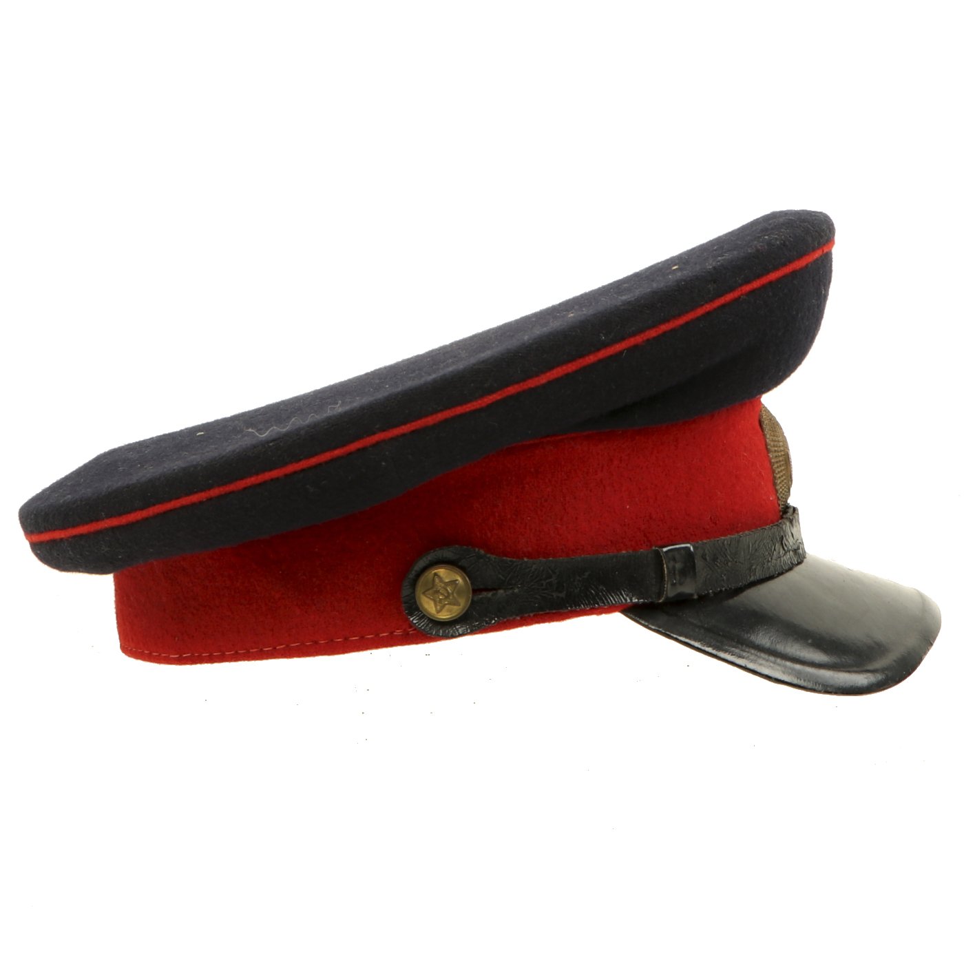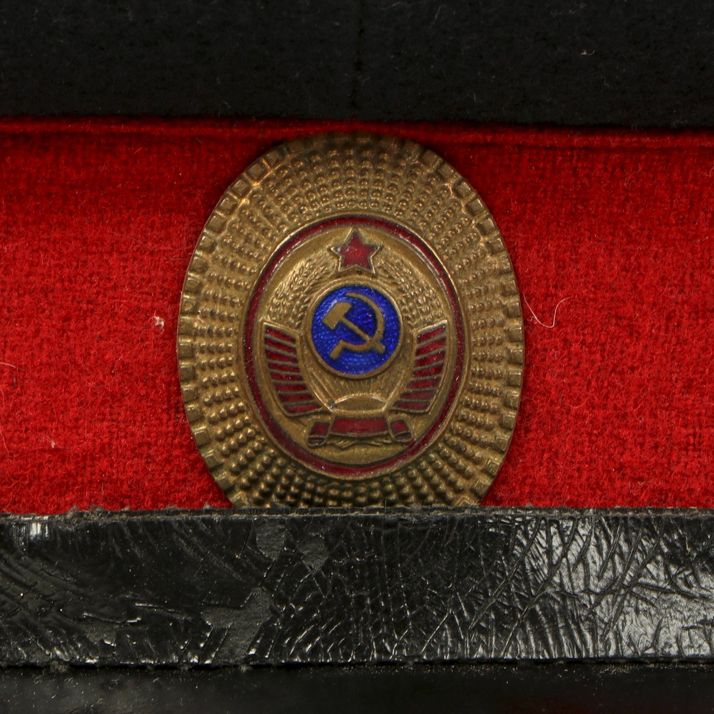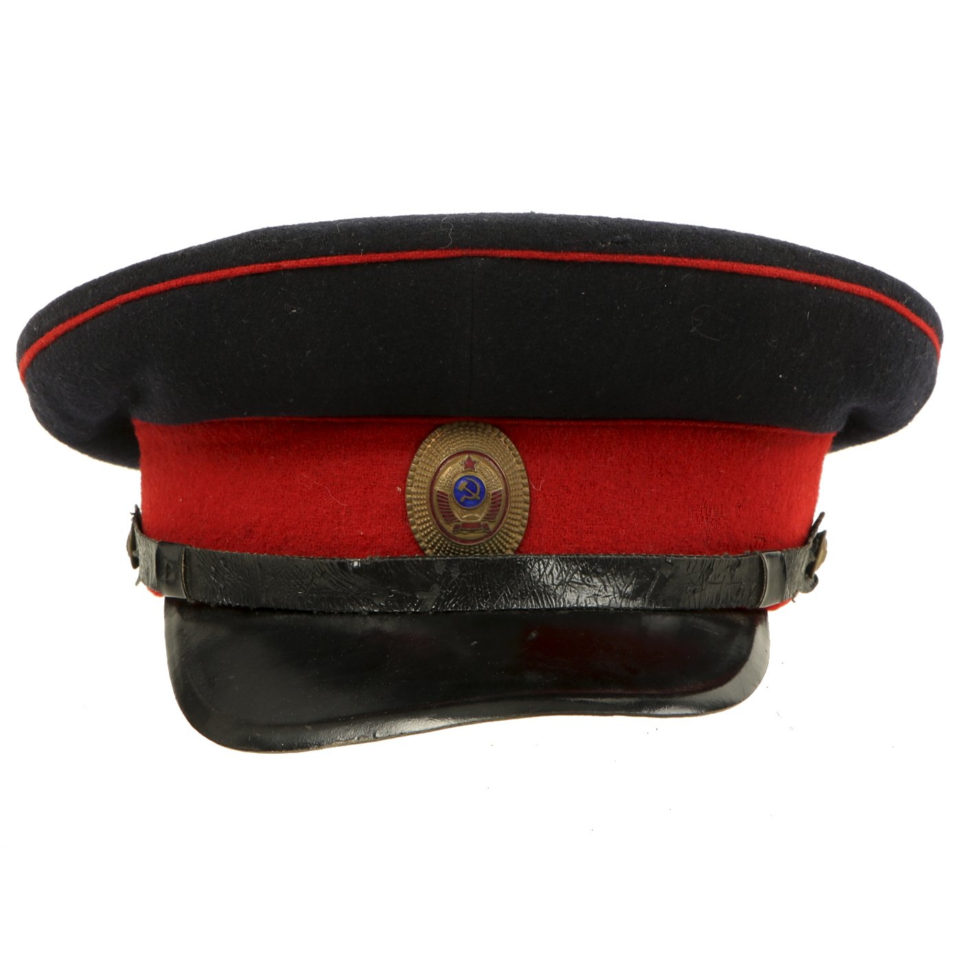 In 1947, the Soviet Militia changed their uniform colors to dark blue with red as the secondary color but cockades were again changed in 1958. This 1960s era cap has a dark blue napped wool crown with red wool band and piping. All personnel below the rank of Commissioner wore the black oilcloth chinstrap and gilt metal buttons shown here during this period. The visor is black-lacquered fiberboard of semi-circular shape.