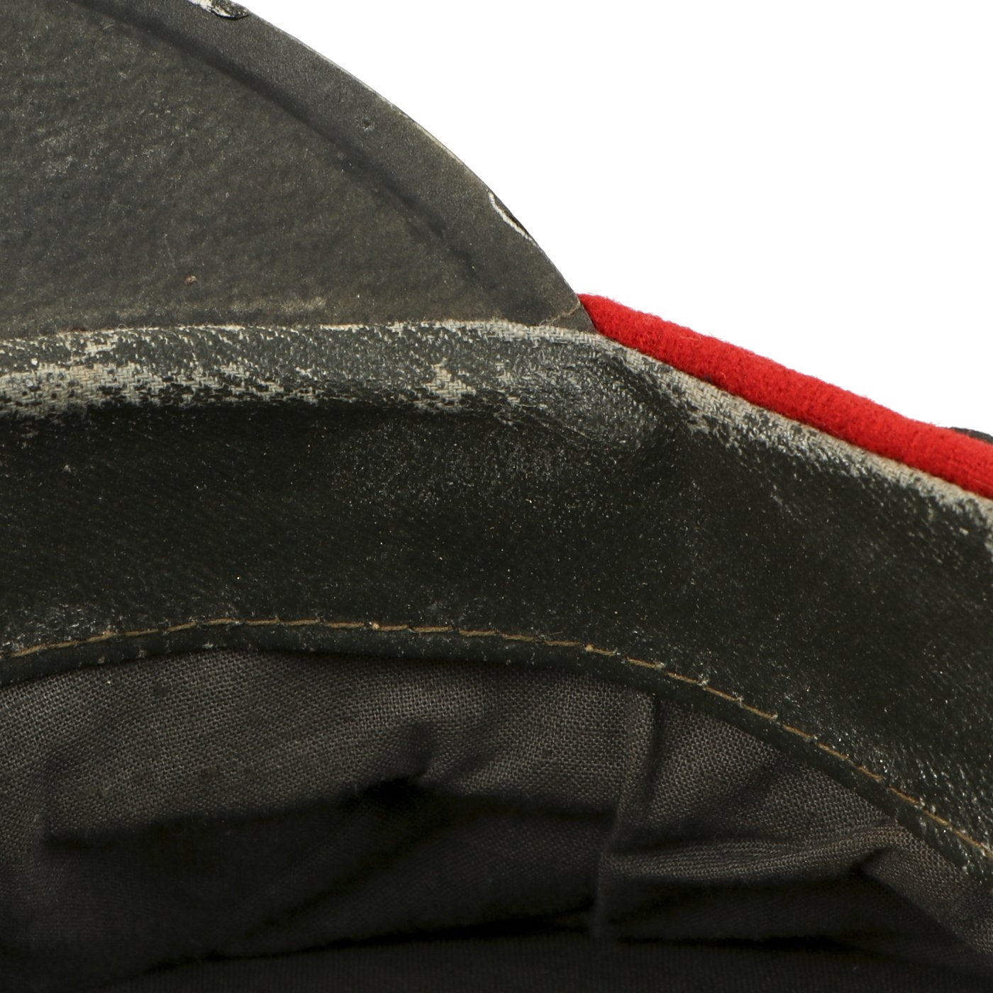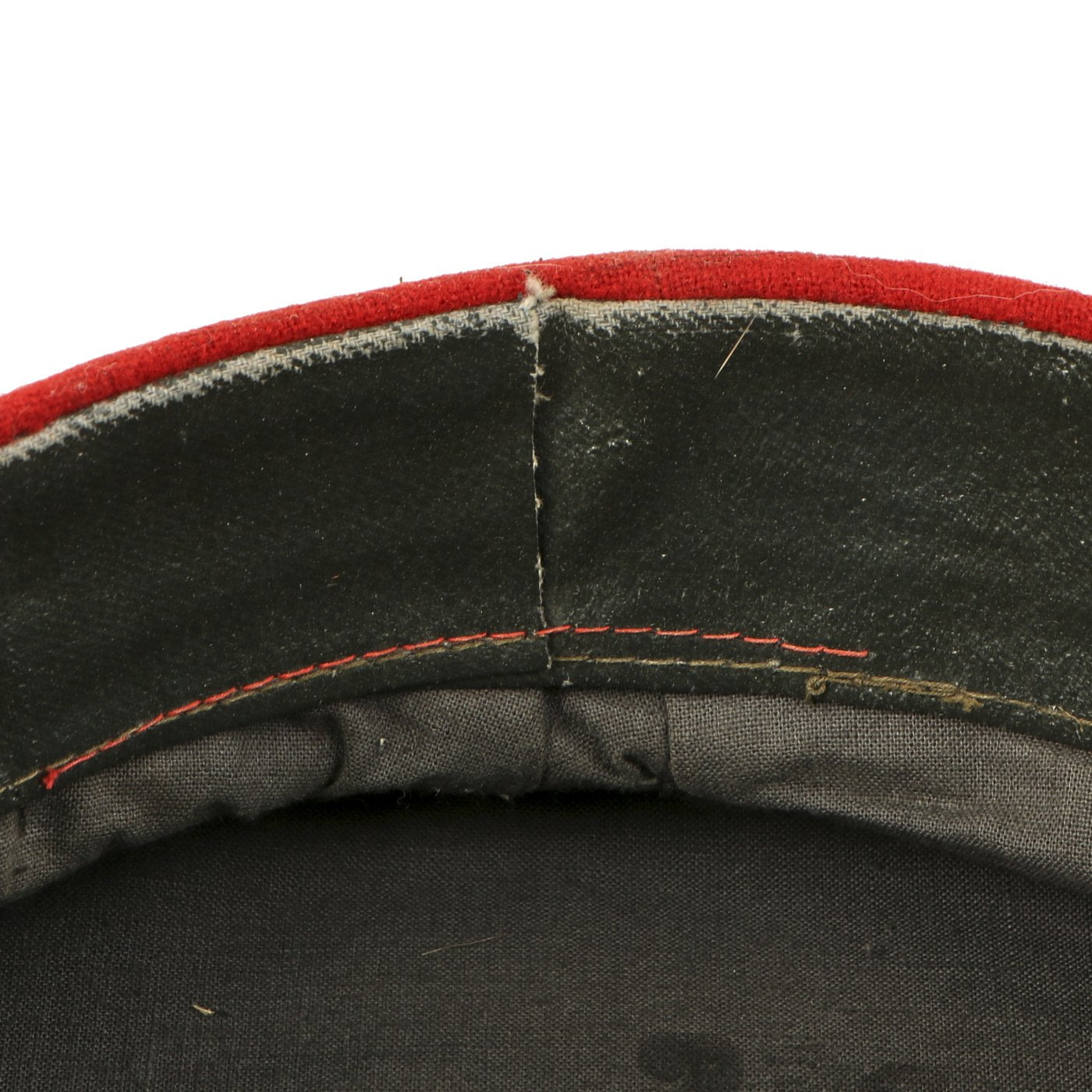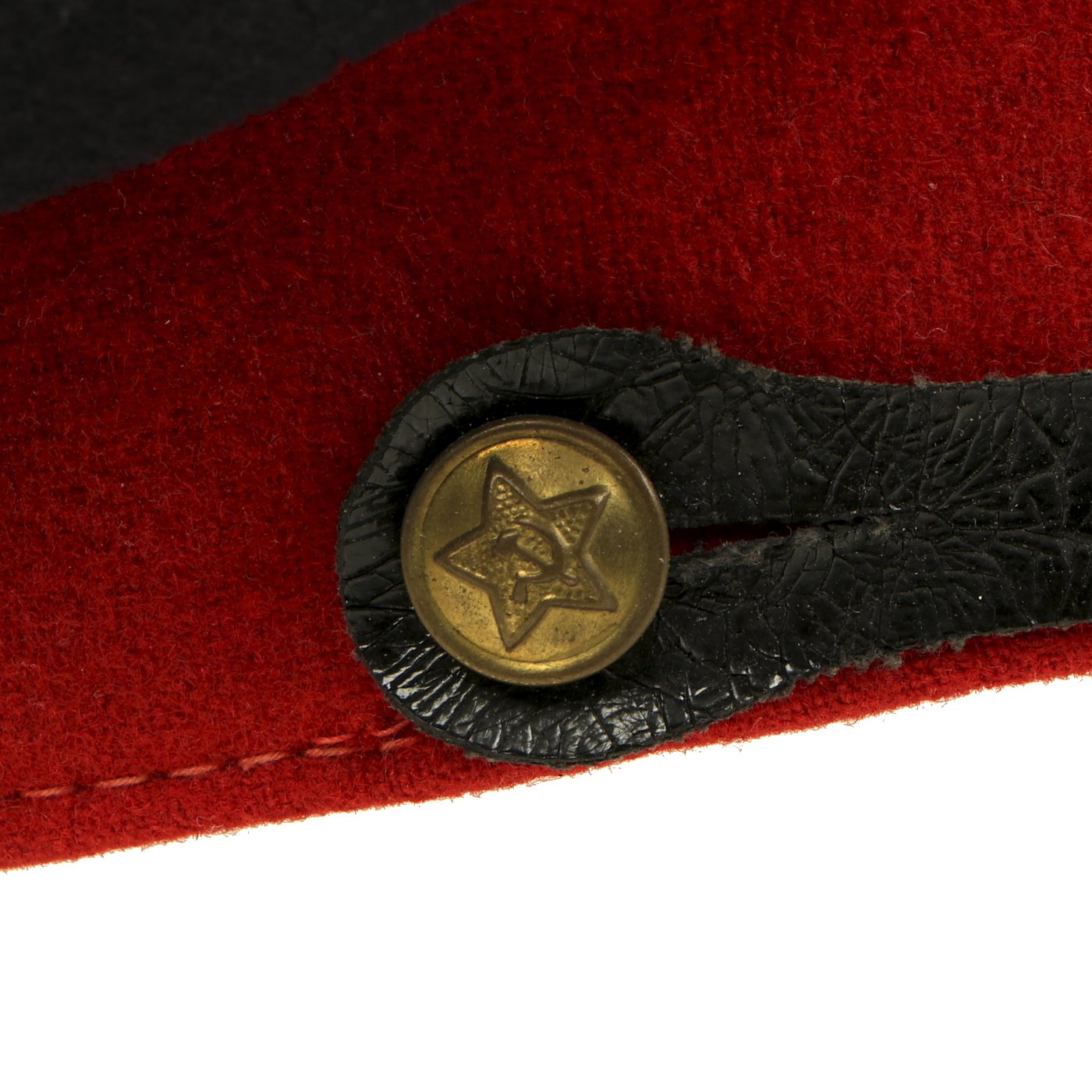 In 1947, the Soviet Militia changed their uniform colors to dark blue with red as the secondary color but cockades were again changed in 1958. This 1960s era cap has a dark blue napped wool crown with red wool band and piping. All personnel below the rank of Commissioner wore the black oilcloth chinstrap and gilt metal buttons shown here during this period. The visor is black-lacquered fiberboard of semi-circular shape.