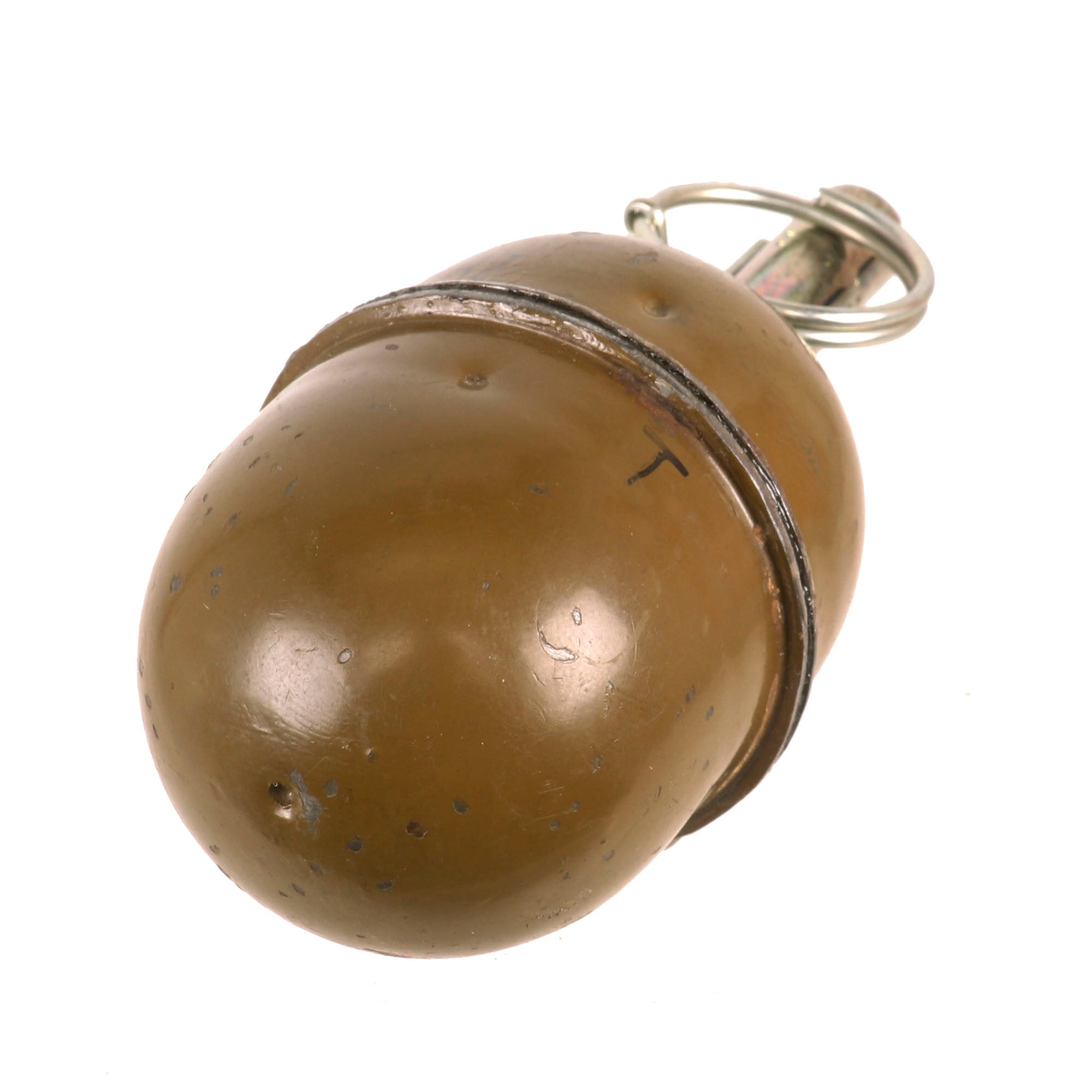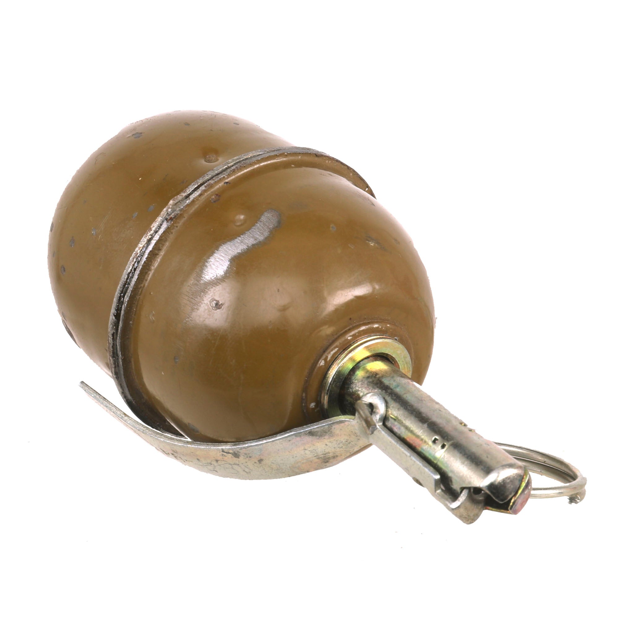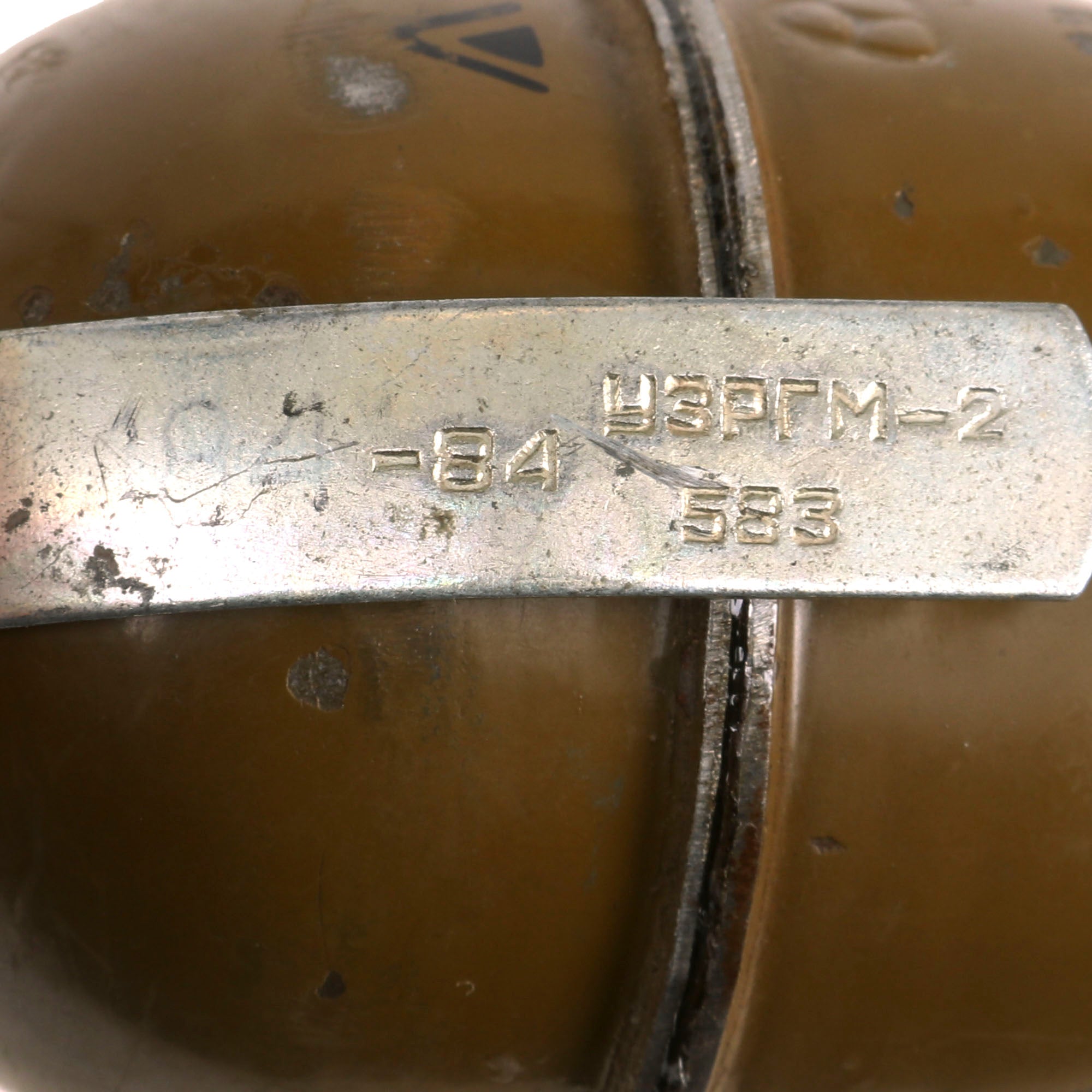 Original Item: Only One Available. The URG-N is a reusable training model of the RGD-5 with a modified fuze containing a tiny explosive charge which simulates the detonation of the grenade. This example retains its original brown paint and markings, including 170-82 next to a maker’s mark. The spoon also retains several markings as well.