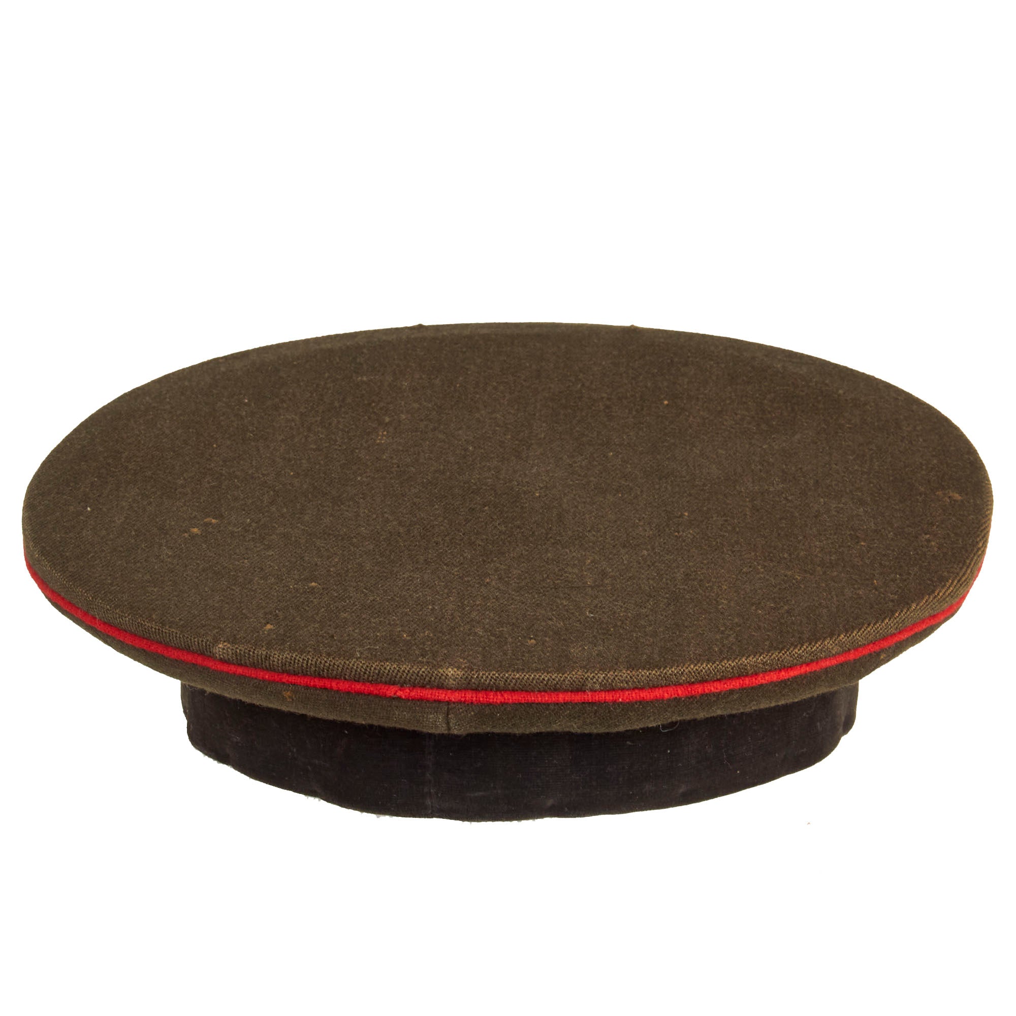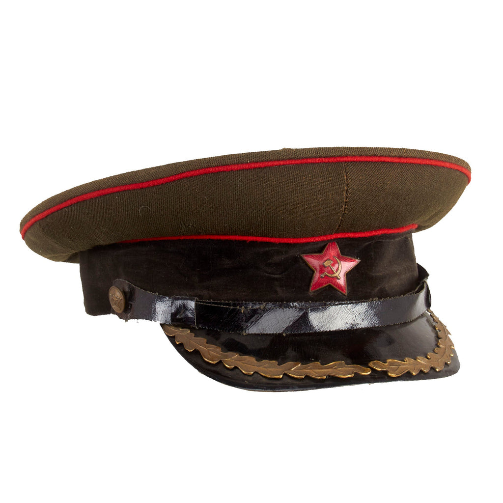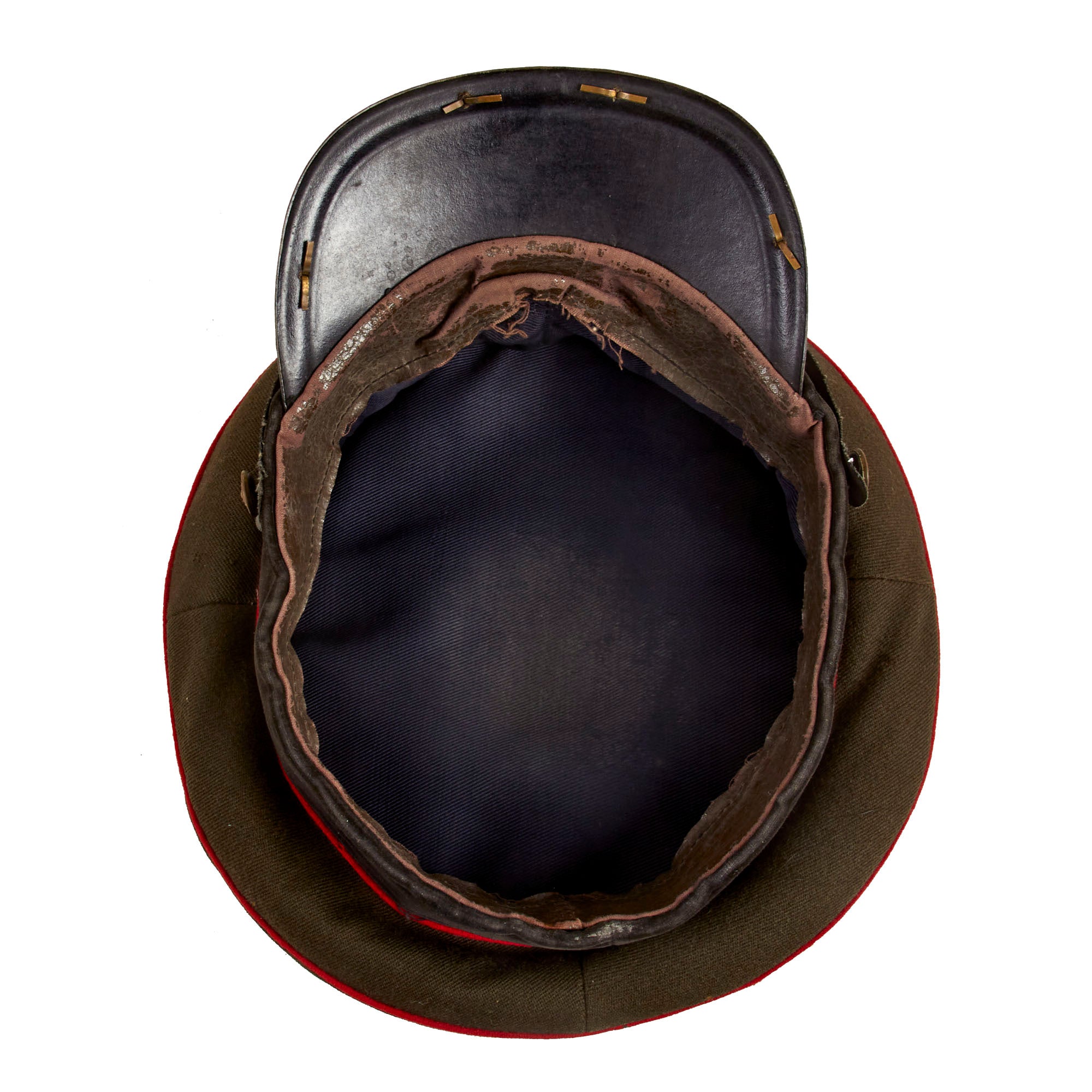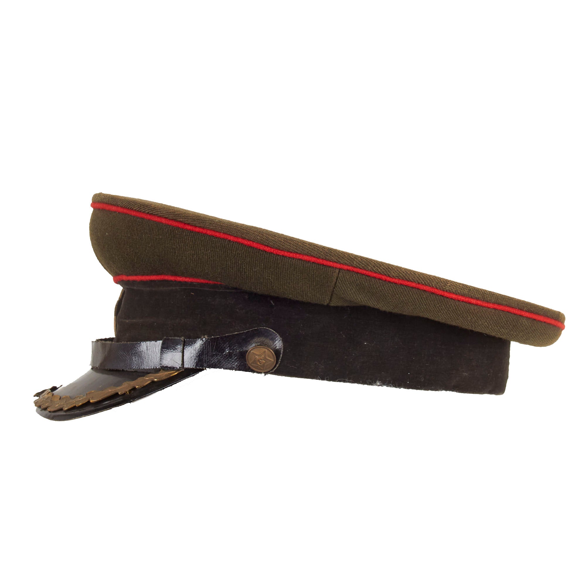 Original Item: Only One Available. Russian M35 caps began the practice of identifying the wearer's arm or service (or branch) by differing band and piping colors. These caps were also characterized by spade-shaped (or square edged) visors, although rounded (semi-circular) visors were also worn infrequently, especially by those would could afford to have custom-made caps, such as generals. The crowns of these caps were relatively small and round, with a low rise in the front.