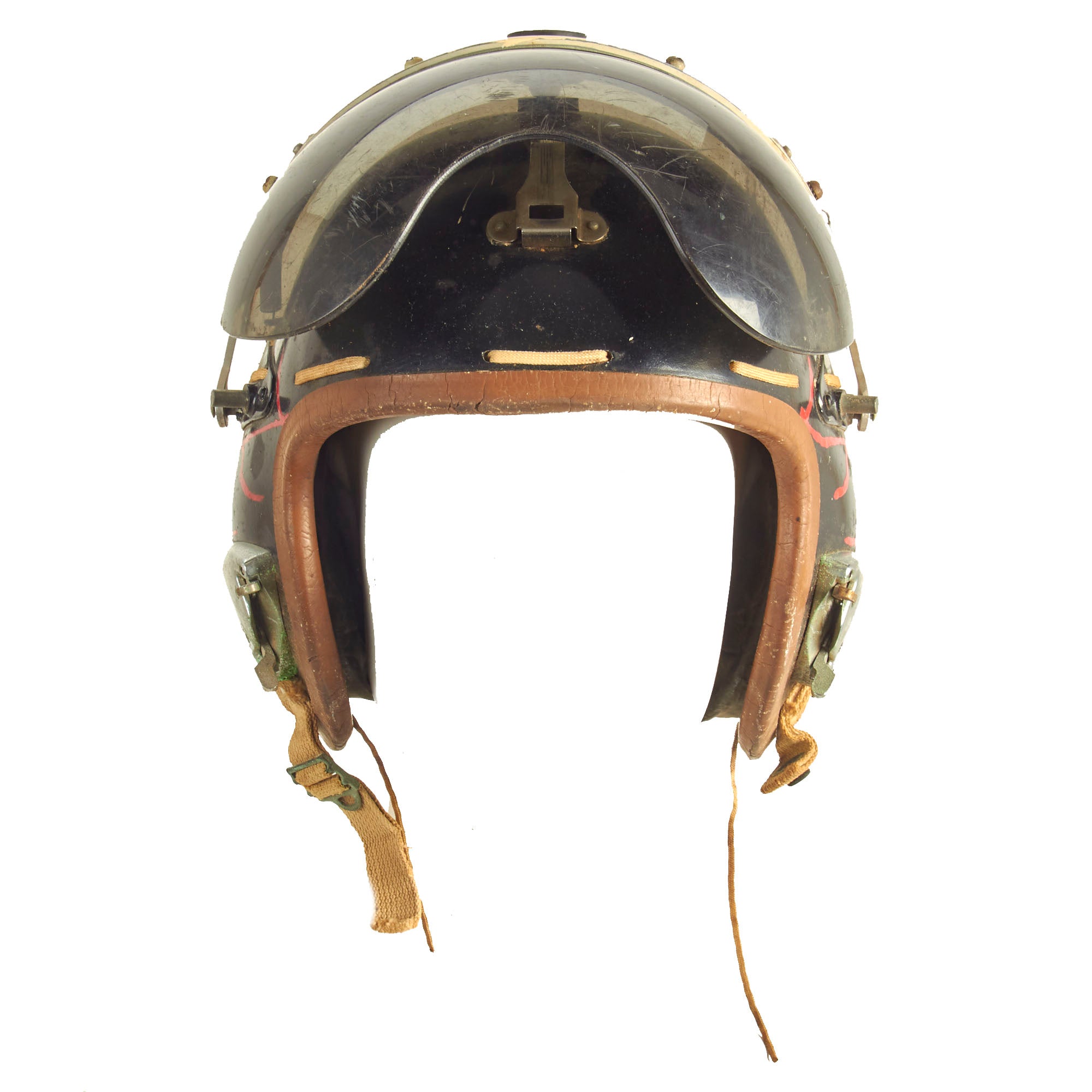 The USAF P-4 flight helmet was standardized in 1955 as a continuation of P-3 with improved avionics in order to make helmet headset communications and oxygen mask dynamic microphone compatible with aircraft intercommunication set AN AIC-10. the new H-75/AIC headset system was added as well as a new earphone cushions spring mounted and tethered to short nylon strings which protruded through the lateral helmet walls to be secured over a rubber over a rubber lock-nut and snubber bar. The P-4 was used with A-13A/MS22001 A-14 oxygen mask. The P-4A standardized in 1957 has a new visor mechanism that replace the side latching design with a tracked visor securing system actuated by grasping a central rubber knob and pulling the visor down into position. The newly assembled P-4A helmets made use of the new fiberglass shell material that replaced the earlier phenolic resin and molded cotton duck material.