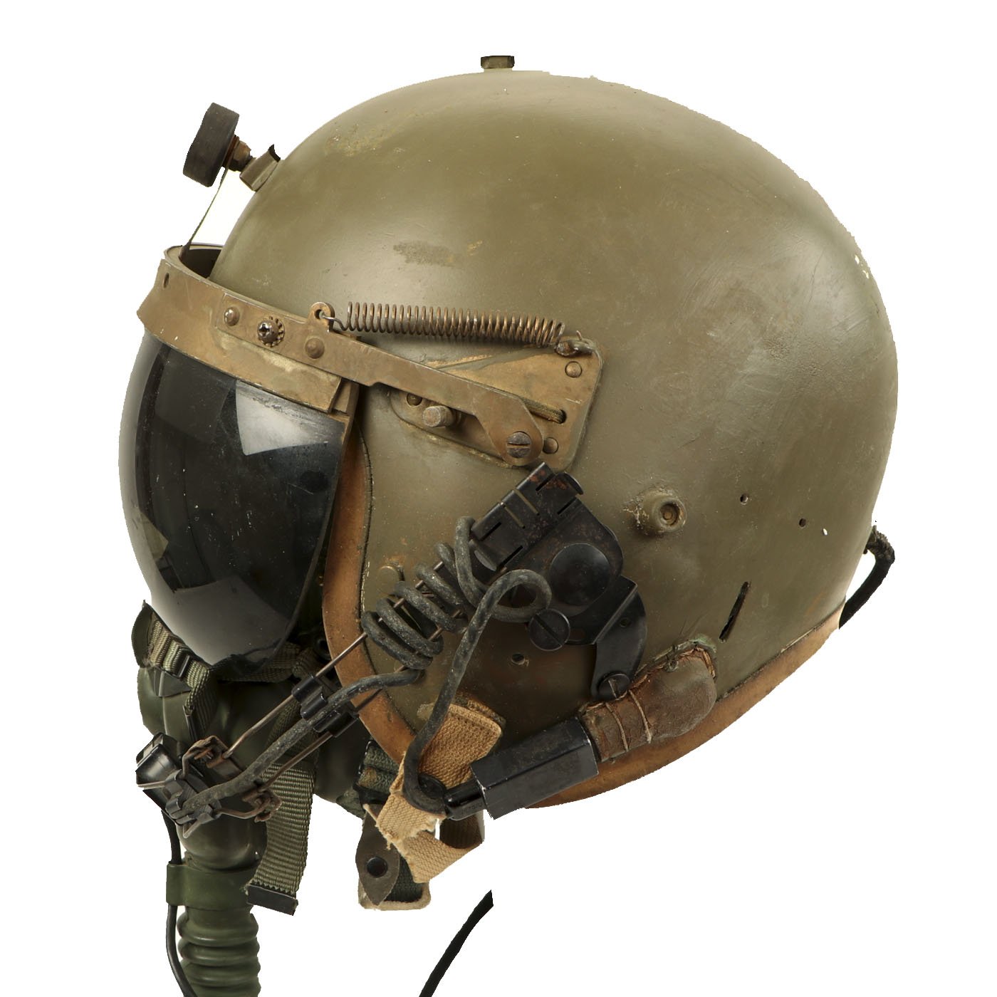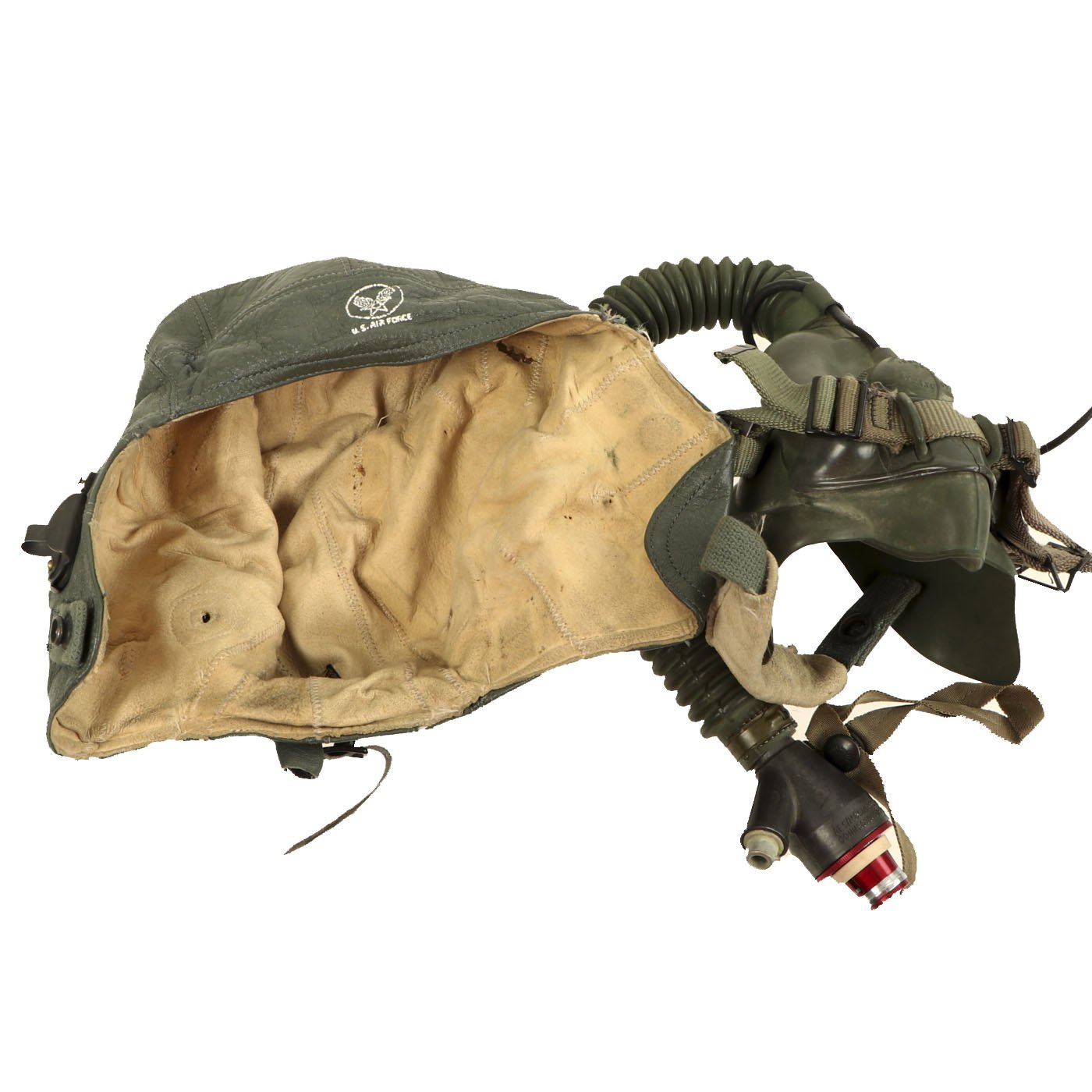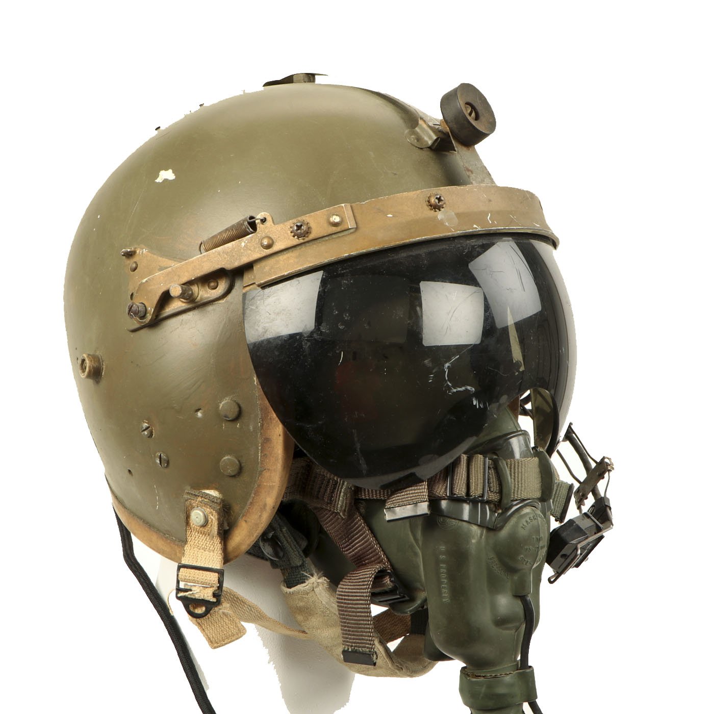 Original Items: Only One Available. This is an very good condition complete 1957-1959 U.S. Air Force size large Gentex P-4A flight helmet that comes complete with internal web liner and pull down spring loaded tint visor. All parts are in very good condition. This is a rare complete helmet. Also included is a size large Type A-13 Leather flying helmet which could be worn beneath the P-4A and a MS22001 Aircraft Pilot Oxygen Mask in size small.