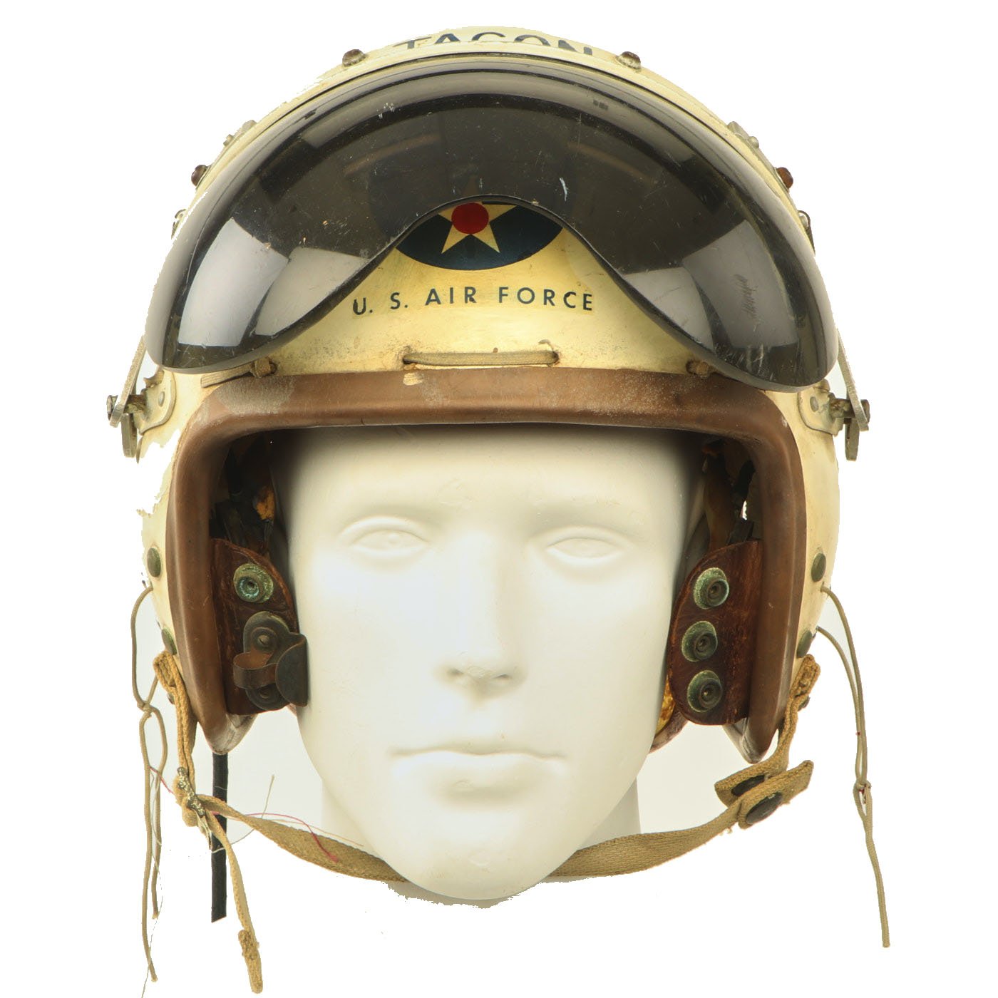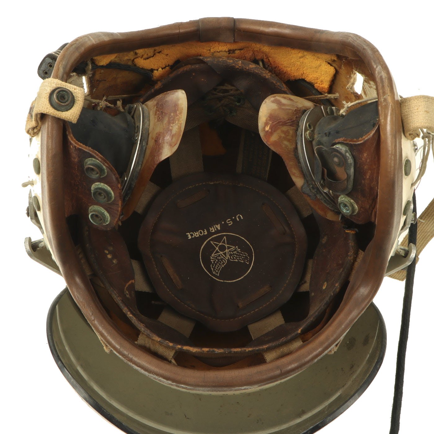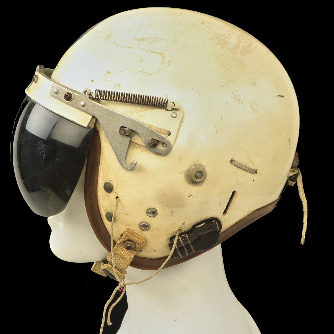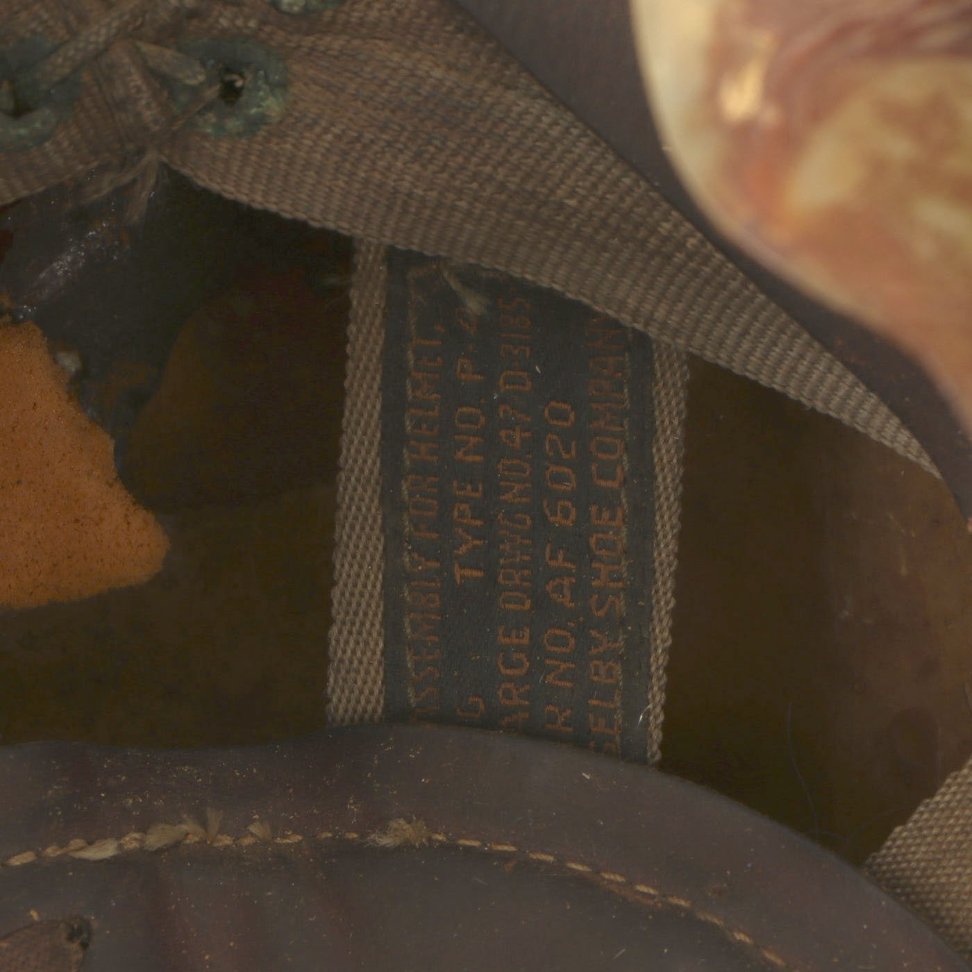 Original Items: Only One Available. This is an excellent condition 1957-1959 U.S. Air Force size large P-4 flight helmet that comes complete with its pull down spring loaded tint visor. This helmet does have the plug on the left side for the mask microphone and ear receivers with cord. Inside there is a complete liner with original data tag manufactured by the Shelby Shoe Company. Overall condition is very good.