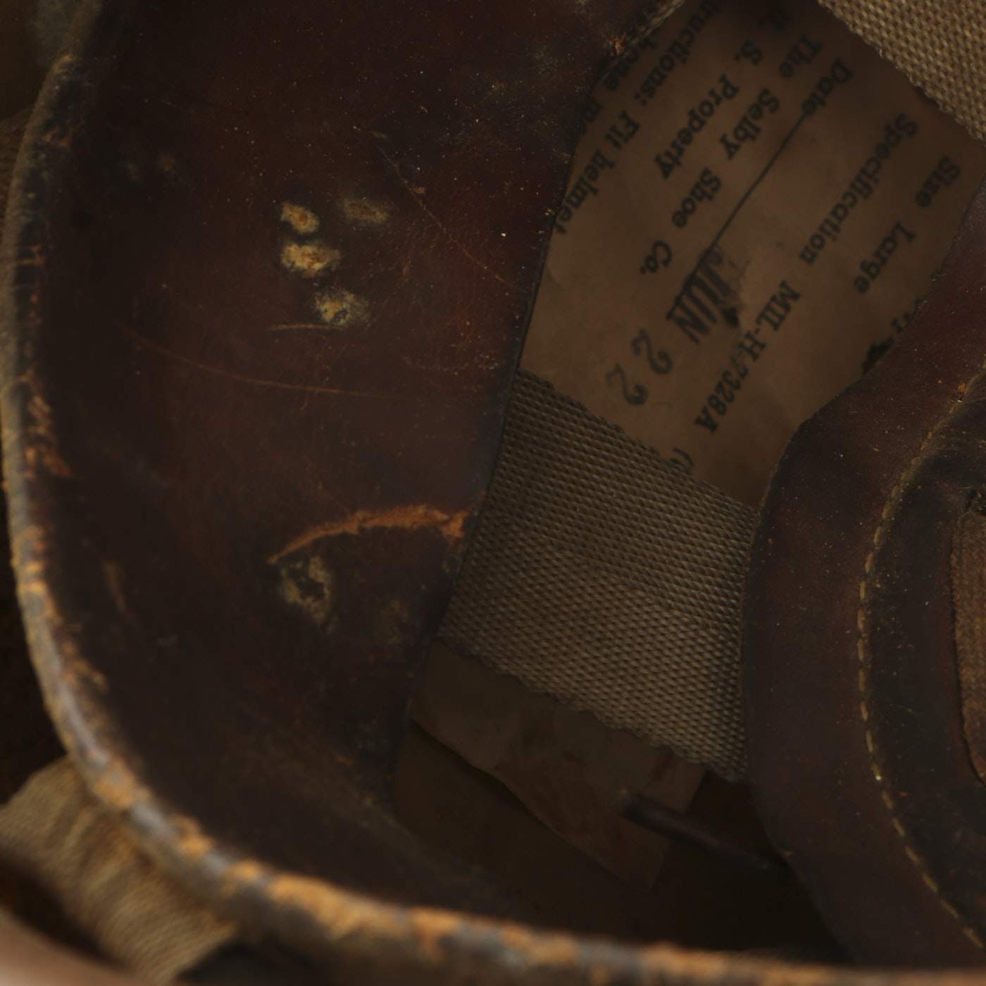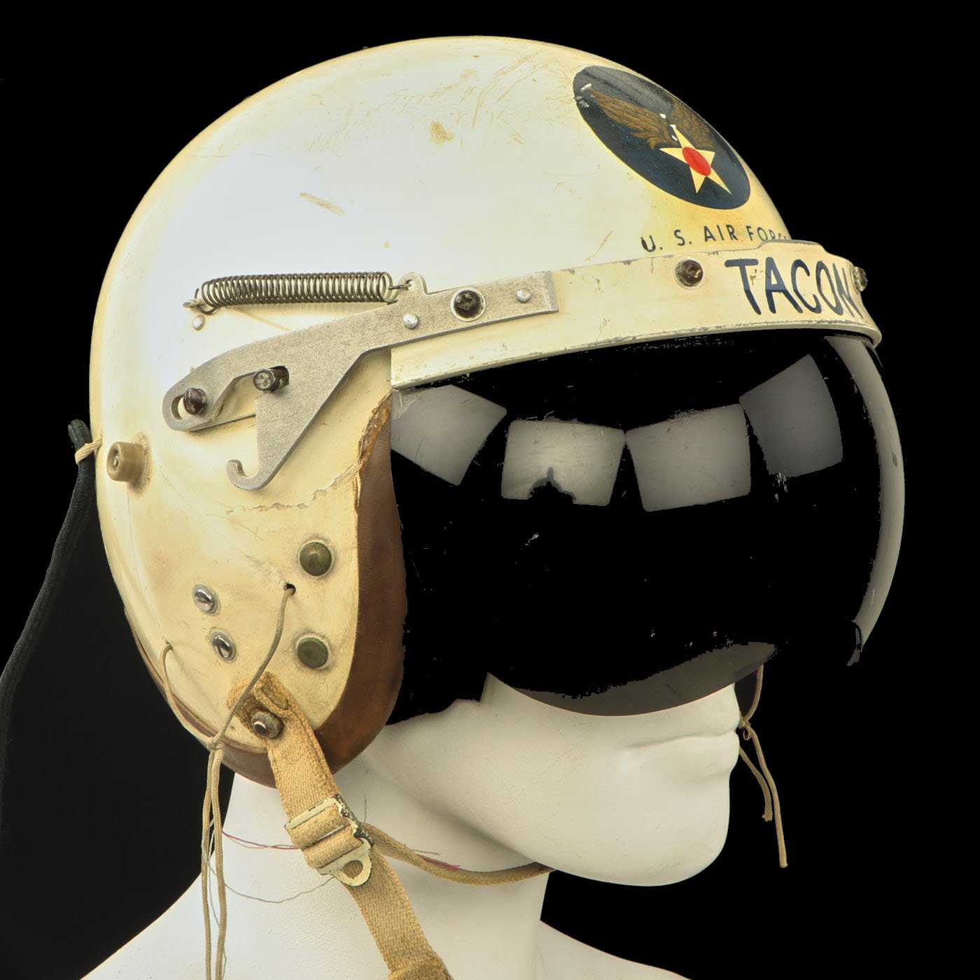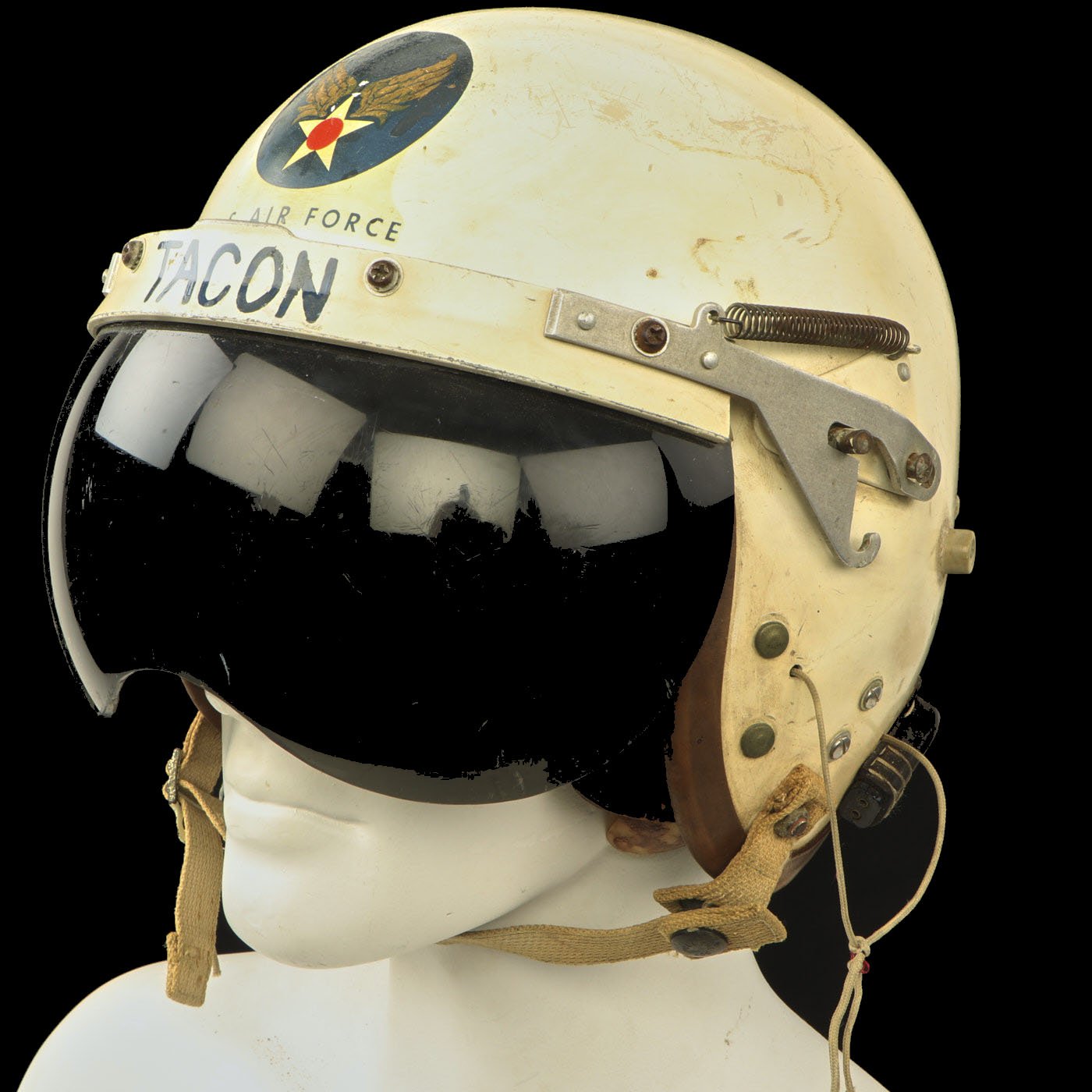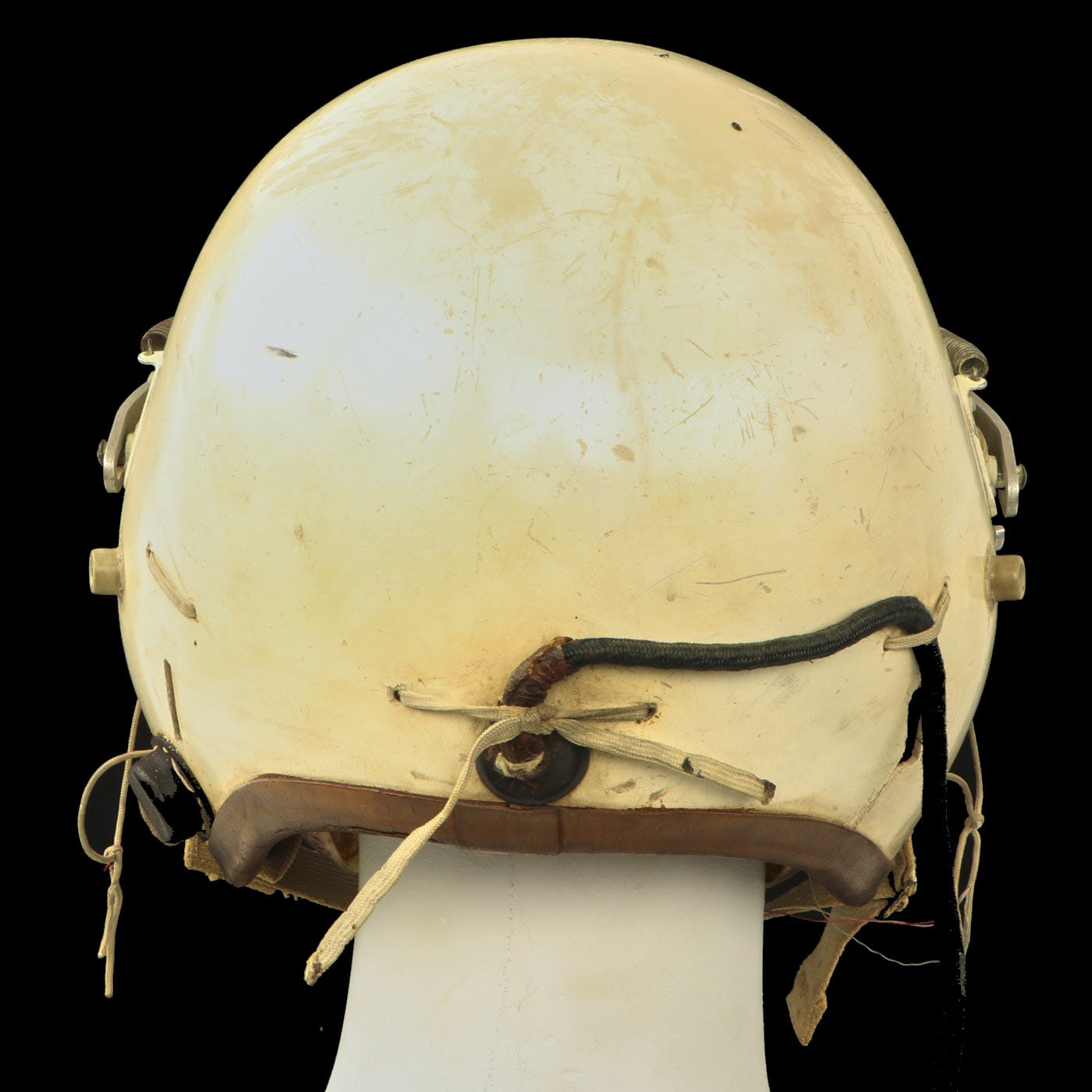 Original Items: Only One Available. This is an excellent condition 1957-1959 U.S. Air Force size large P-4 flight helmet that comes complete with its pull down spring loaded tint visor. This helmet does have the plug on the left side for the mask microphone and ear receivers with cord. Inside there is a complete liner with original data tag manufactured by the Shelby Shoe Company. Overall condition is very good.