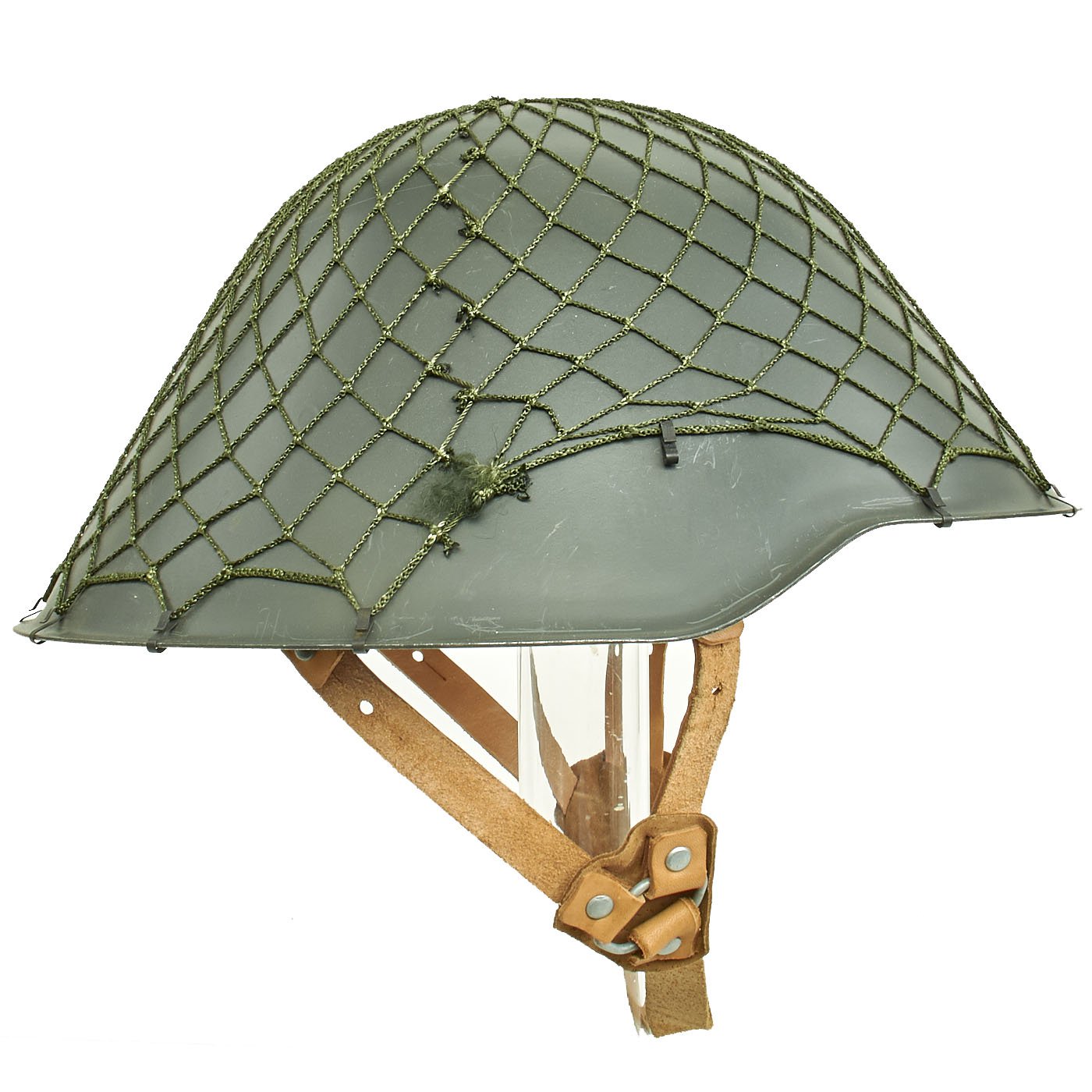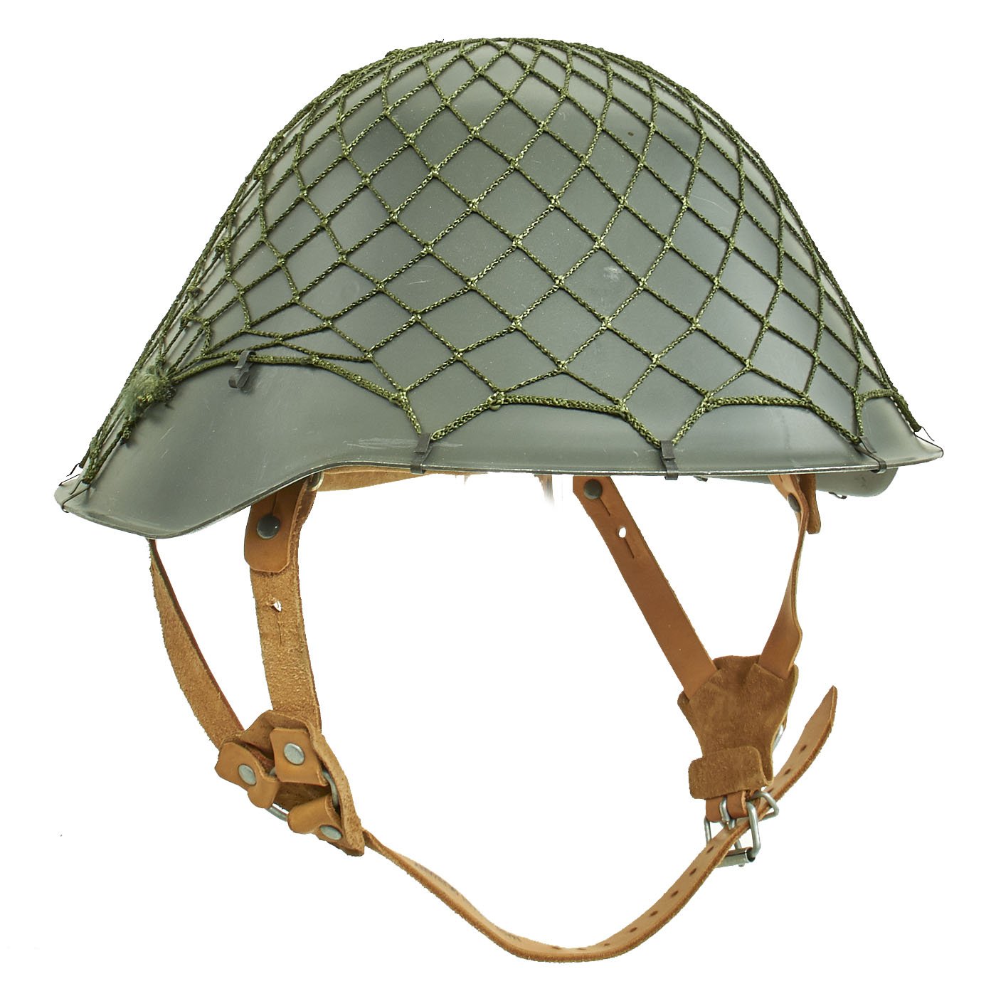Condition is excellent, and it shows no signs of use, just storage wear, so we believe it to be unissued. It comes with a lovely dark green synthetic fiber helmet net, held on with small metal clips.