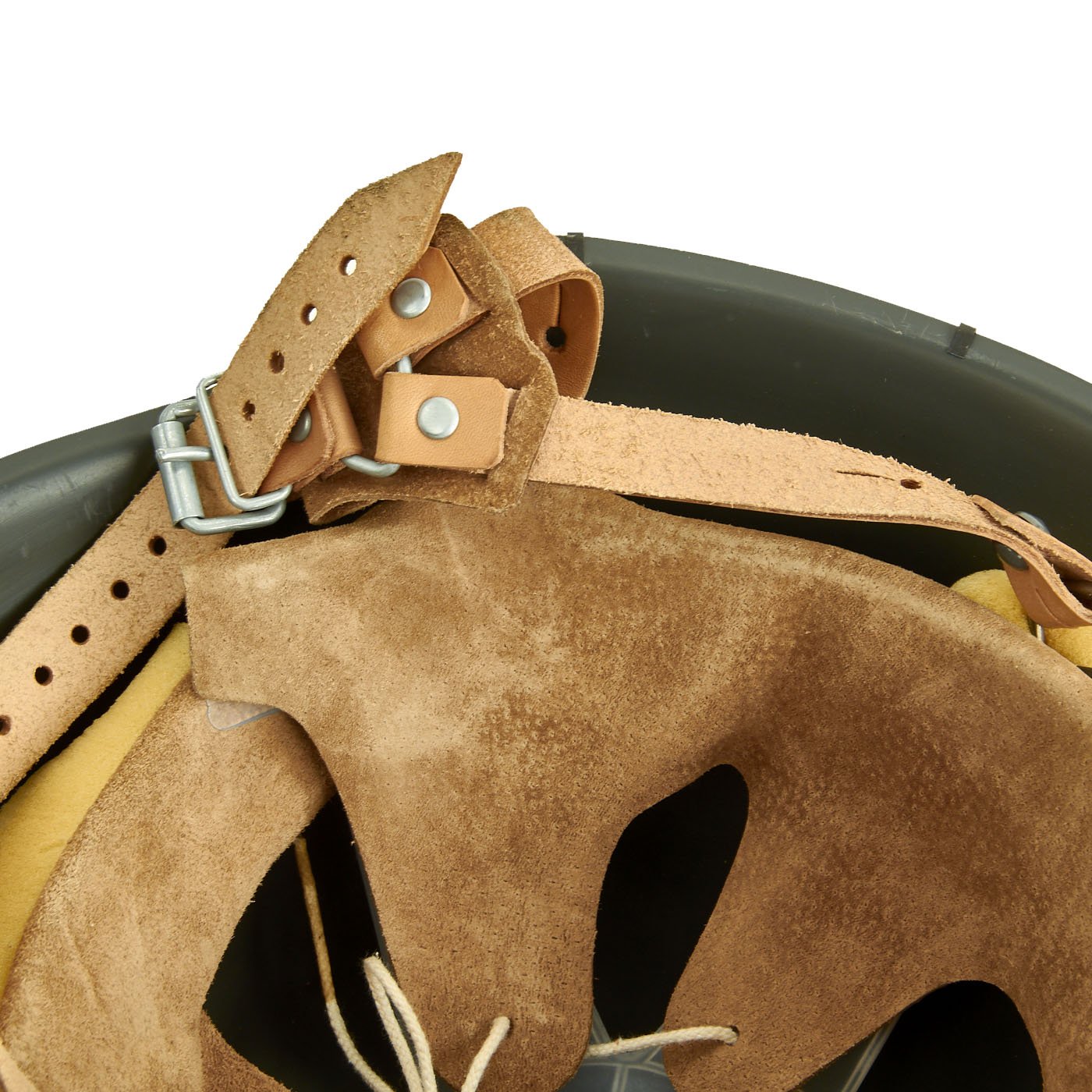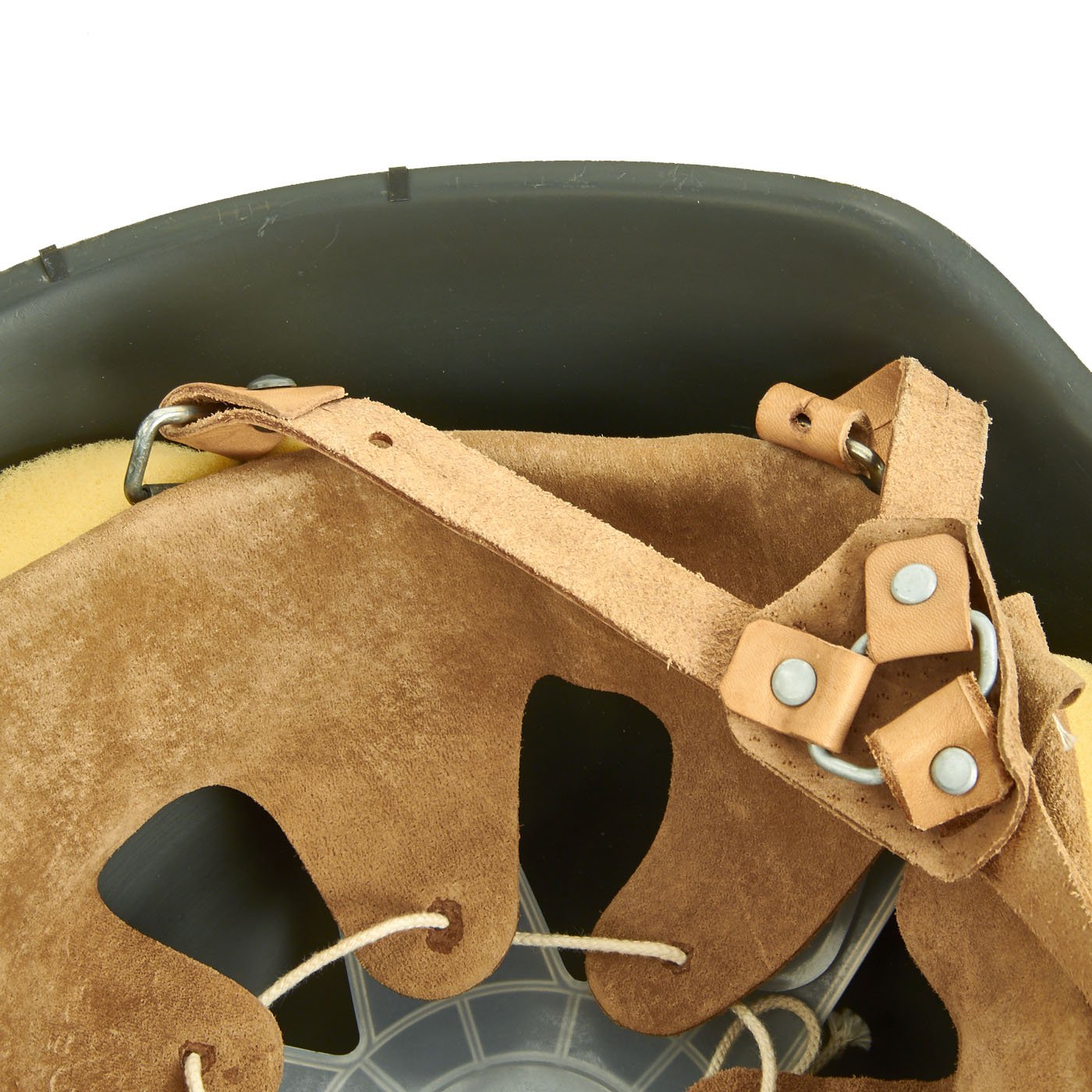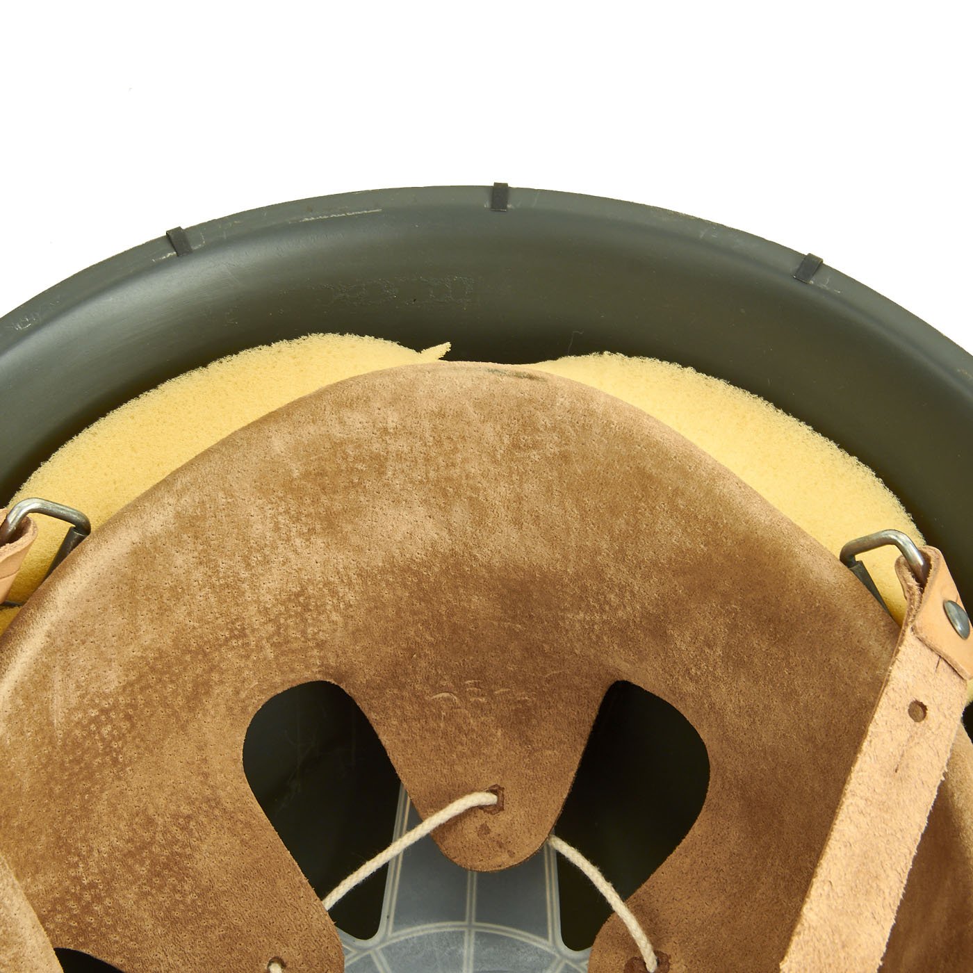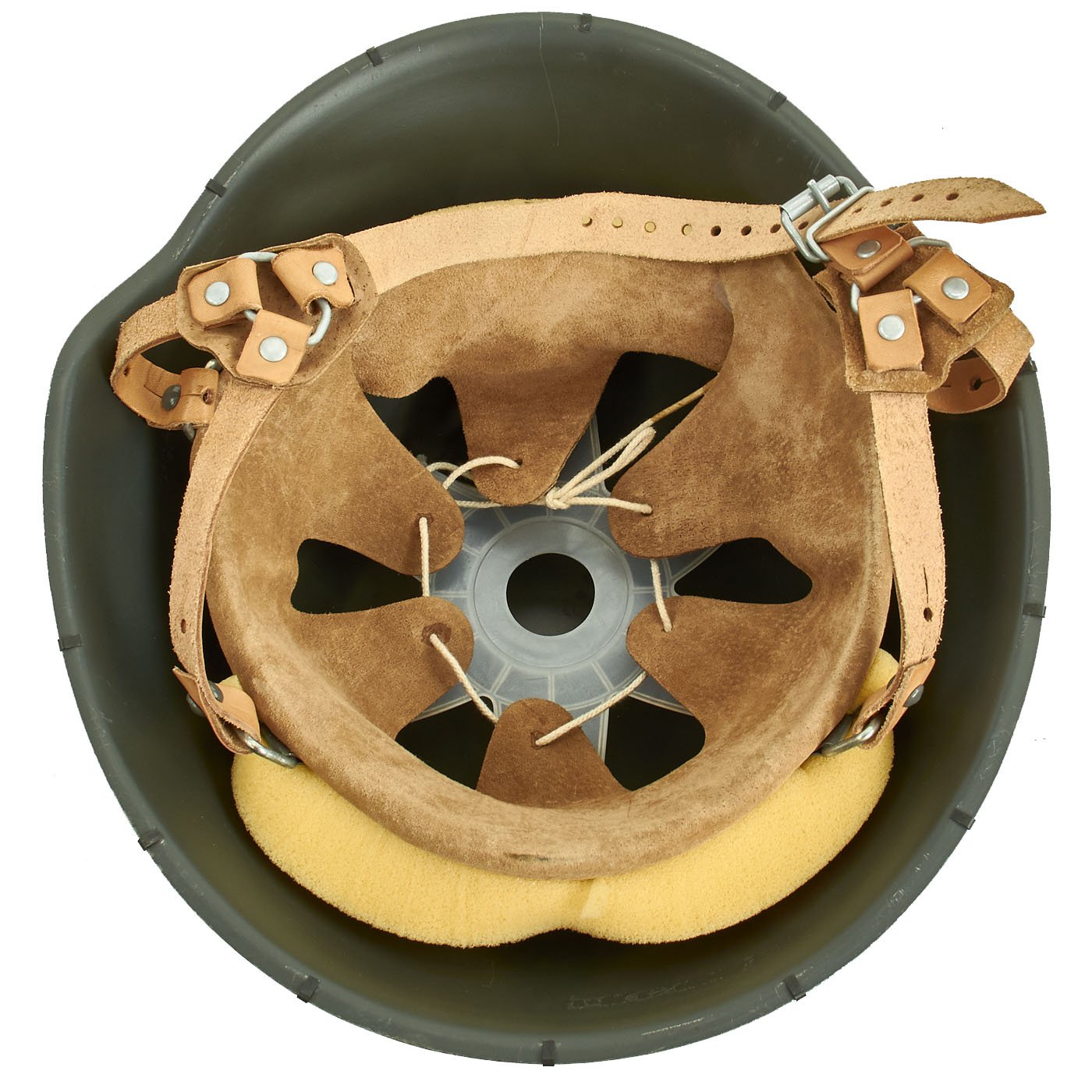 This is an excellent example, with the original paint fully retained, with just a bit of light scratching in areas. It looks to be marked II / 4 / 80 over the left ear inside the shell, which means it was most likely produced in 1980, as these were in production up until the re-unification of Germany. The helmet is in the correct 3rd model configuration, introduced in 1976, which features a simplified liner with a plastic support frame and foam rubber padding.