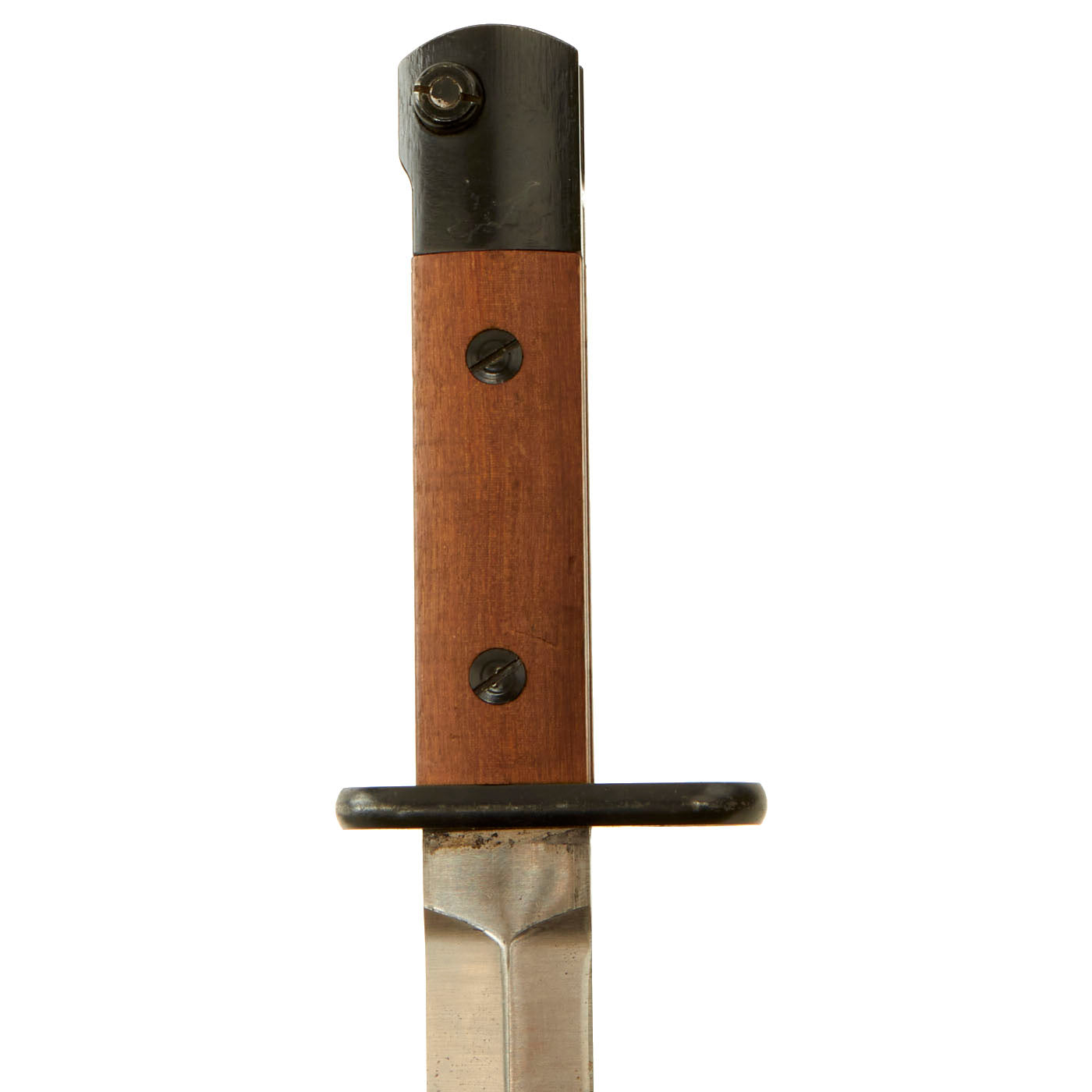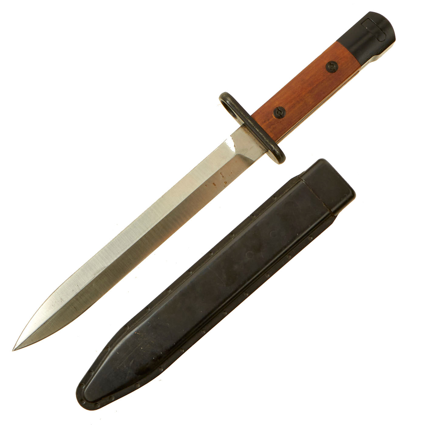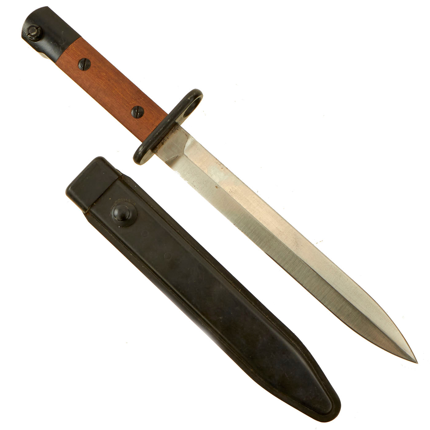 The bayonet is a simple design, with the hilt and sheet steel scabbard painted black and the blade left in the white. The bayonet has minor storage wear present, but still retains 99% of the original black paint, a fine double edge blade that still has minor storage grease on it, two wood grip scales and a functional bayonet catch. There are no markings present on any item, but there is no doubt in this being an original Colombian contract bayonet.