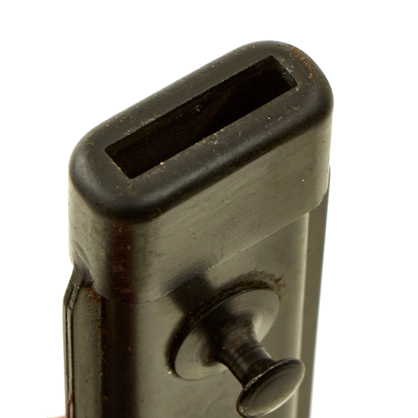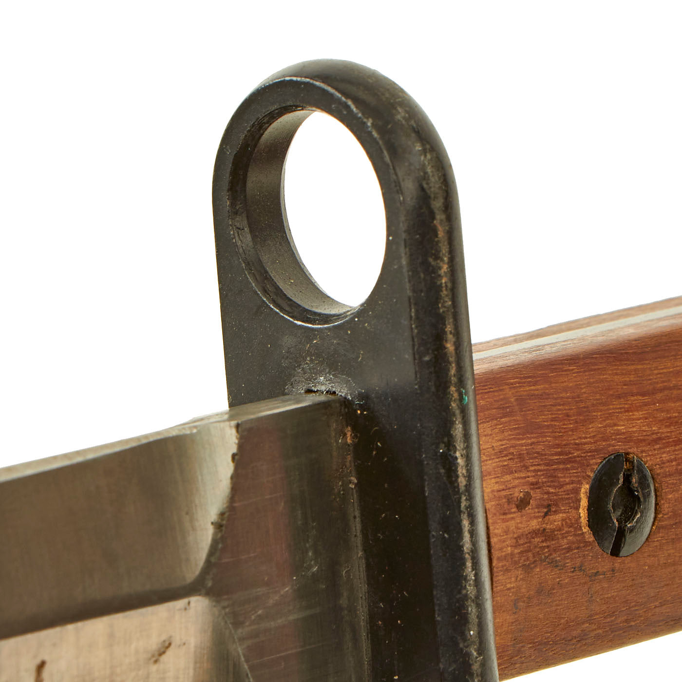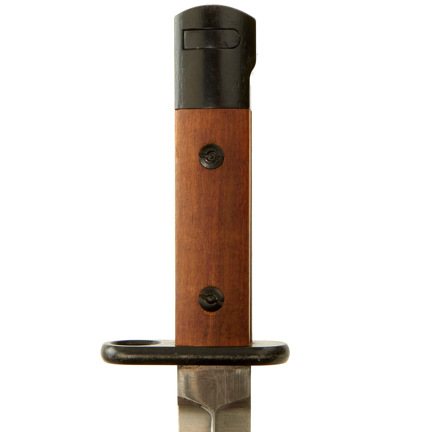 The bayonet is a simple design, with the hilt and sheet steel scabbard painted black and the blade left in the white. The bayonet has minor storage wear present, but still retains 99% of the original black paint, a fine double edge blade that still has minor storage grease on it, two wood grip scales and a functional bayonet catch. There are no markings present on any item, but there is no doubt in this being an original Colombian contract bayonet.
