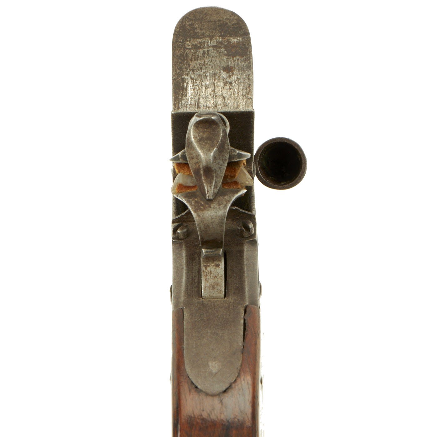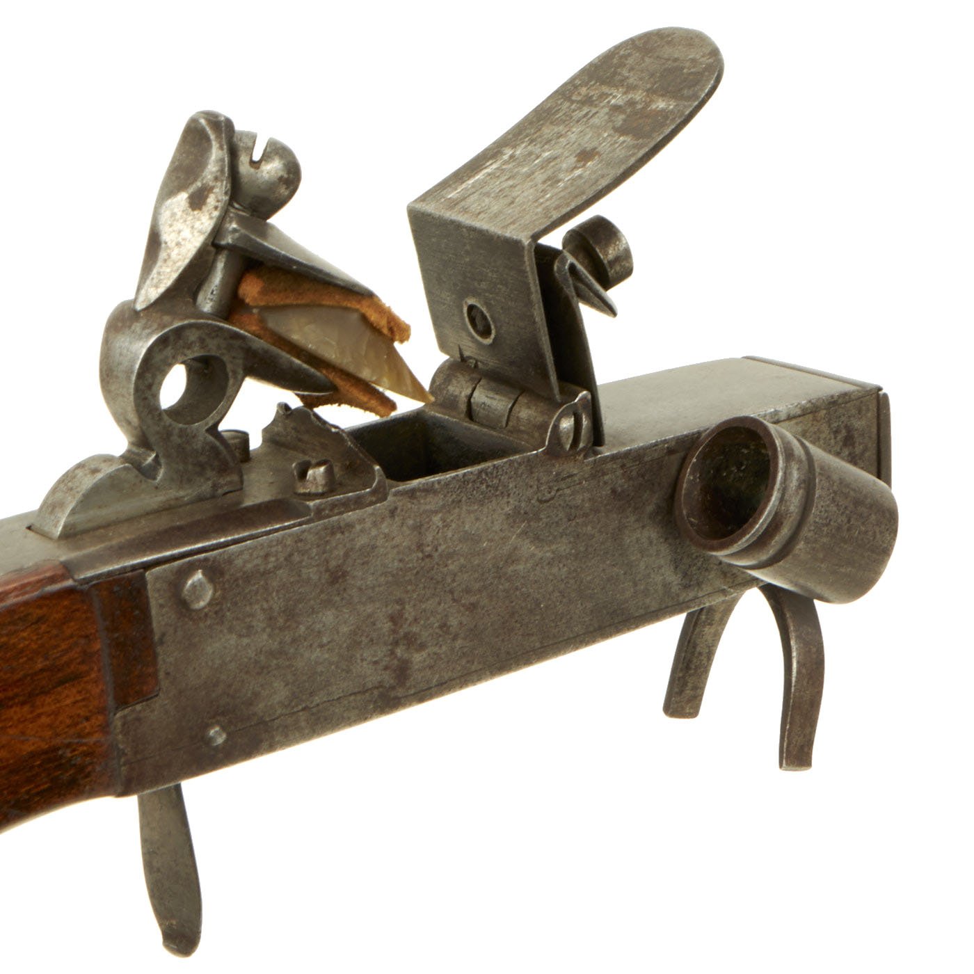 These were first used as fire lighters by the flint striking a spark on the frizzen, which ignited the "tinder" in the trough or pan below. Tinder was usually fine shards of cotton or similar which was easily set afire with a spark. Once ignited the pan's now burning tinder was tipped into the laid fireplace to soon burst into a good blaze.