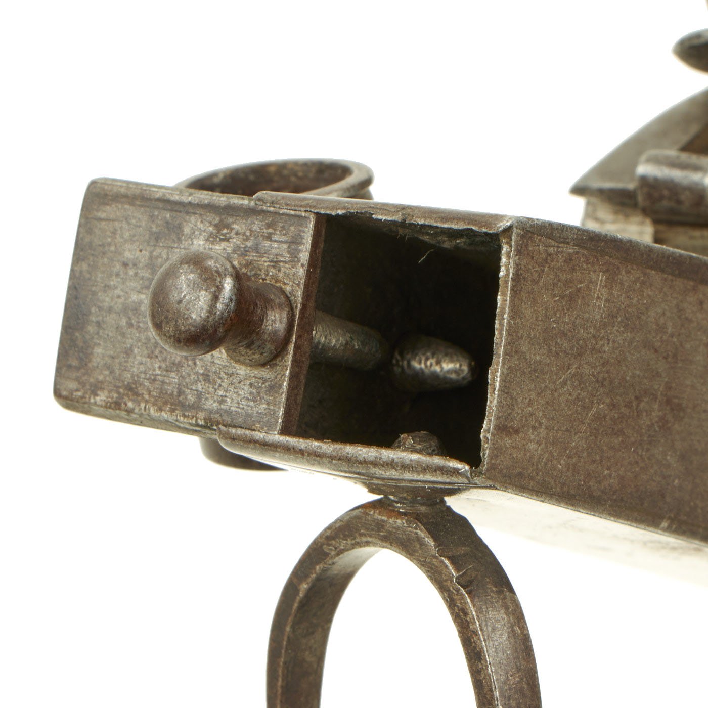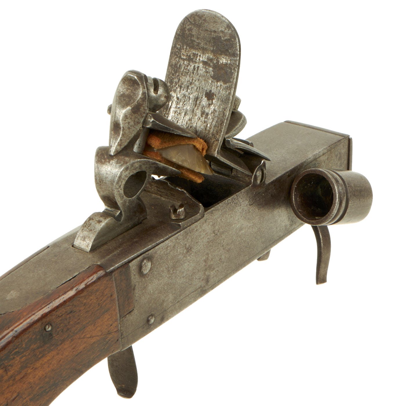 Later example such as this featured a storage compartment for additional tinder, opened by sliding the door on the front to the right side. It also has a small candle holder (candlestick) on the right side, which would be used to hold a candle lit by the tinder. This could then be used to light other candles in the vicinity. It is also possible that these could be used as a primitive "flashlight". It seems to be fully functional, holding at half cock and firing at full. We have however not tested it for its ability to light tinder.