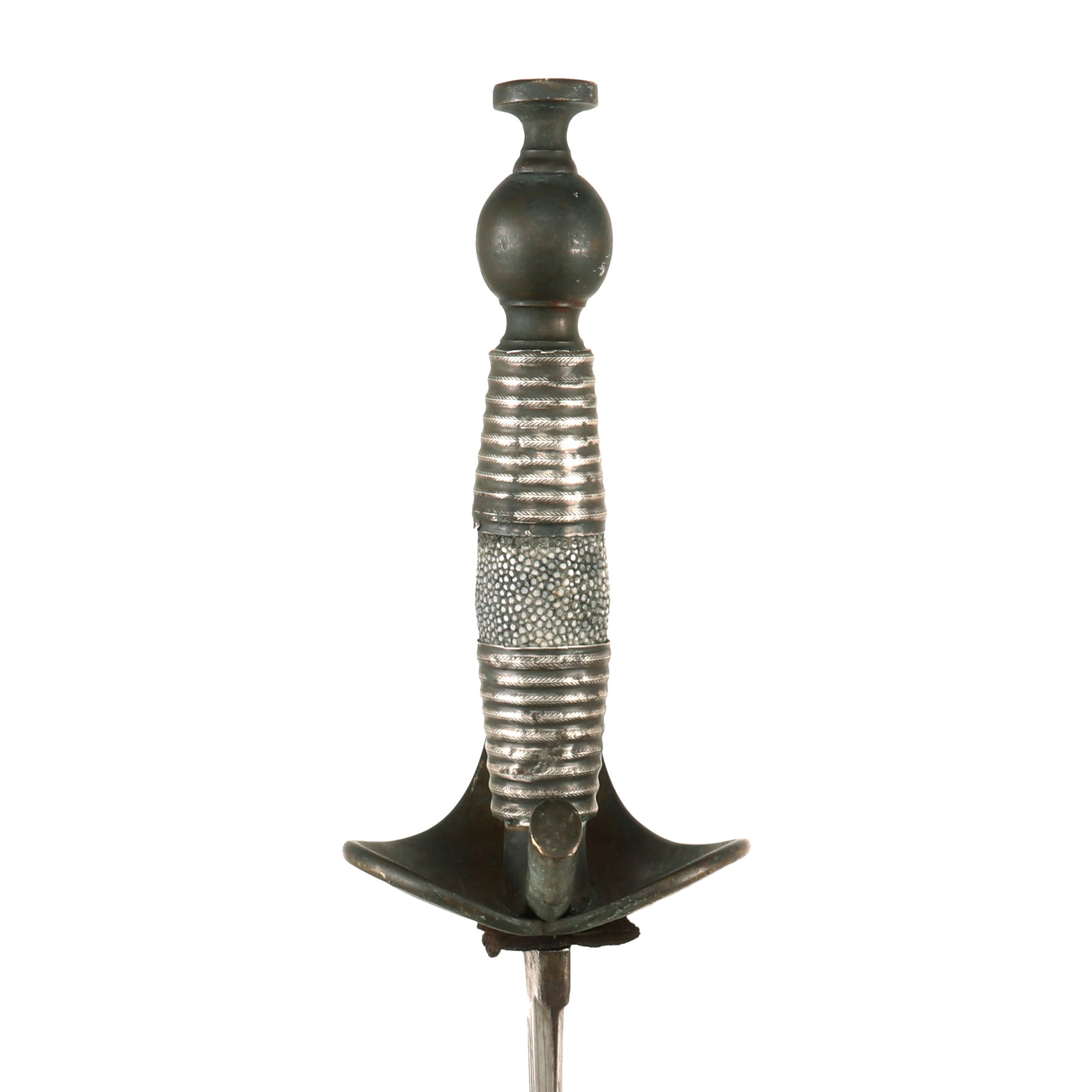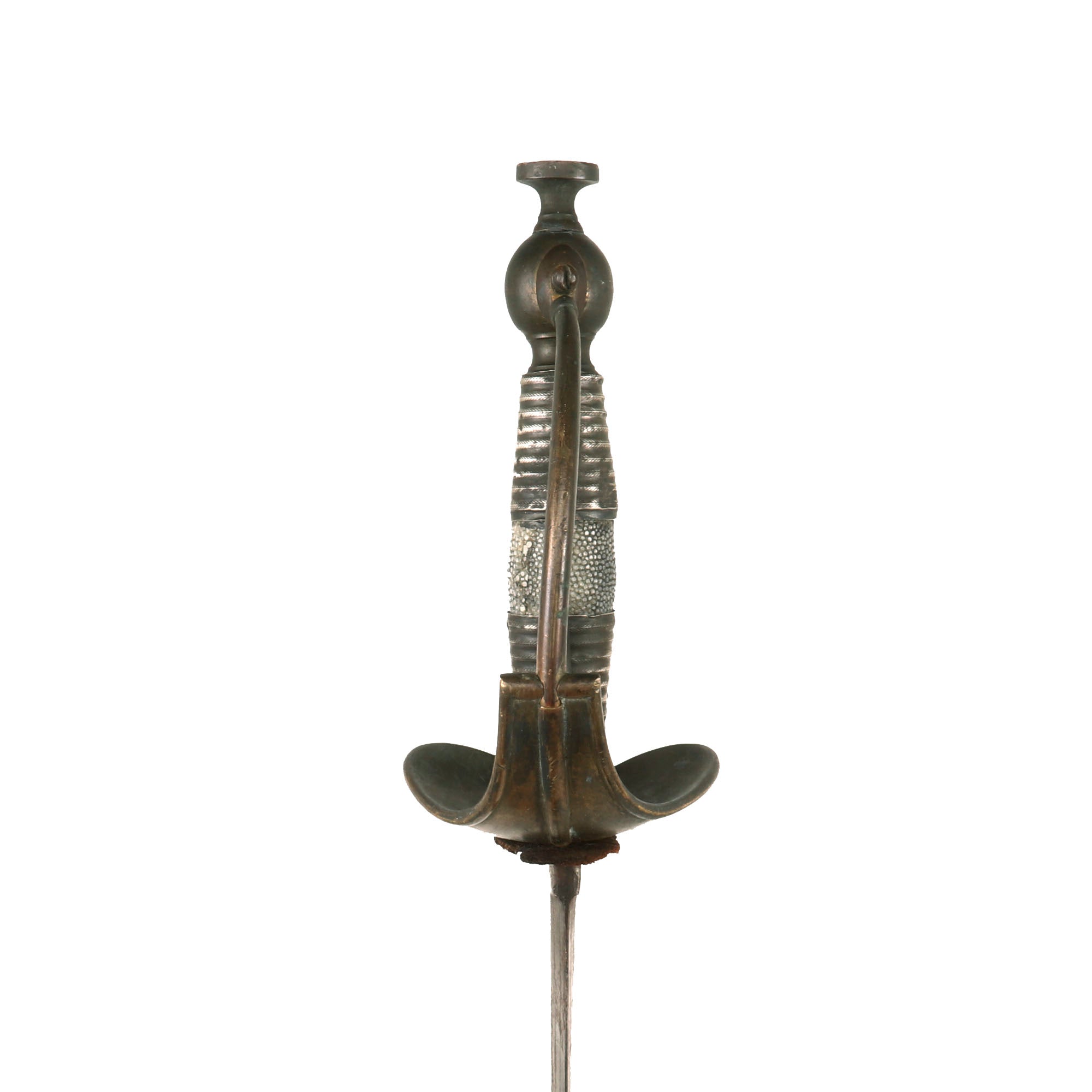 From our research, we’ve found that the blade with 'Spanish motto' does appear to be of the numbers of these which came into the Spanish colonial sphere from late 18th century into the early 19th century, this one seems to be one of the earlier ones which are believed to have been produced in Toledo. The style of the lettering seems to correspond to those. Typically these blades were mounted in three bar cavalry hilts, as illustrated in the cavalry saber c.1820s. This example has a more ceremonial style hilt with a polished ray skin grip covered mostly by embossed sheet silver.