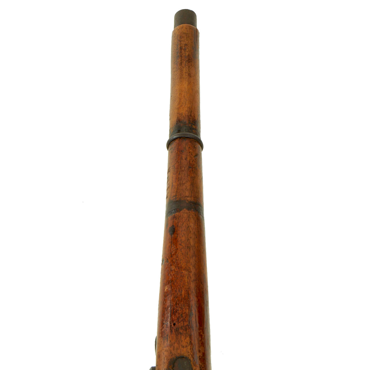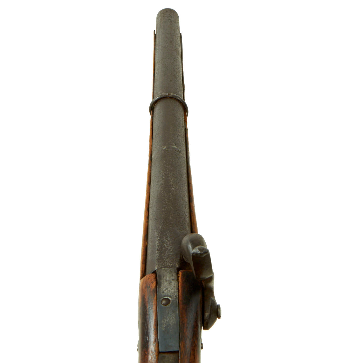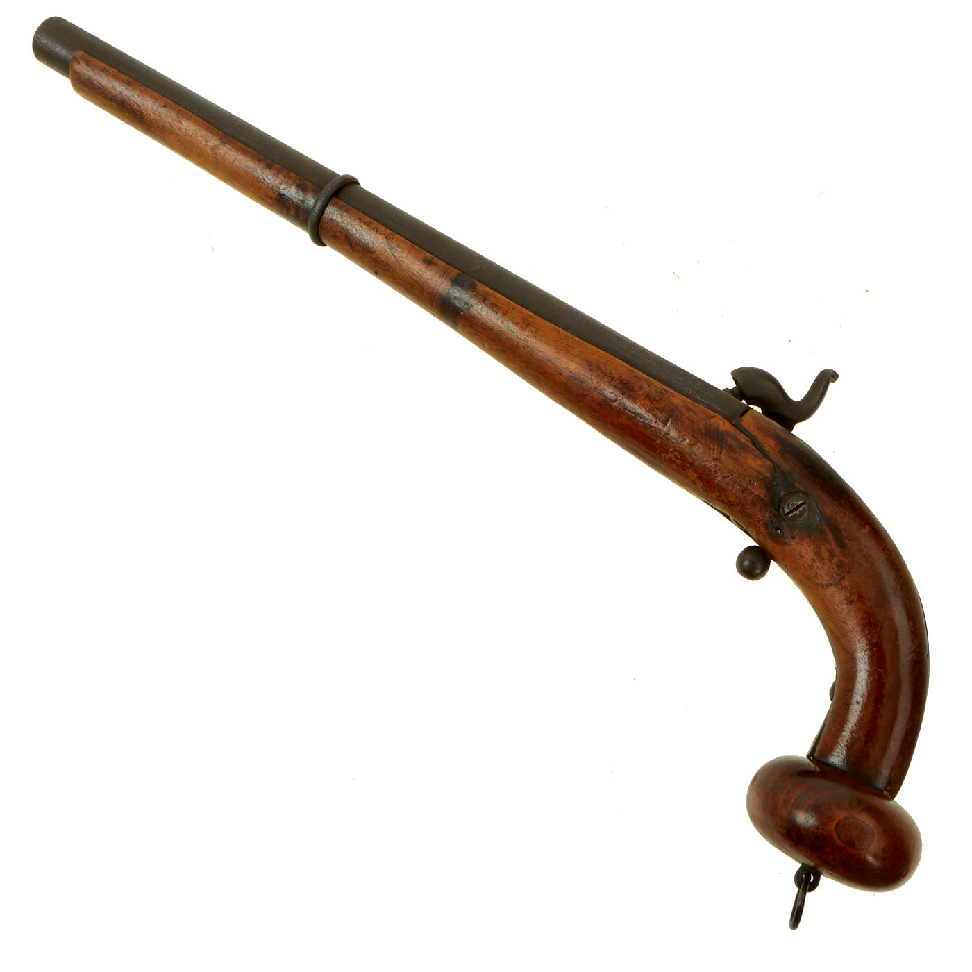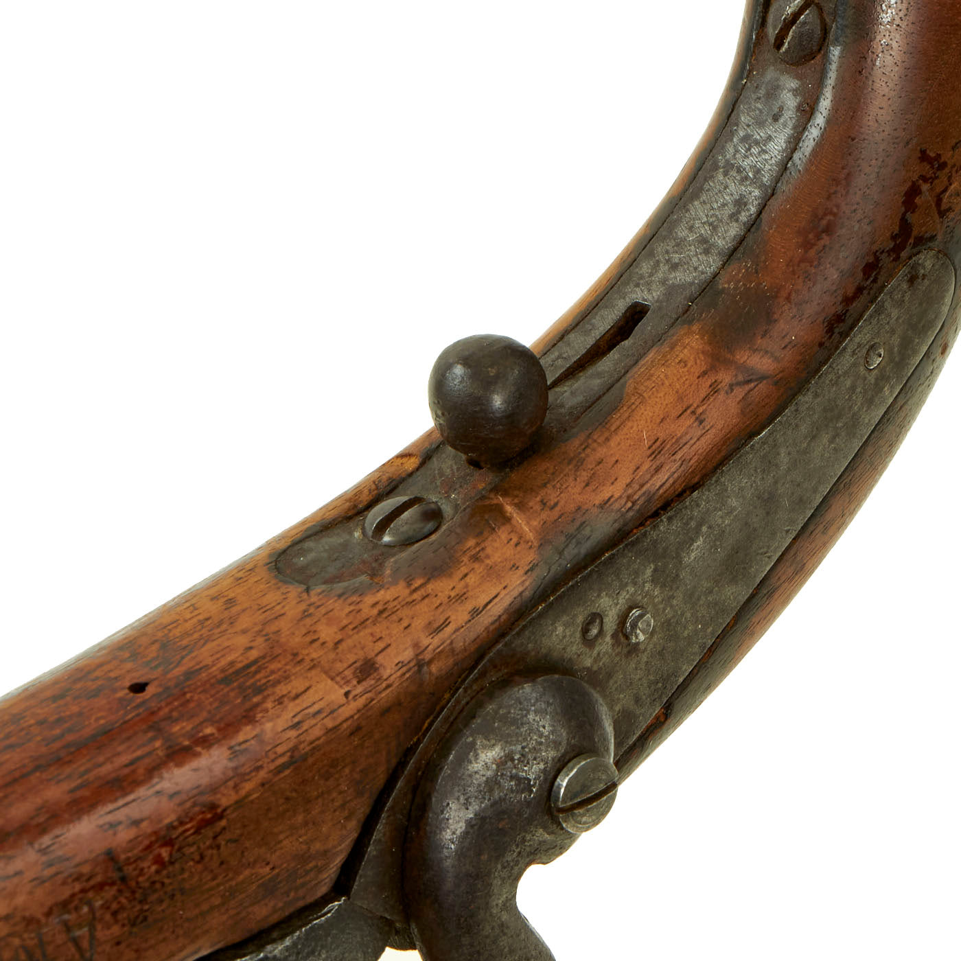 The pistol has a 12 1/2 inch .63" barrel with 4 groove rifling, and measures 18 inches in overall length. It stamped on the right side of the stock with ALMA and also A.M. DEAN, a British soldier whom we have not researched in these early days since its coming to us. Condition is quite good, showing years of storage and cleaning, probably in some regimental museum or elsewhere. We can tell from the stains on the stock that it used to have a lower barrel band, and probably had some time of nose fitting at one time as well, now lost to the ages.