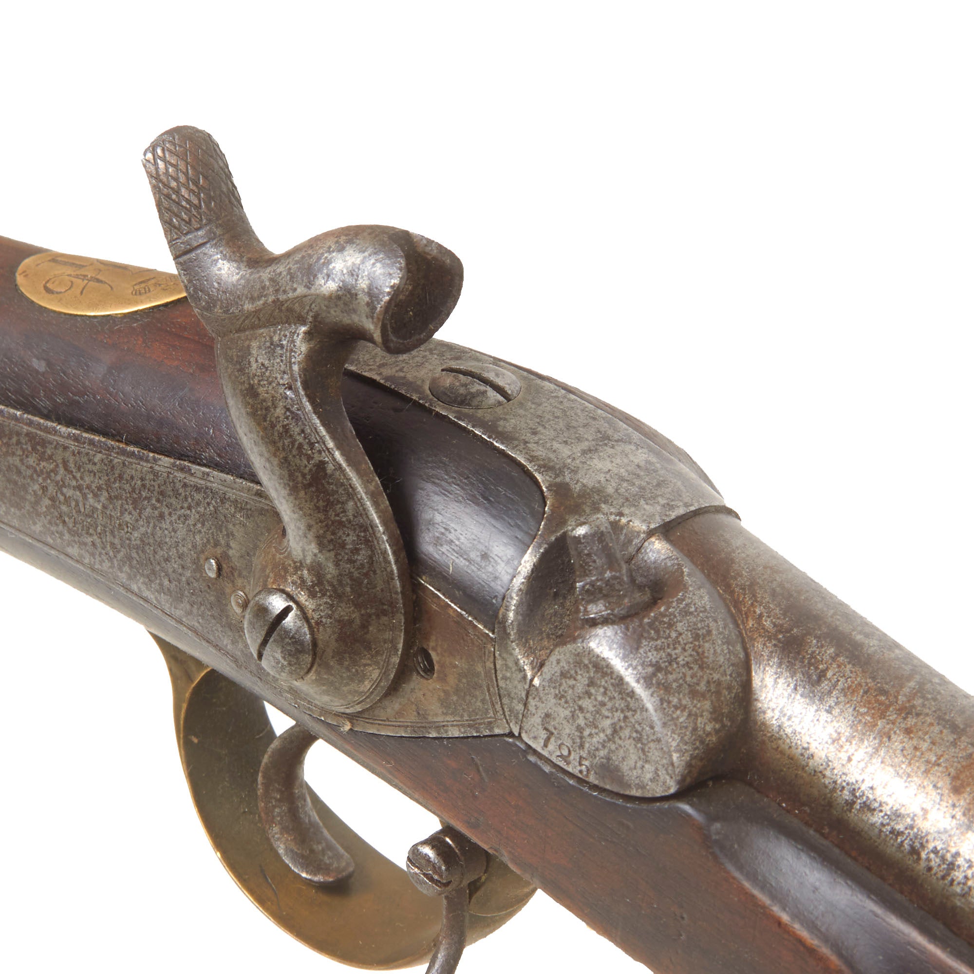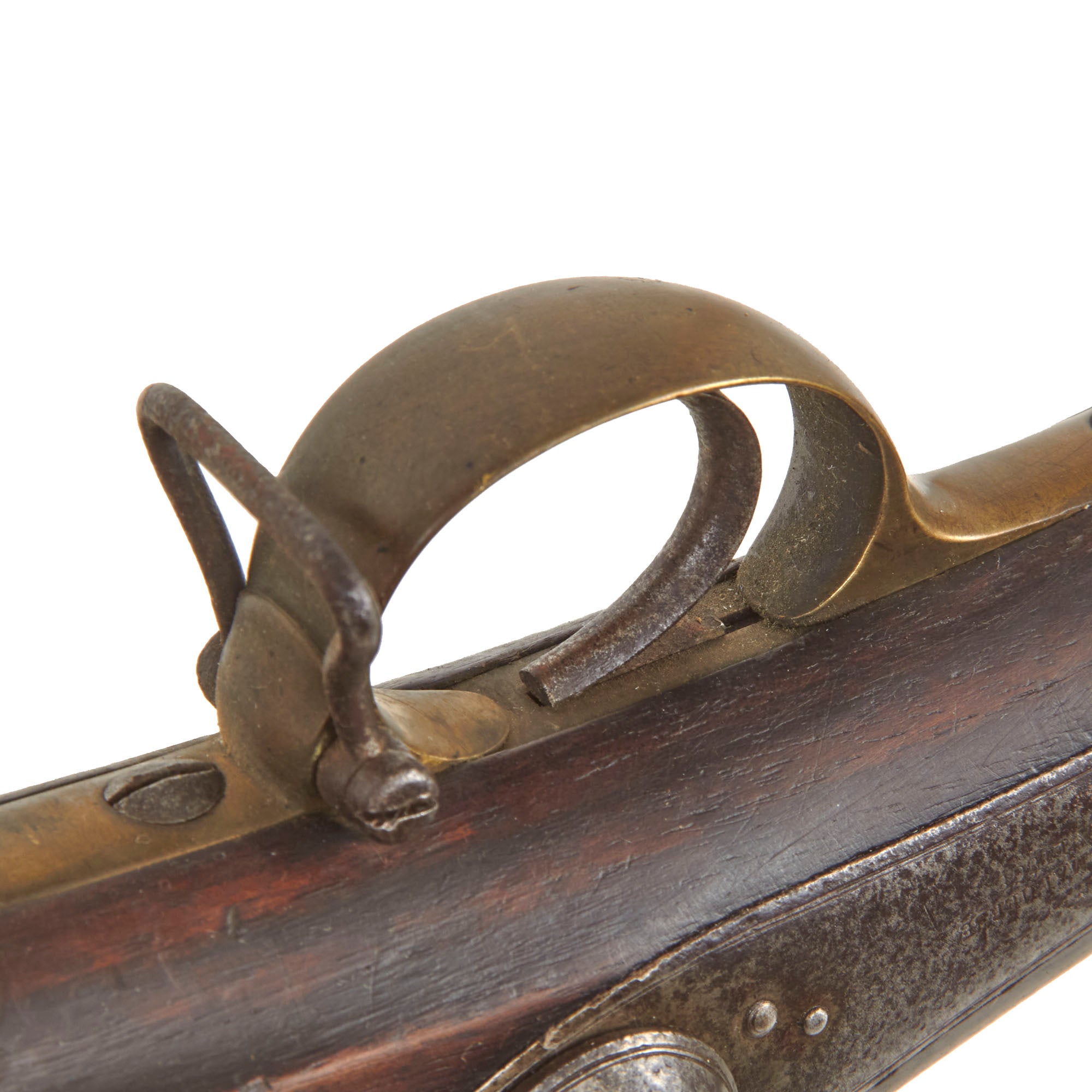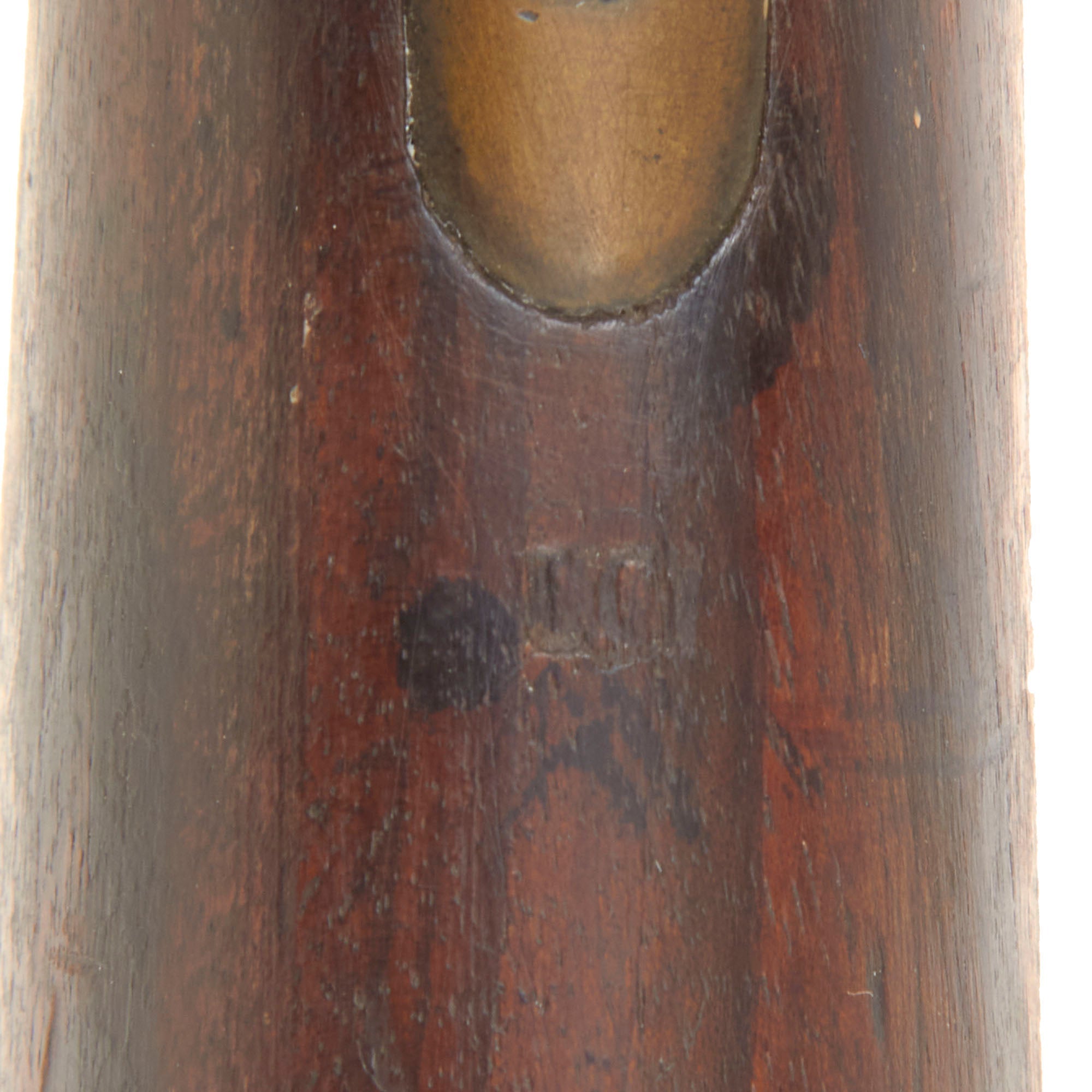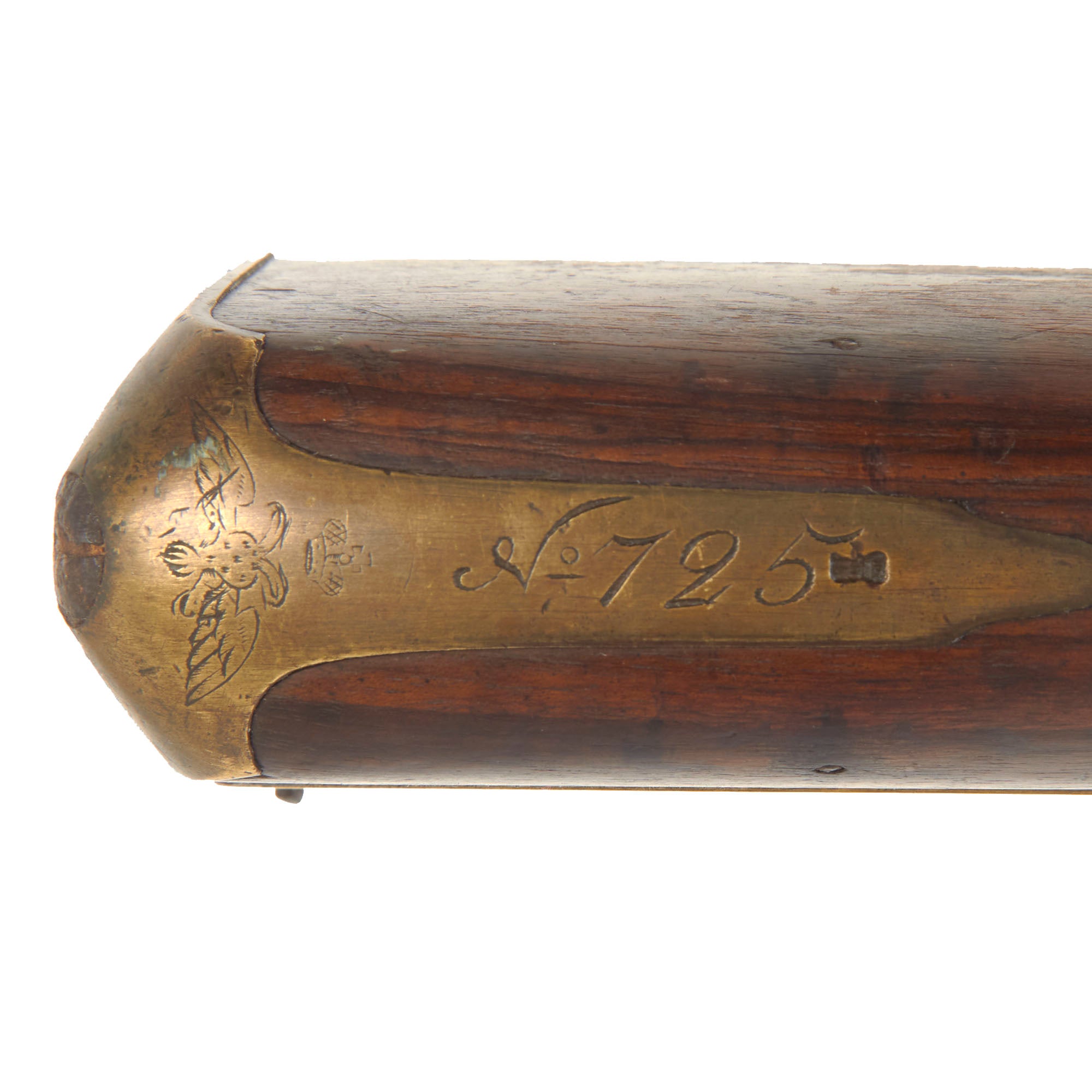 This lovely short rifle has a lovely aged patina, with past peppered oxidation on much of the iron and steel metalwork, so it may have been laying out for a bit of time before it was captured, or maybe it was simply not possible to protect it. It measures just over 46 inches in overall length, with a 30 inch 0.69" caliber barrel. It still shows the two U-shaped inlets in the end of the barrel where the two-groove rifling starts, so this has not been shortened. The lock plate indicates that this Brunswick Two-Groove Rifle was made under contract to the Russian Empire in Liège, Belgium: