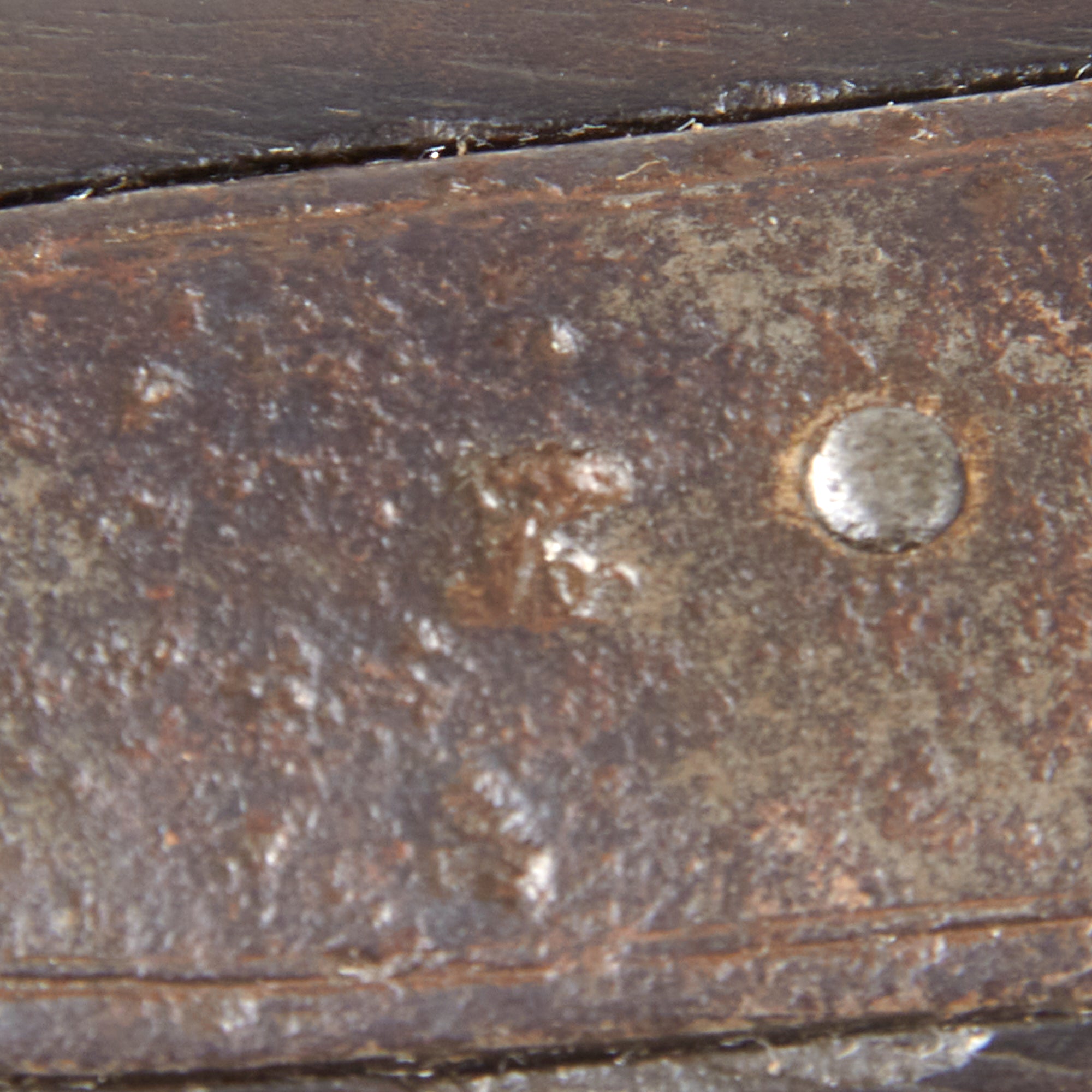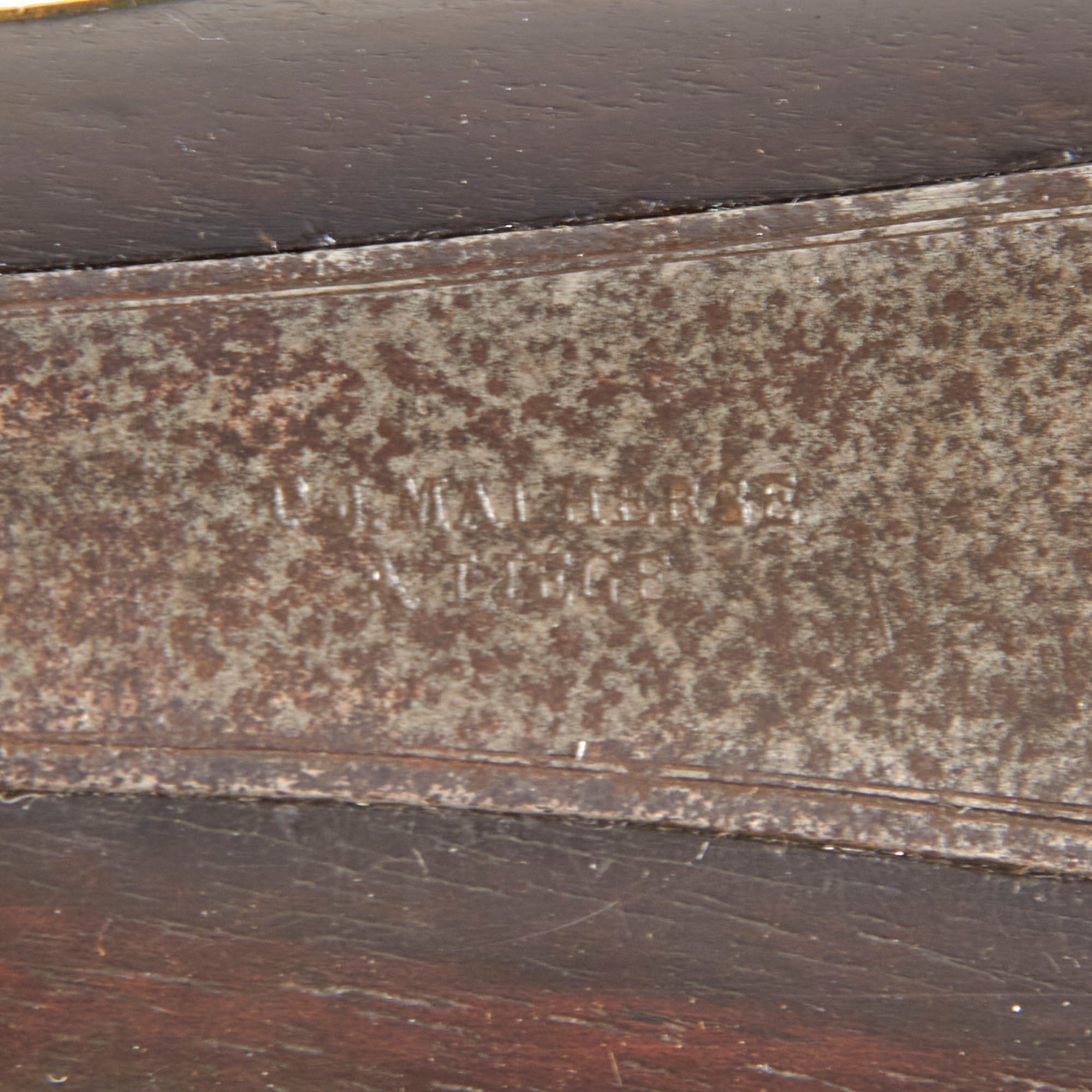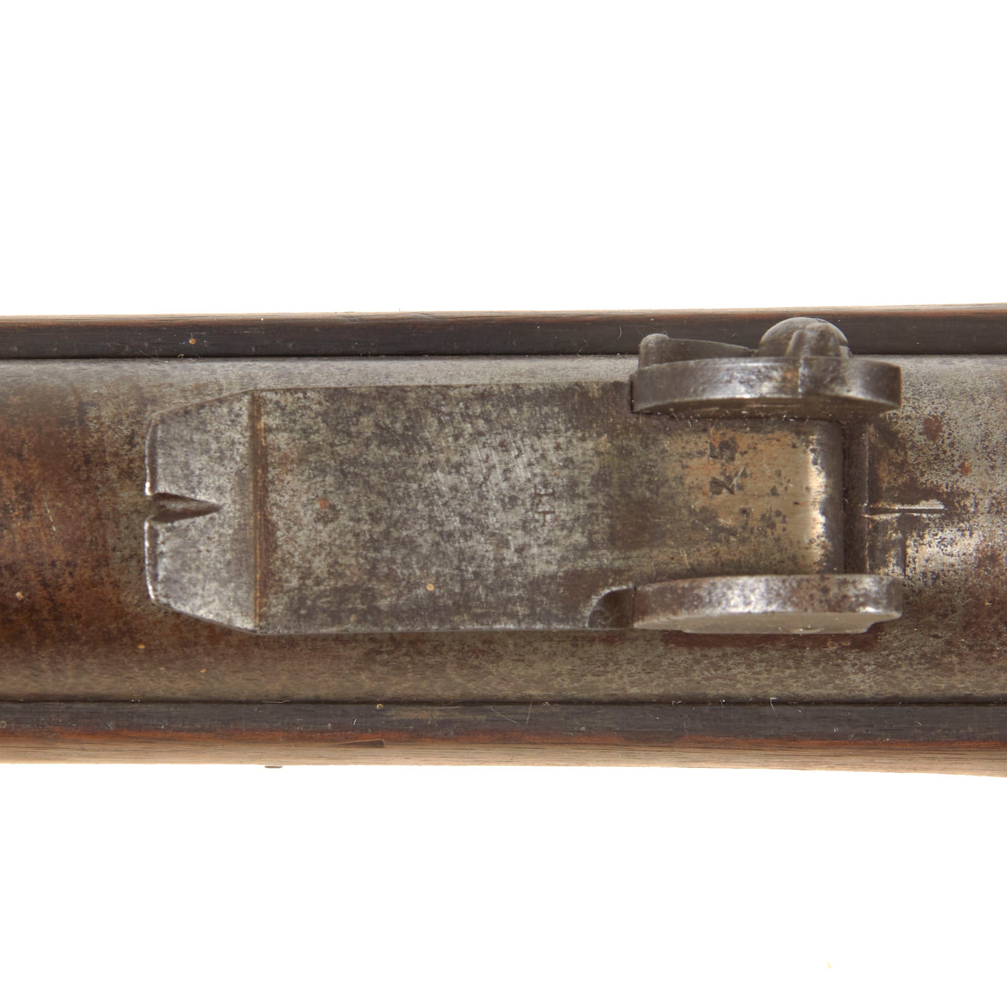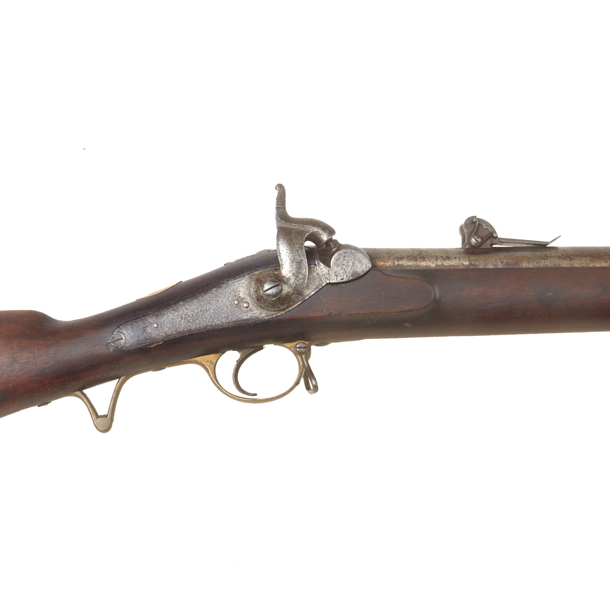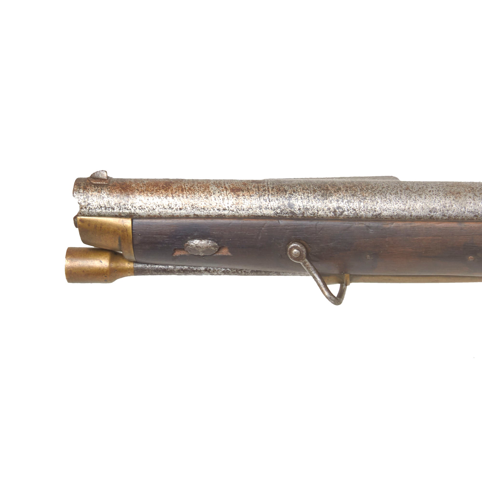 This lovely short rifle has a lovely aged patina, with past peppered oxidation on much of the iron and steel metalwork, so it may have been laying out for a bit of time before it was captured, or maybe it was simply not possible to protect it. It measures just over 46 inches in overall length, with a 30 inch 0.69" caliber barrel. It still shows the two U-shaped inlets in the end of the barrel where the two-groove rifling starts, so this has not been shortened. The lock plate indicates that this Brunswick Two-Groove Rifle was made under contract to the Russian Empire in Liège, Belgium: