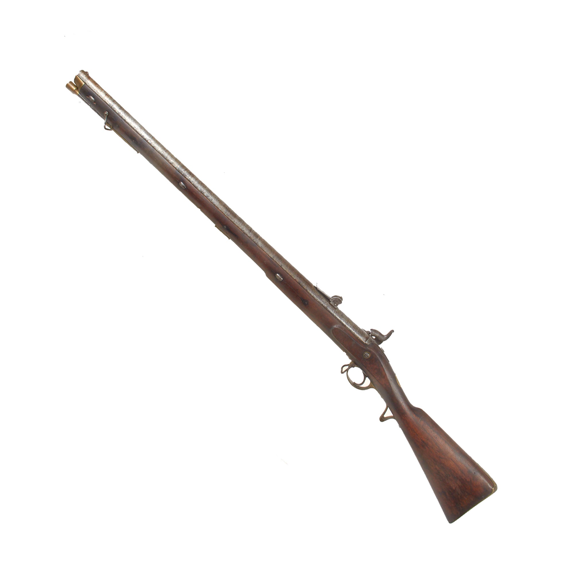 Overall condition is very nice, with a great aged patina and no signs of major restoration. The rear sight is fully functional, as is the lock, which holds correctly at half cock, firing at full. Both sling swivels are still present, and the brass tipped ramrod is stored under the barrel. The large brass end can actually be unthreaded from the front, and smaller end is also brass tipped, with what looks like an area where a tool could be installed, however it is clogged with dirt and rust.