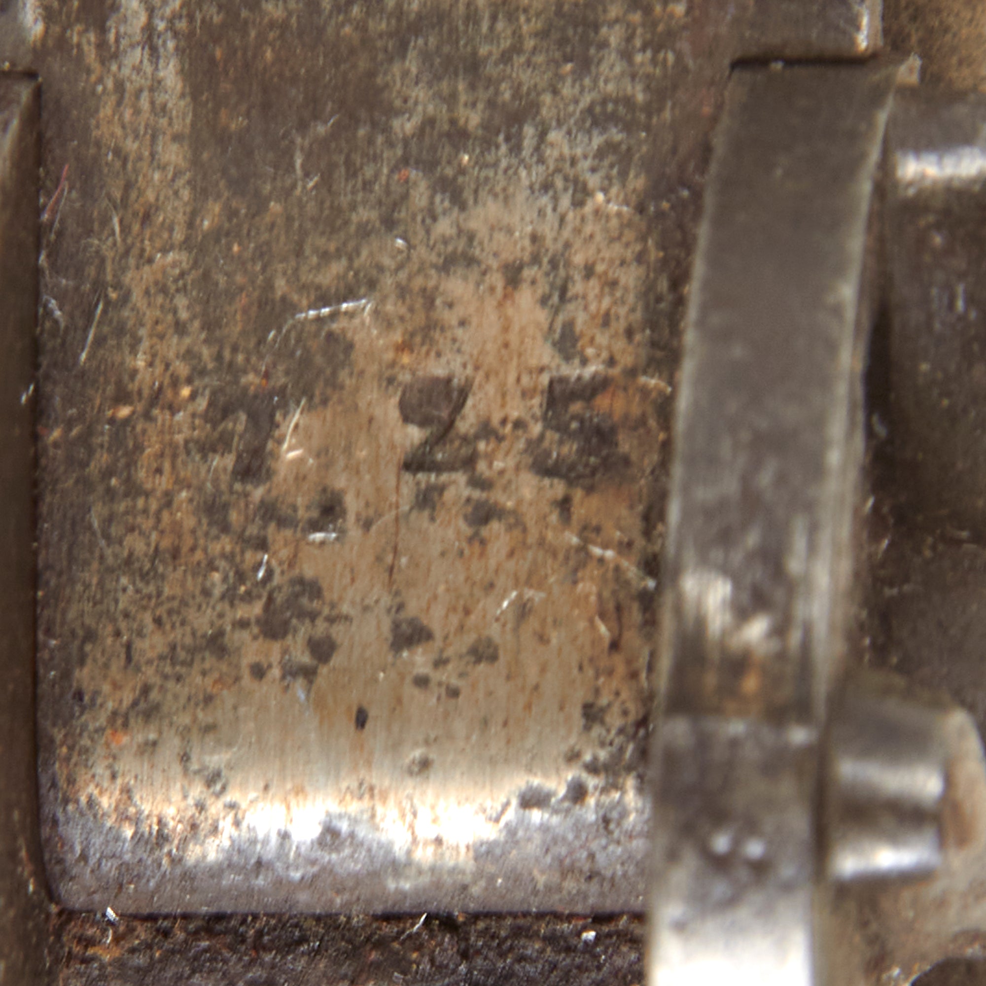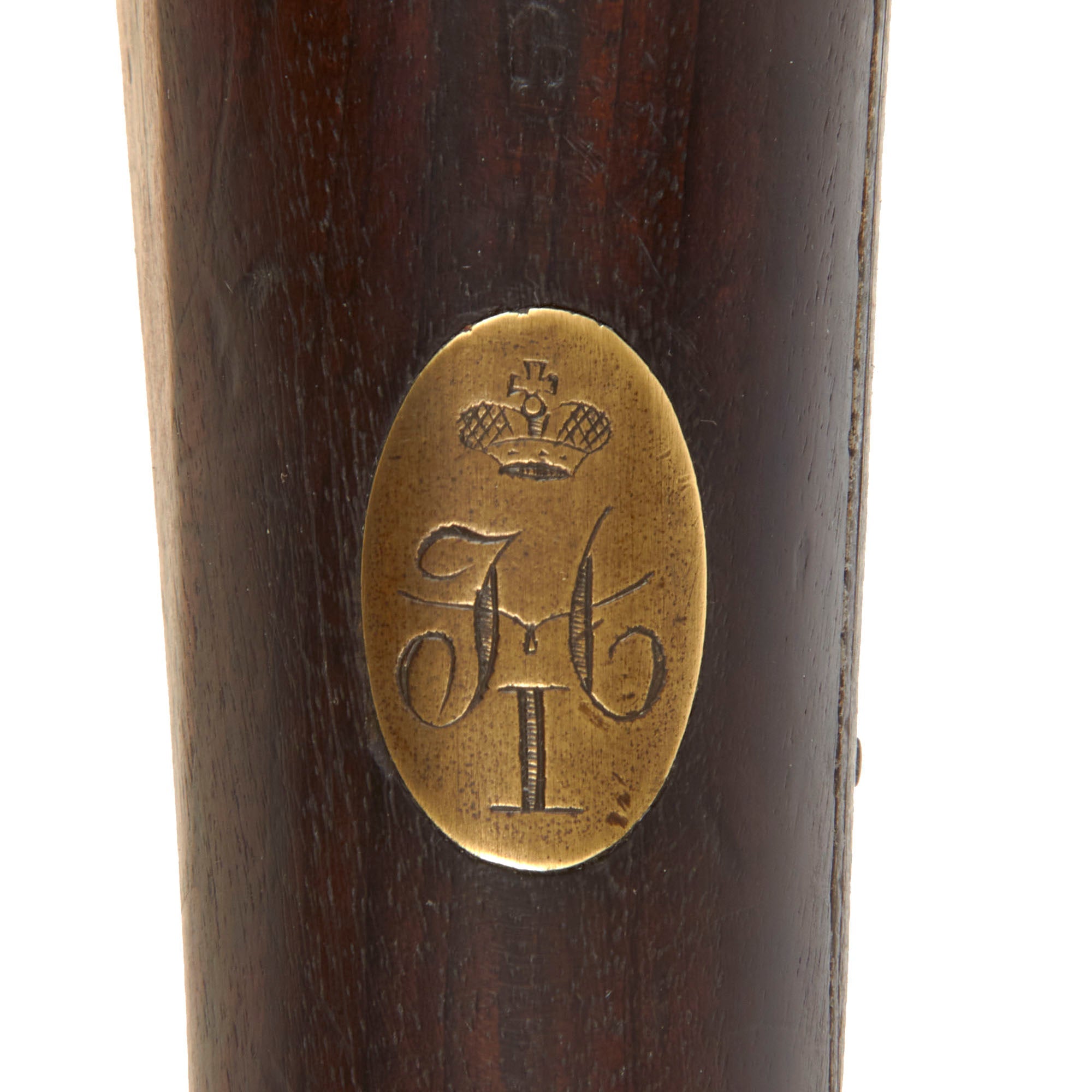 This is a known maker from the period, who also made many guns under contract to various German states, which were then very often imported for use in the U.S. Civil War. There is also some type of marking or cartouche towards the tail of the lock plate, which we were not able to identify. There are also some proof marks on the breech end of the barrel. The brass butt plate of the rifle bears an intricate CROWN over the Russian Imperrial DOUBLE HEADED EAGLE, which is definitely executed with a high level of artistry. Next to this is № 725, which looks to be the serial or rack number of the rifle. This number is also marked on the cap nipple cone bolster, on the brass end of the ramrod, and on the leaf of the rear sight, which is a very advanced design for the time.