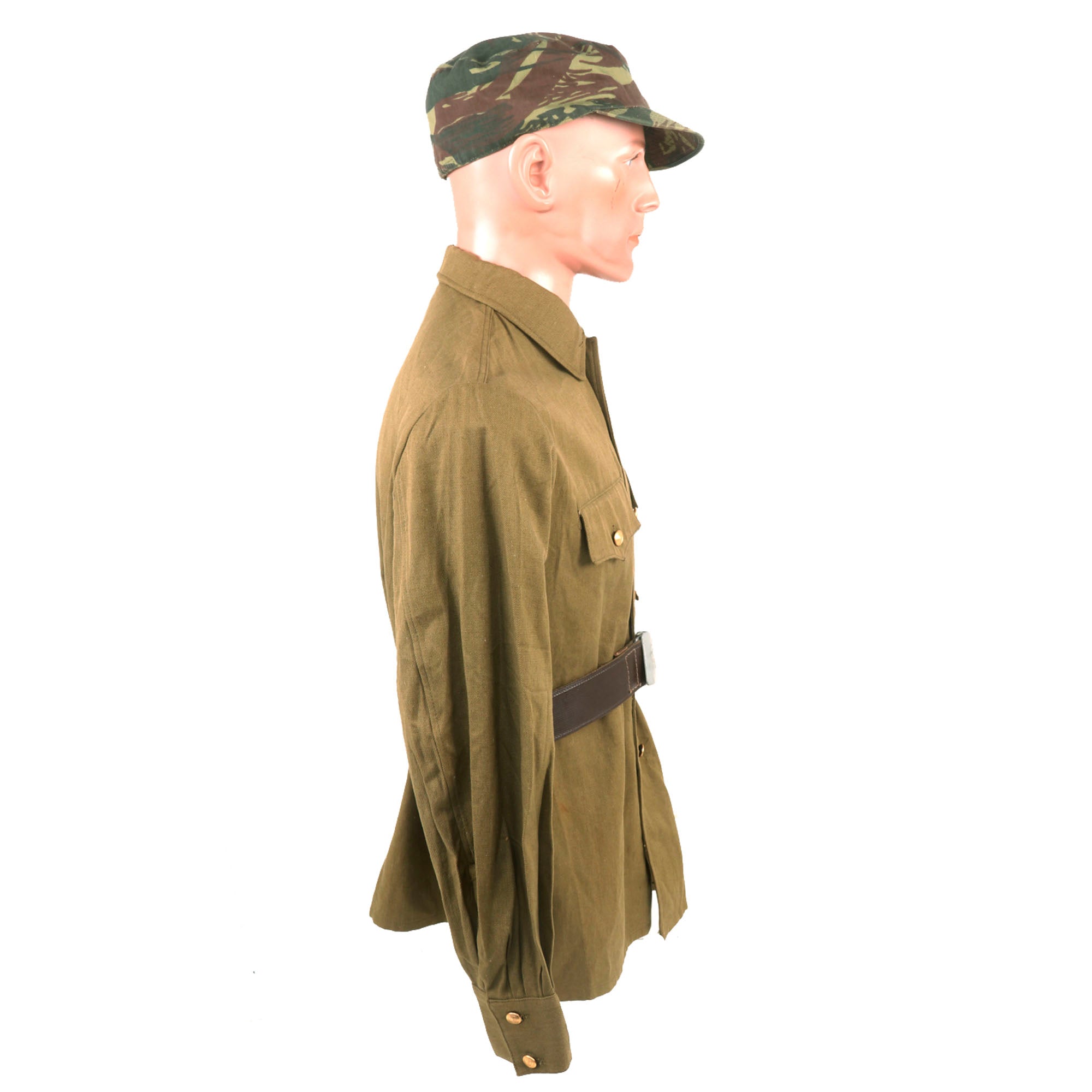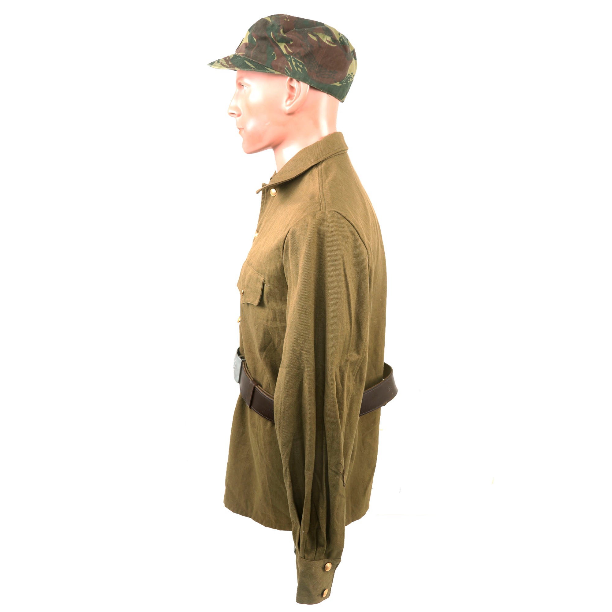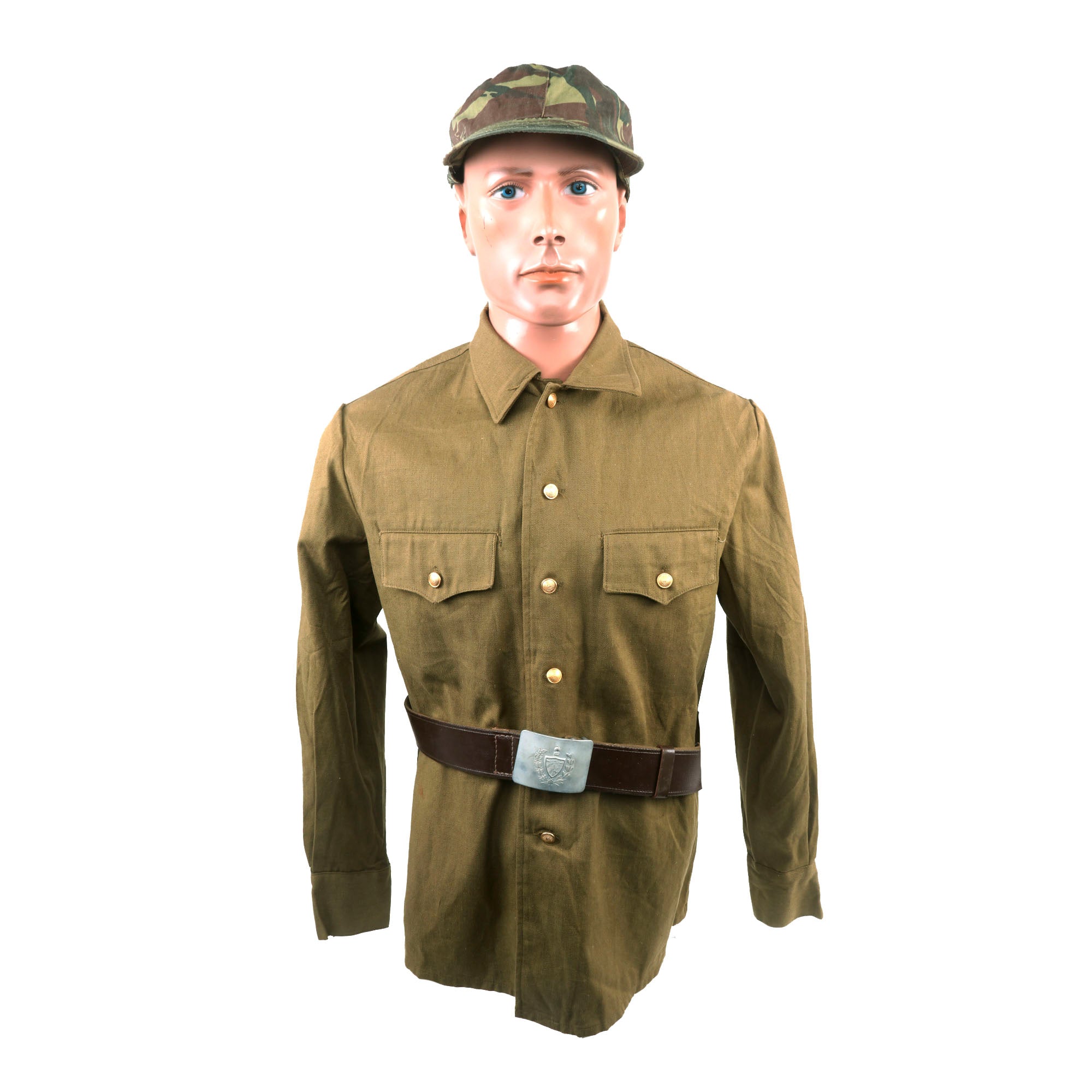 The set being offered here is a set of unissued Cuban military uniforms which were captured by U.S. Forces during the 1983 Grenada Invasion. The set consists of a indigenously made camouflage Cuban Army “Castro” Cap, Soviet-supplied uniform shirt (note the presence of pebbled buttons, indicating it was made for export to a non-Soviet country), and Soviet-Made equipment waist belt with Cuban Crest on the Buckle. All items are in excellent condition, just showing signs of age and wear from handling and storage over the years. This is a very rare group to find stateside, so don’t miss out!