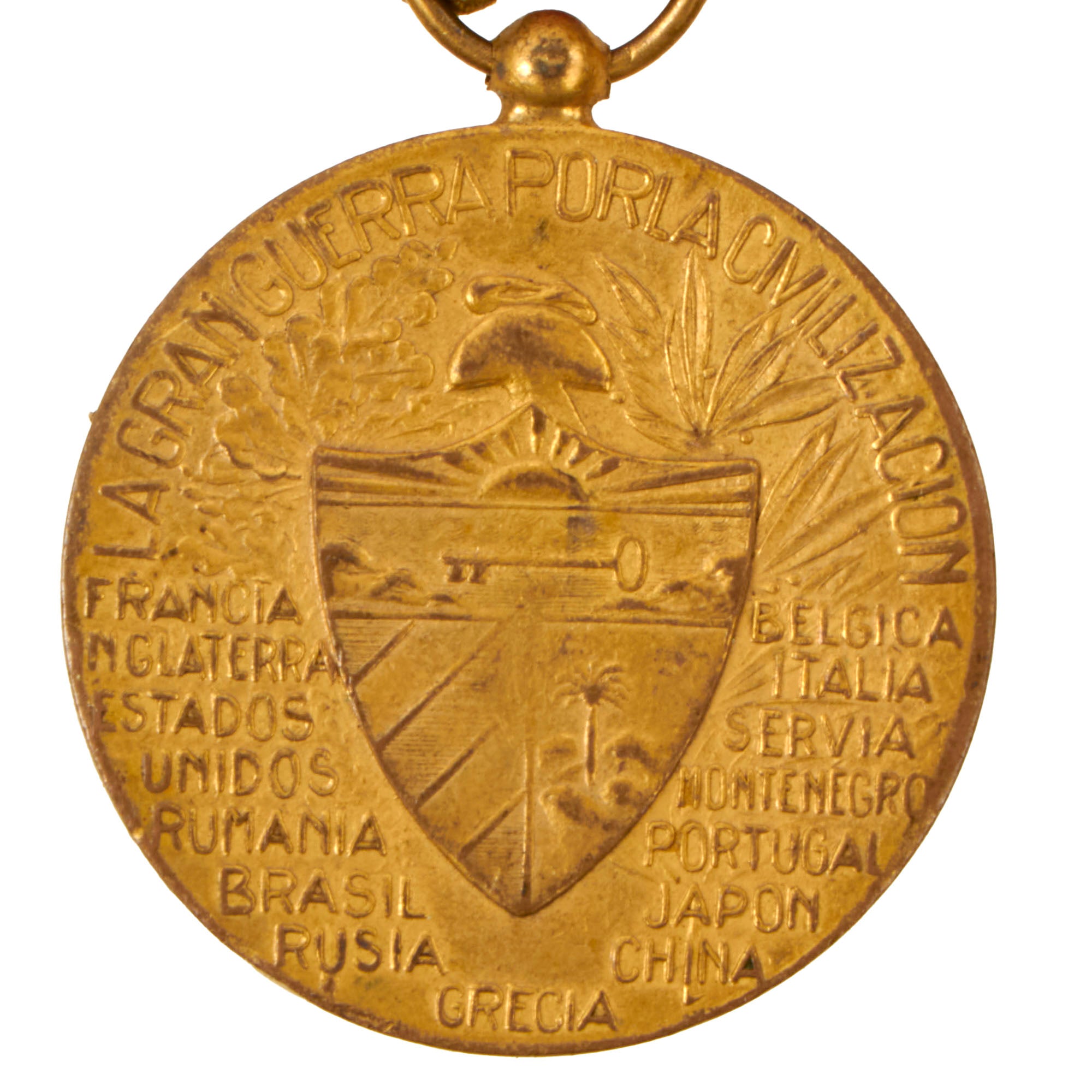 - Inter-Allied Victory Medal, Cuban official issue, 1917-1919. This is a circular bronze medal on laterally pierced ball suspension; the face with a winged figure of Victory, arms outstretched, signed ‘C. Charles’; the reverse with the arms of Cuba centrally, oak and laurel branches above, left and right, circumscribed above ‘LA GRAN GUERRA POR LA CIVILIZACION’ (The Great War for Civilisation), the names of the Allied nations to either side of the shield.