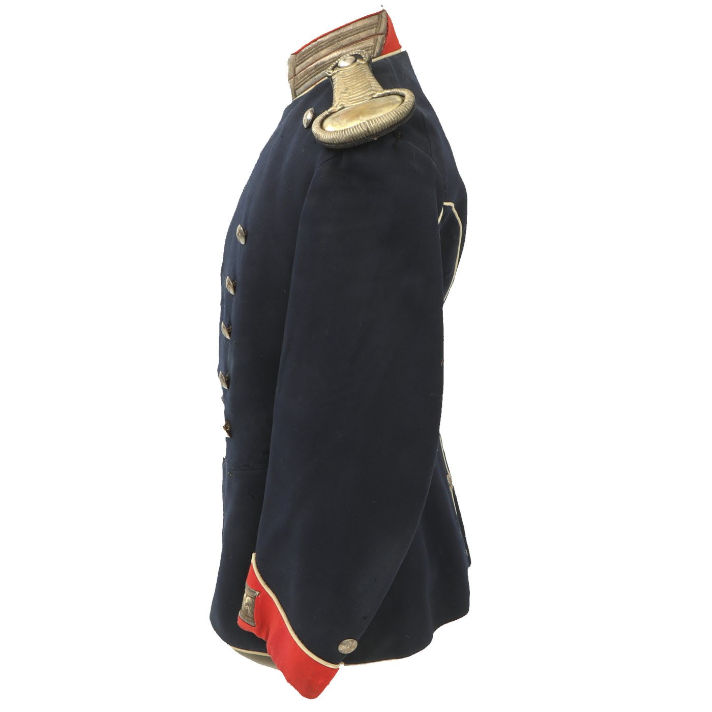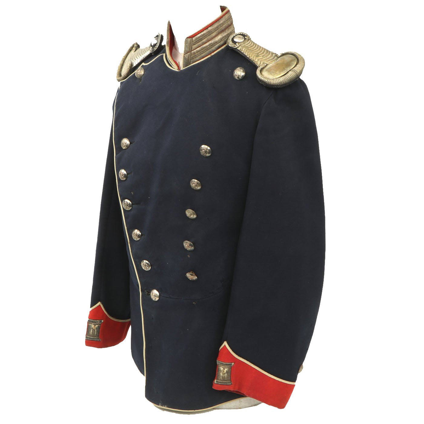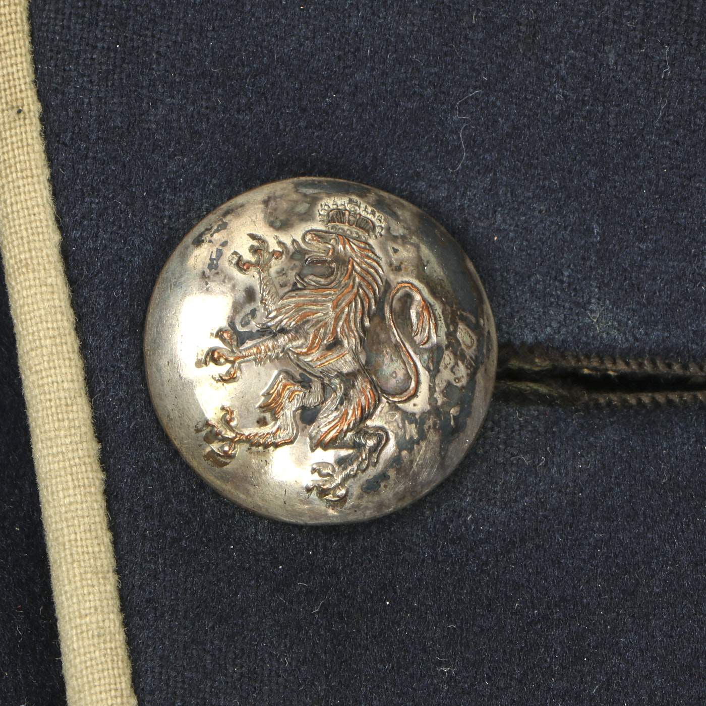 • Original Item: Only One Available. Imperial German Bavarian Dragoon Regiment Coat Coat dark blue wool tunic with stand-up collar. Silver/Gilt bullion embroidery on collar and cuff. Kingdom of Bavaria buttons. Silver shoulder boards with scales. Interior bears ink stamp. Exterior shows minor wear and scattered minor moth holes. Interior very good. Overall condition is very good.