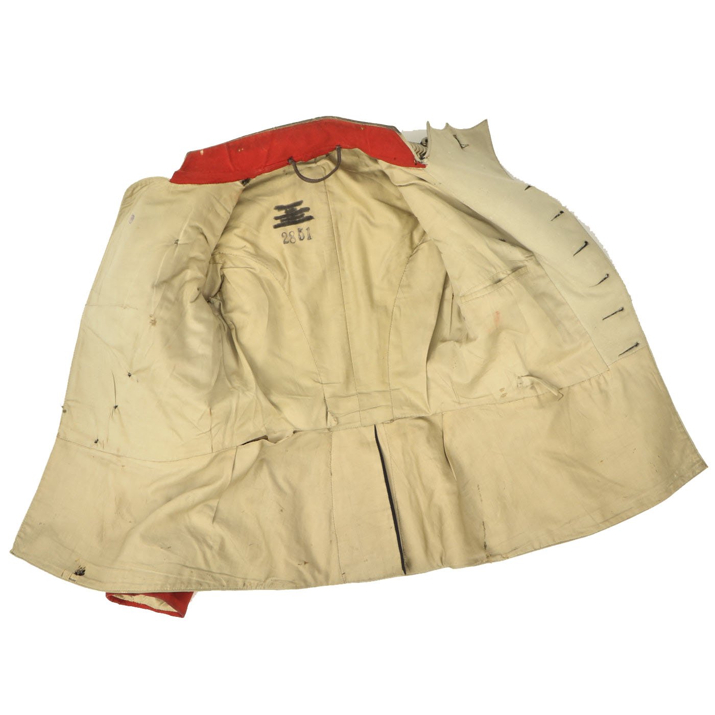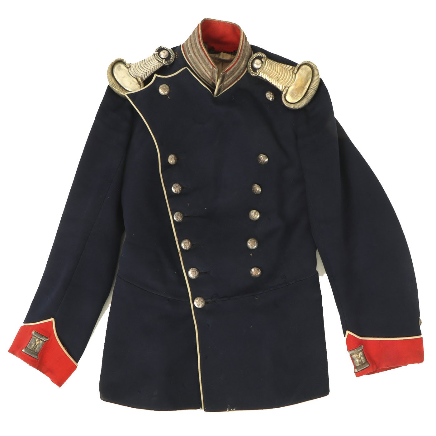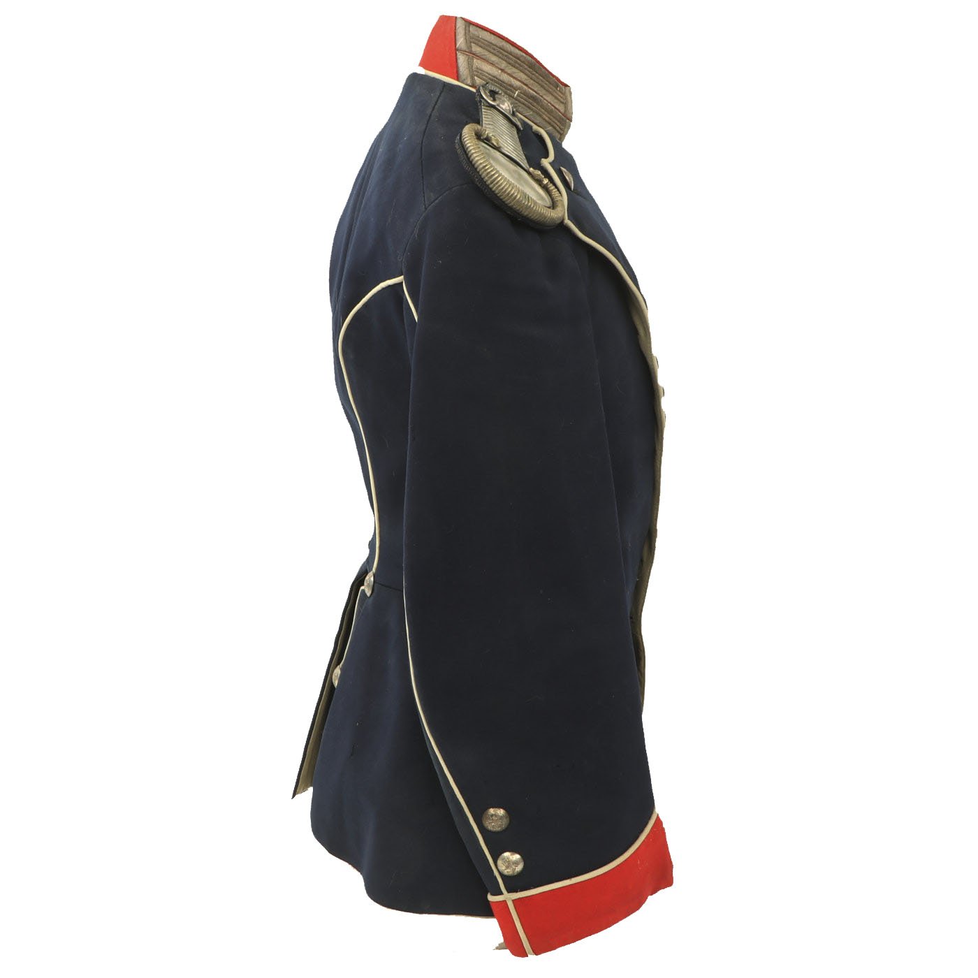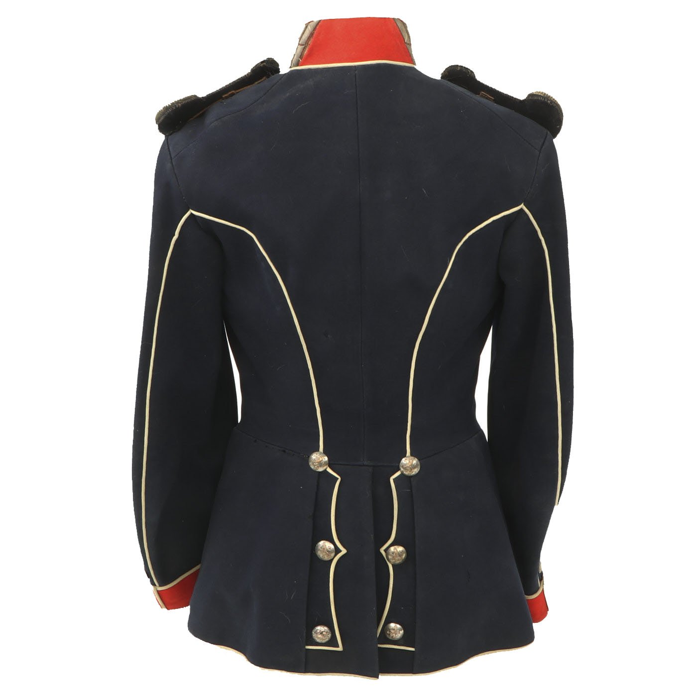 • Original Item: Only One Available. Imperial German Bavarian Dragoon Regiment Coat Coat dark blue wool tunic with stand-up collar. Silver/Gilt bullion embroidery on collar and cuff. Kingdom of Bavaria buttons. Silver shoulder boards with scales. Interior bears ink stamp. Exterior shows minor wear and scattered minor moth holes. Interior very good. Overall condition is very good.