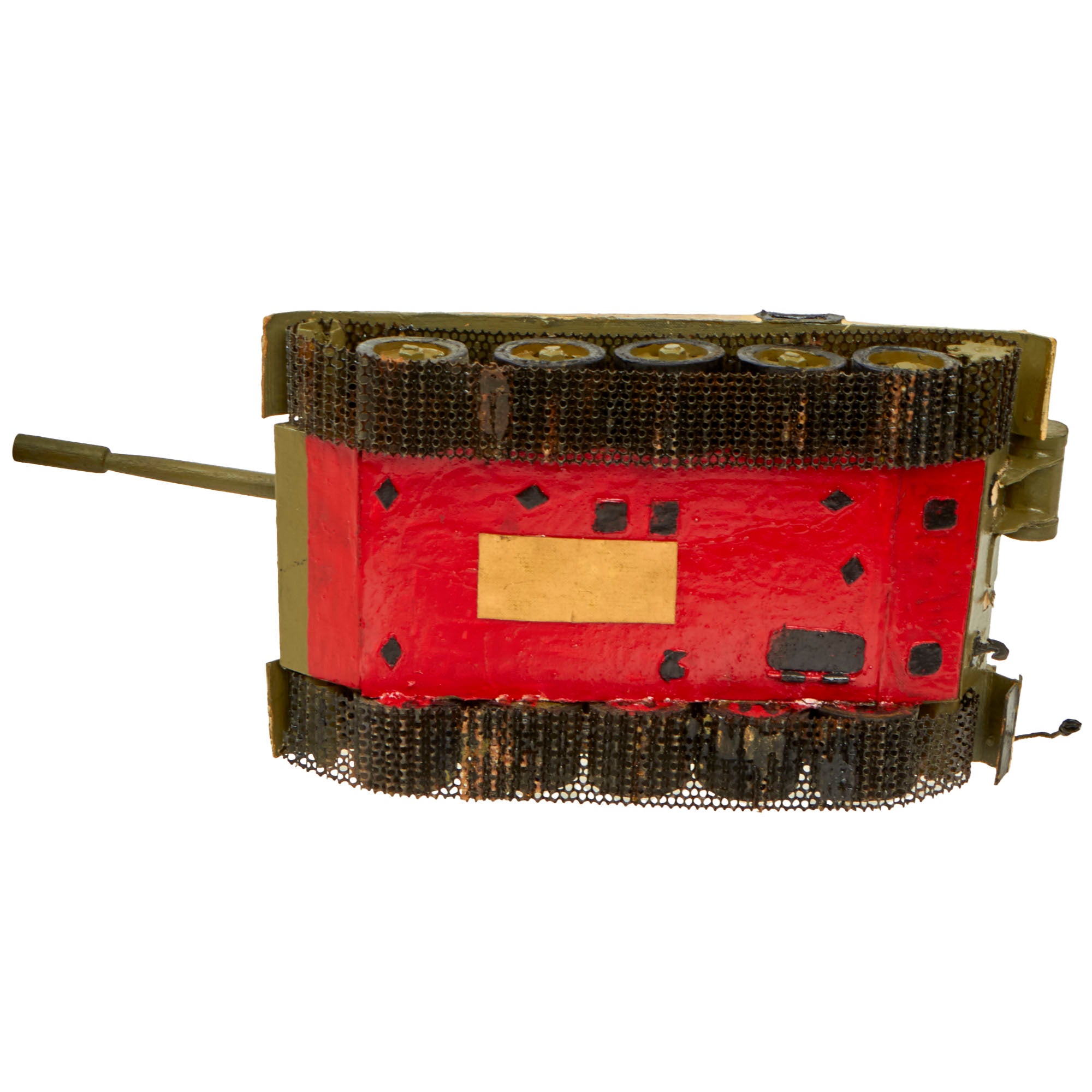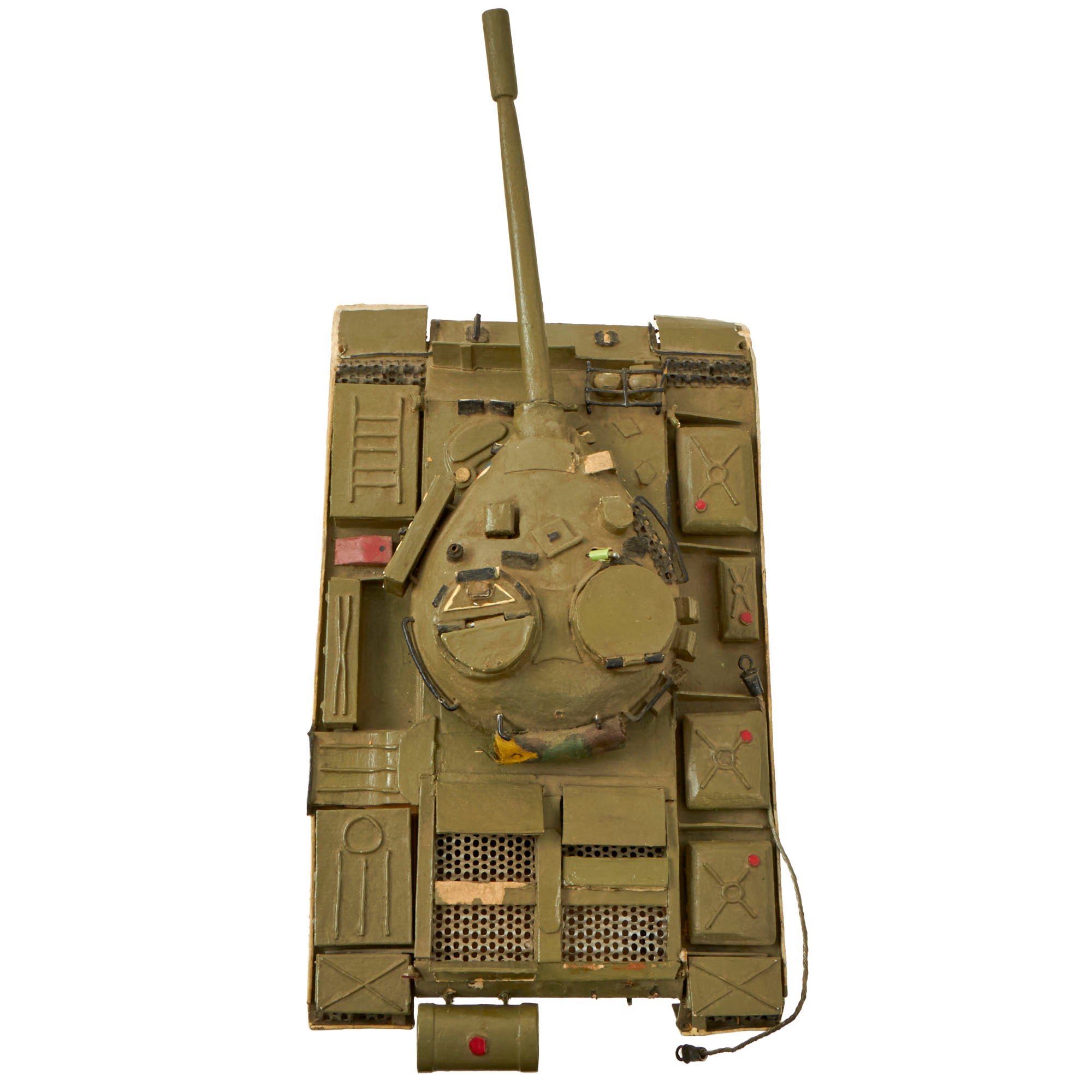 Original Item: Only One Available. This is an exceptional example of a meticulously crafted cardboard and wooden model of the famous Soviet (Czech) T-54/T-55 Main Battle tank. The attention to detail is impressive, as the tank is constructed using a combination of various types of scrap wood with cardboard, which adds a unique touch to the model. The overall design of the tank is mostly accurate and true to the original, with the machine guns still able to traverse and the whole "turret" portion able to rotate as well. The craftsmanship is remarkable, and it is evident that the creator took great care in every detail of the model, making it a true work of art. The body of the tank measures 10 1/2", and it is 14 1/2" in overall length when counting the 6" long barrel.
