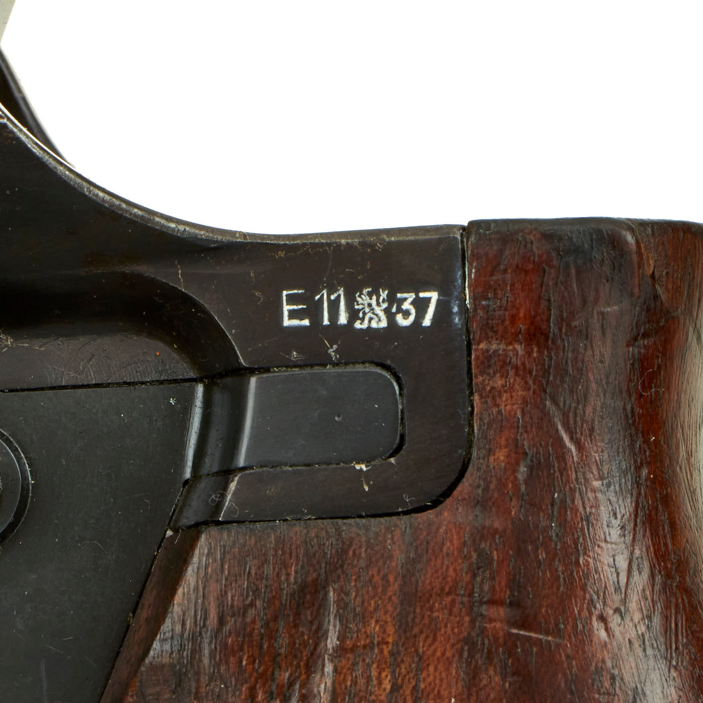This indicates manufacture at the Czechoslovakian state arms factory located in the capital of Prague. The left hand side of the frame is marked E 11 (LION) 37, for manufacturer in 1937, presumably in the 11th month of November.
