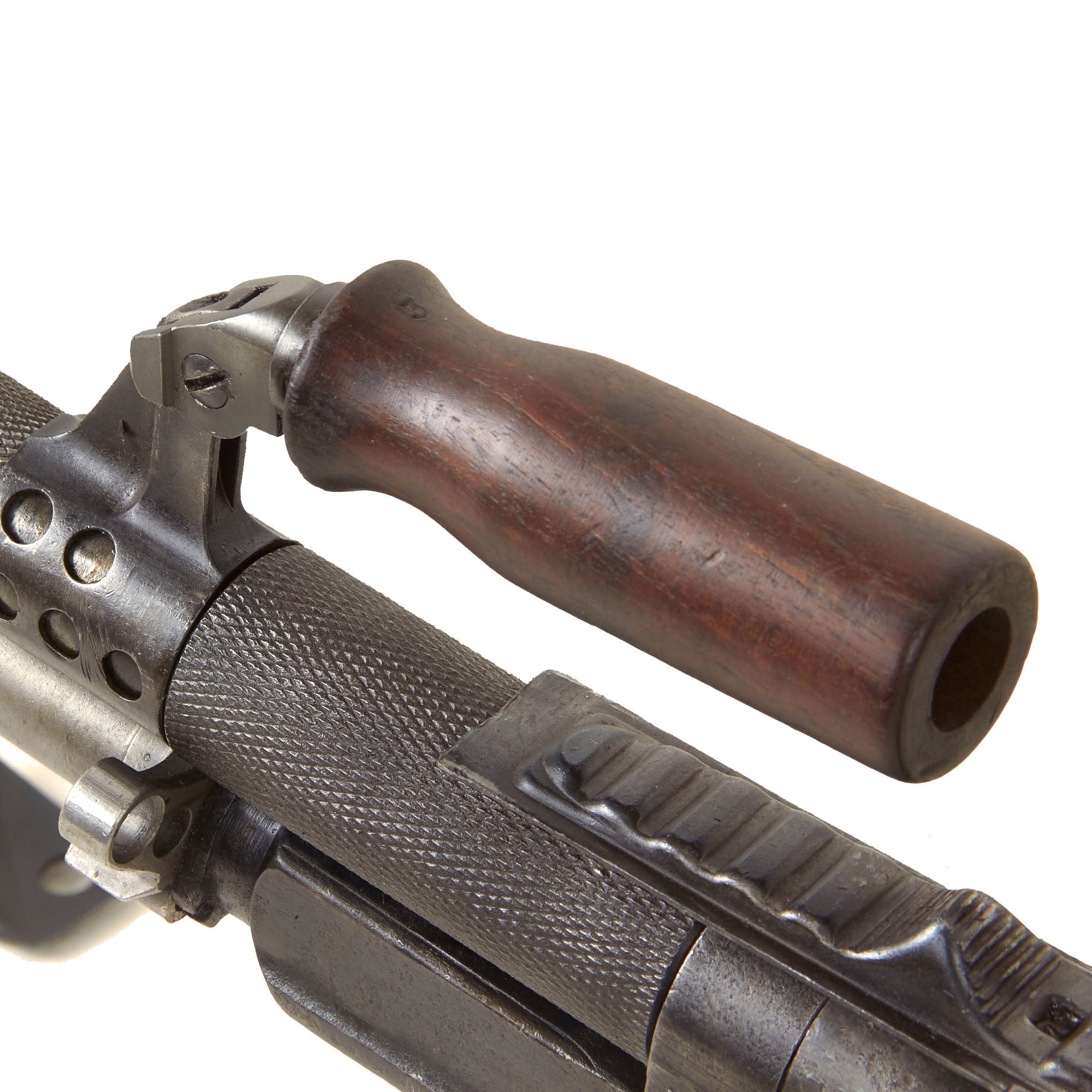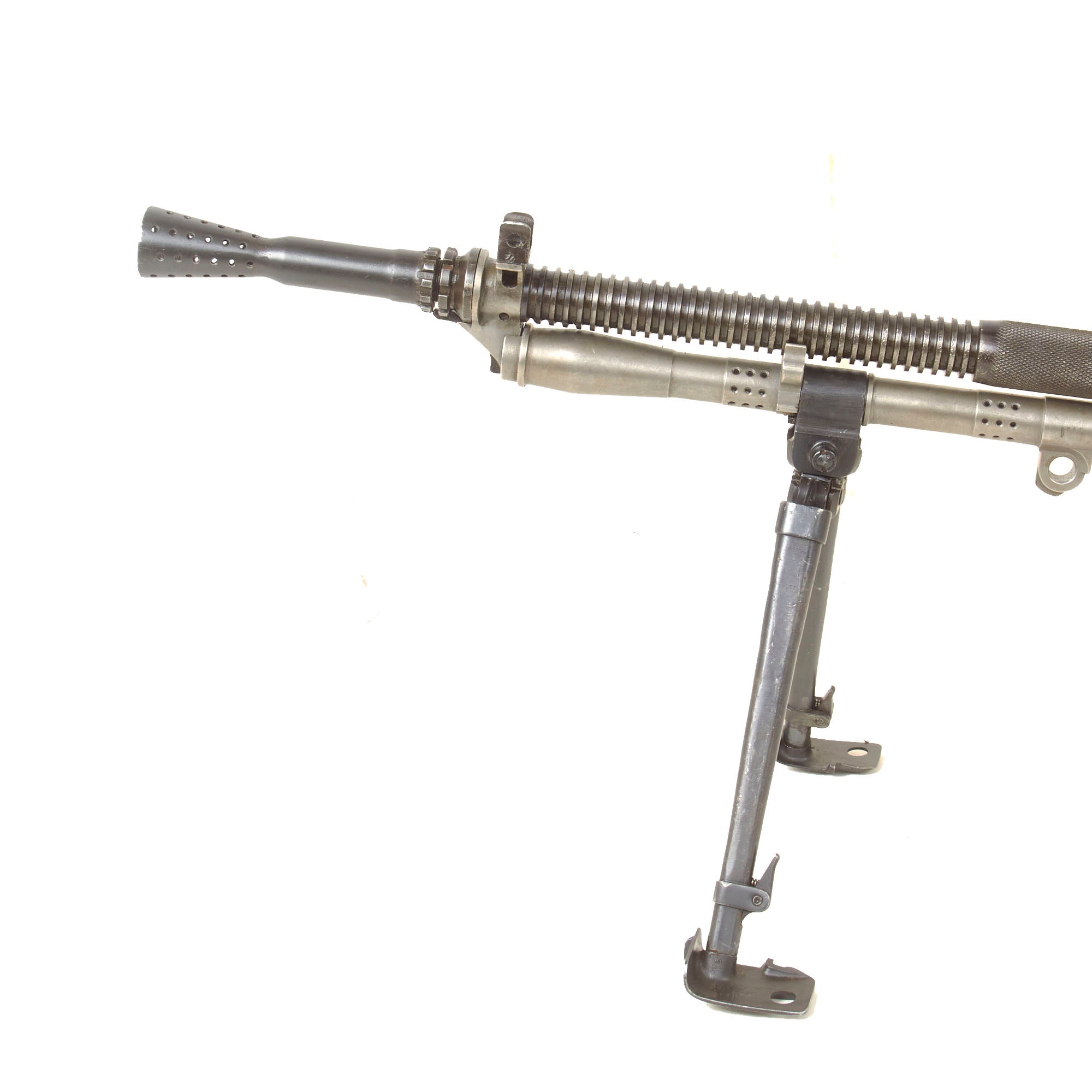 This is an original Czech Pre-WWII Yugoslavian Contract ZB-30J Display Machine Gun, fitted with an original demilled and re-welded finned barrel assembly. The display LMG is built using all original parts on an original BATF compliant non-firing display receiver, making this a 100% legal display Sub-Machine gun. This receiver was created by using portions of the original torch cut receiver, including the barrel bushing, combined with some new made steel portions. It has properly had a 25% section of the total length completely replaced entirely with solid steel bar stock. Meaning a 1/4 length section of the display receiver is solid steel, making this totally legal to own without a license of any kind. Every part on this display gun is original Pre-WWII manufacture other than 25% of the receiver replaced by solid steel (as required by BATF).