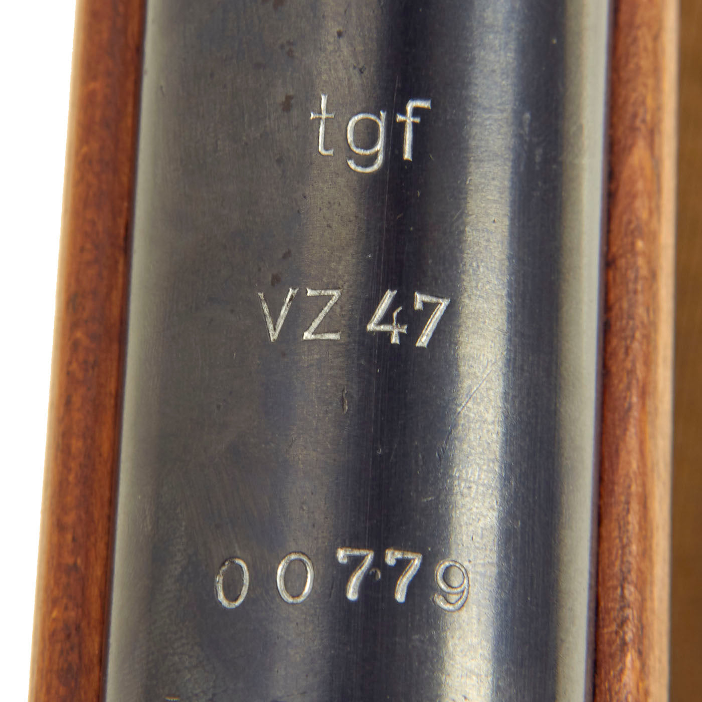This example has a serial number of 00779 stamped on the top of the receiver under the ‘tgf’ which indicates contract for the DDR (East Germany) by Zbrojovka Brno, a maker of small arms, light artillery, and motor vehicles in Brno, Czechoslovakia. It also made other products and tools, such as typewriters and early computers.